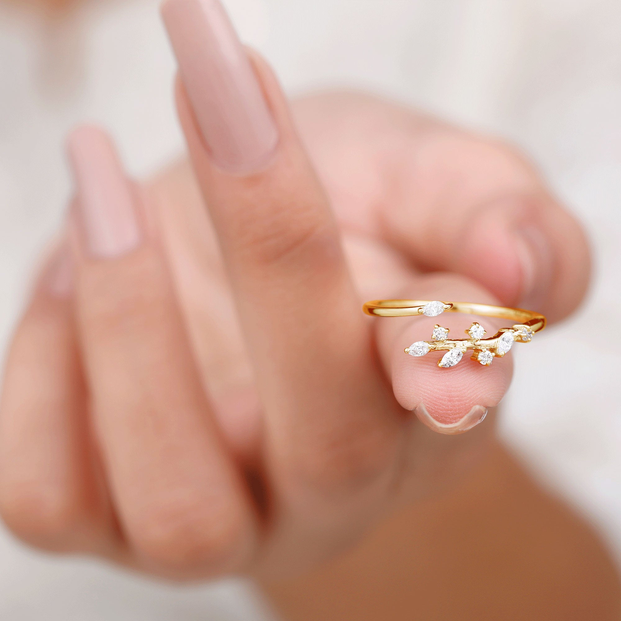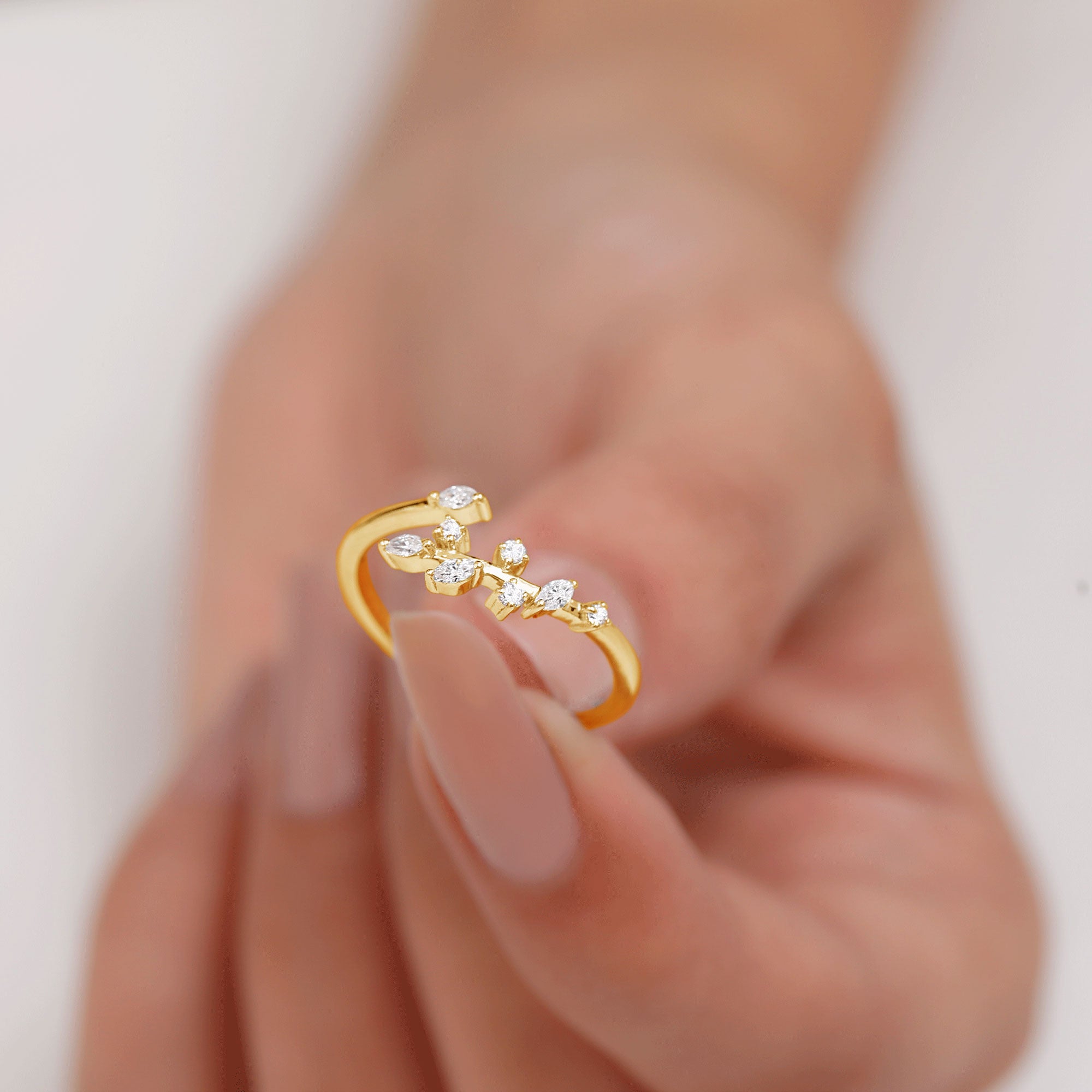 Embrace the elegance of nature with the Diamond Leaf Wrap Ring which features a delicate, intricately designed leaf motif that wraps gracefully around your finger. This ring showcases a stunning array of brilliant-cut Marquise and Round Diamonds, meticulously set to catch and reflect light with every movement. The leaf design, inspired by the timeless beauty of nature, is enchanting and sophisticated. Each diamond has its sparkle, ensuring a dazzling statement of refined taste and style. Perfect for celebrating a special occasion or simply adding a touch of luxury to your everyday look, this Promise Ring for Her combines artistry with craftsmanship. Its versatile design makes it an ideal choice for both elegant evening wear and casual chic outfits. Make a statement of enduring beauty with this enchanting Ruby Ring Enhancer that embodies the grace and splendor of nature’s finest creations.