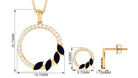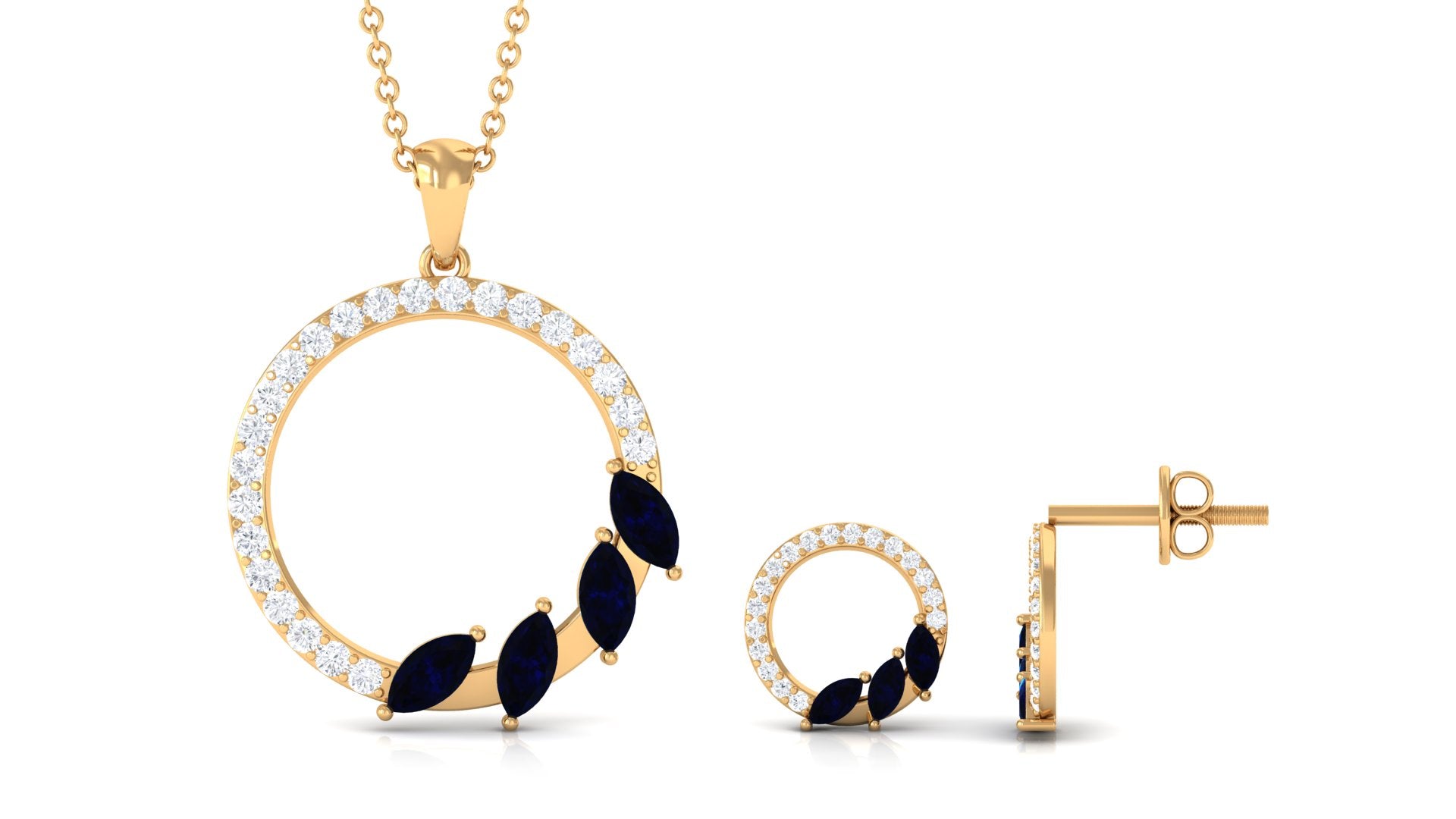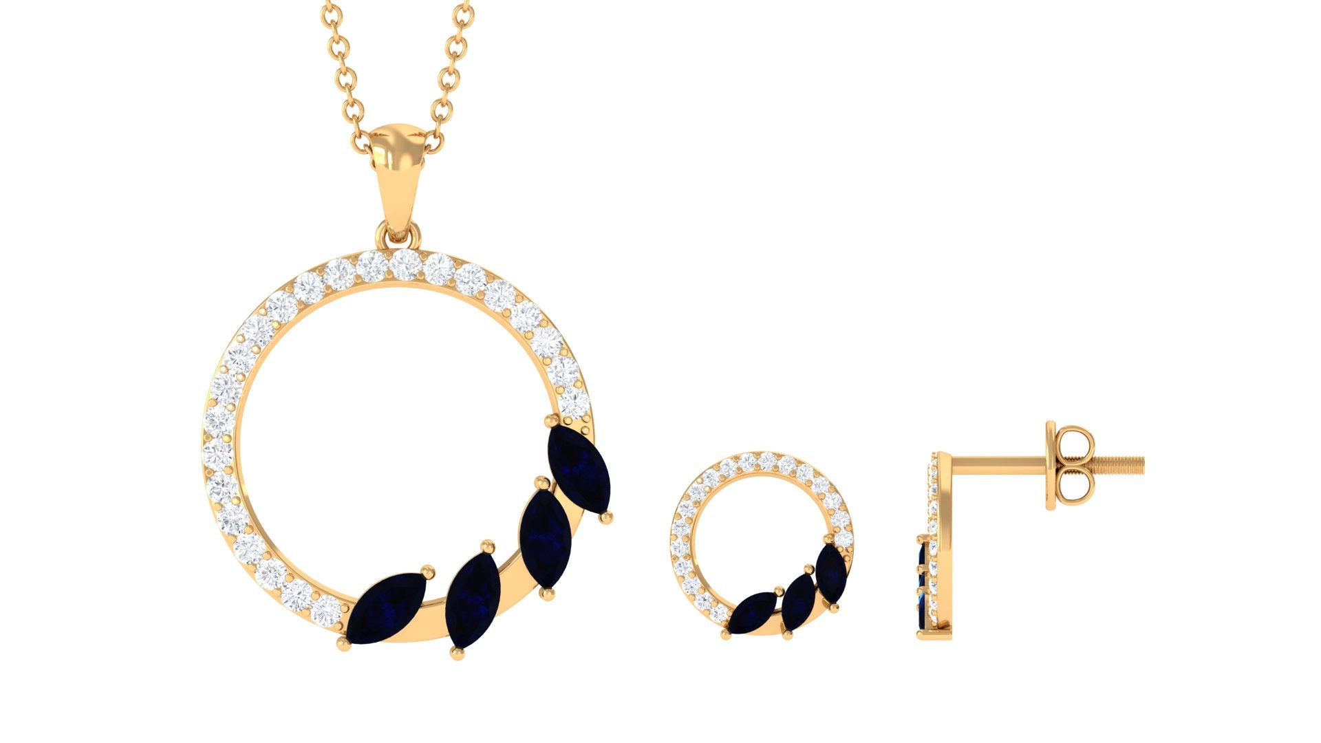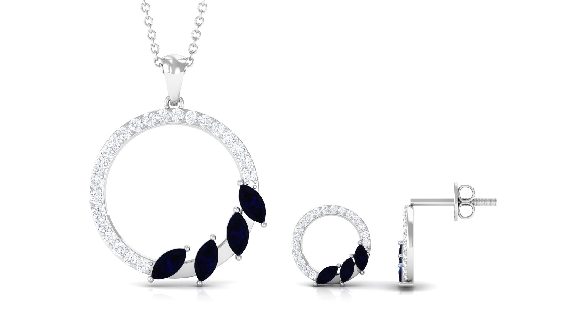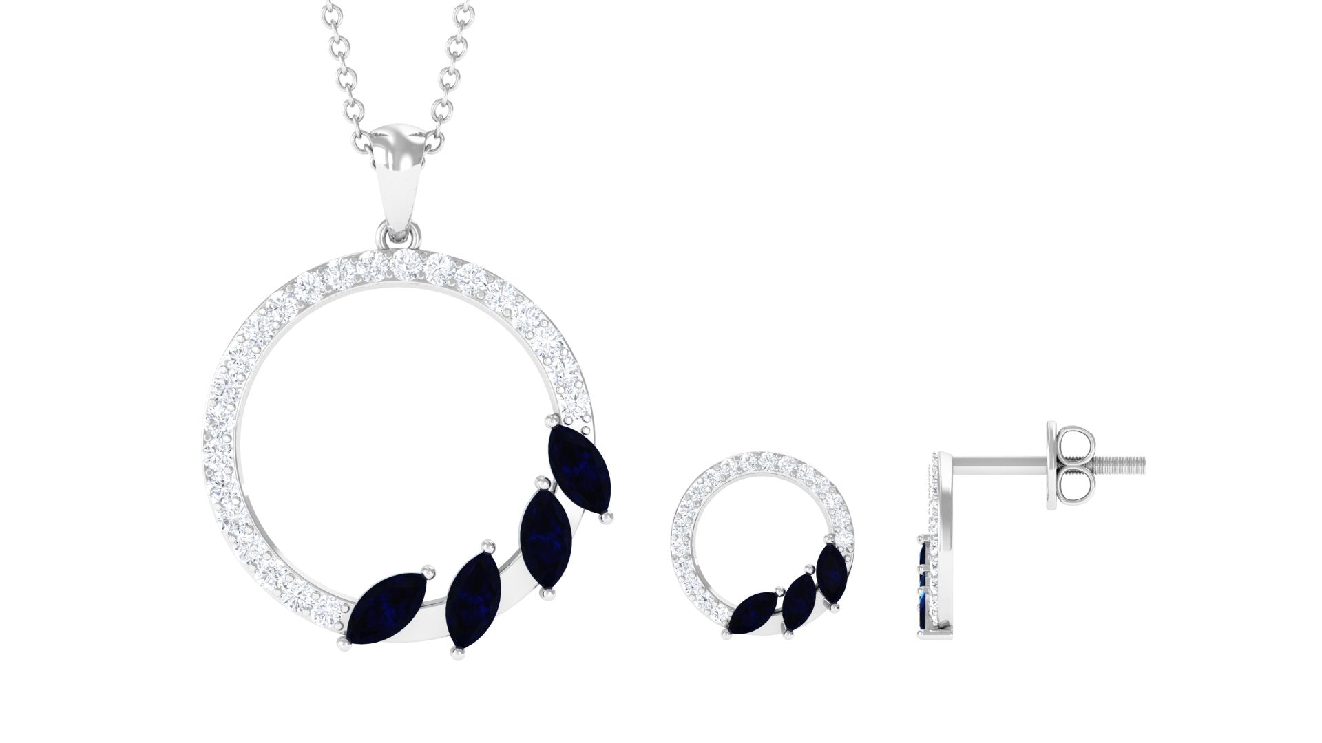 Representing timeless love and eternal togetherness, this jewelry set showcases an open circle studded with round Diamond and marquise cut blue sapphire that resembles the beauty of a delicate leaf. The bridal set consists of an eternity necklace pendant and a matching earring pair. Together they exude a sublime elegance and can be considered as a great option for your life important milestone occasions. It comes with a plethora of metal options, allowing you to create a jewelry set that is truly you. Additional highlights of this jewelry set are a necklace chain and screw back earring closures that keep it secured through the day and night.