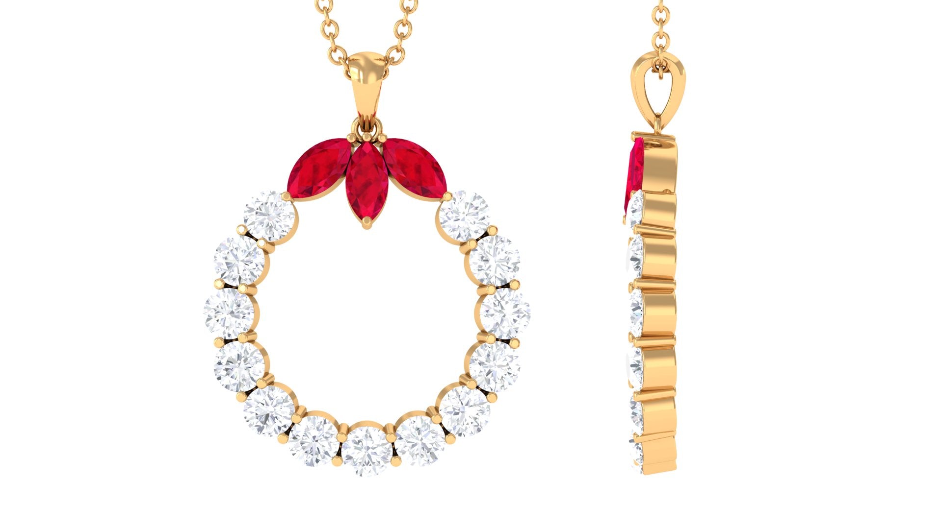 Spruce up your look in a jiffy with this gleaming drop pendant that showcases round moissanite in a continuous loop and three marquise shape created ruby at its base. It exhibits an extraordinary display of sparkle and brilliance that draws the eye without much effort. Linked to a metal bale, the eternity pendant necklace is symbolic of the love that survives the toughest of times.
