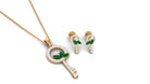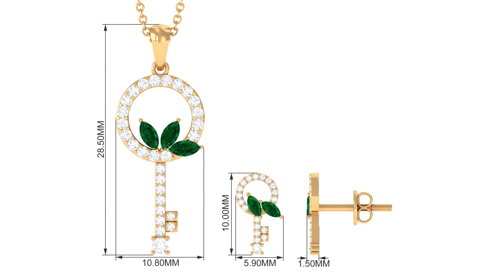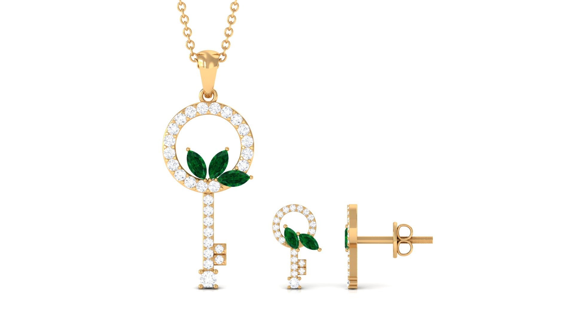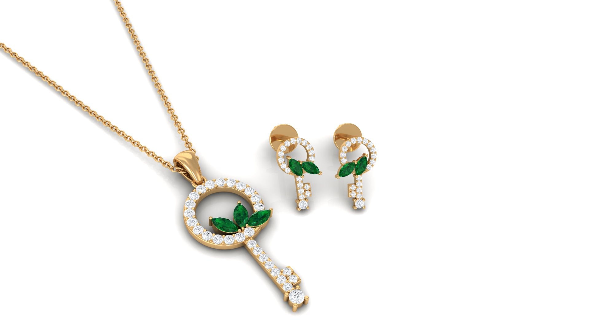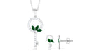 Unlock the doors of a life filled with delightful and magical moments with this glistening key jewelry set that includes a pendant necklace and a matching earring pair. Dangling from a simple bale is an ornate key embellished with round Diamond and marquise shape emerald in prong setting. The matching earrings emulate the same design and complete the jewelry set that has the right amount of sparkle. Wear it as a statement piece or a piece that is your ultimate fashion savior, either way, you will very much love flaunting it.