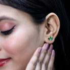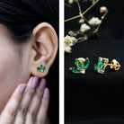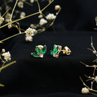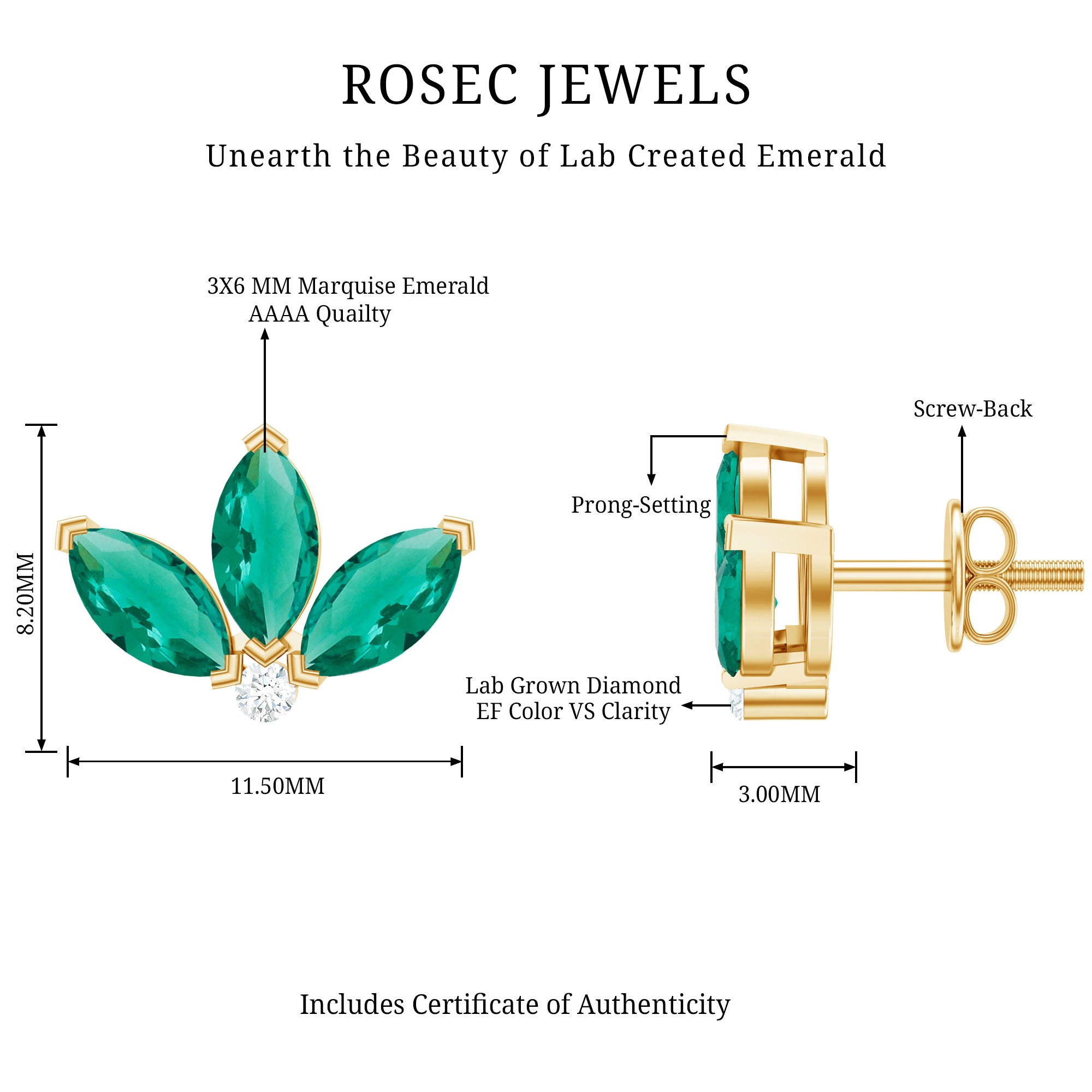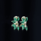 Add a touch of nature inspired beauty to your everyday style with these elegant Leaf Stud Earrings. Carefully crafted in yellow gold plated sterling silver, these Lab Grown Emerald Earrings are designed to bring a graceful look that is perfect for any occasion. The design features 3X6 MM marquise cut lab created emeralds set in prong setting in a beautiful leaf pattern. At the base of the emerald trio, a small round lab grown diamond adds the perfect amount of sparkle. The contrast between the deep green emeralds and the clear diamond creates a striking, balanced look. Finished with screw backs, these Emerald and Diamond Earrings are made for comfortable wear all day long. The screw back design ensures they stay in place, making them a smart choice for daily use or special occasions. These Leaf Earrings are perfect for someone who loves subtle luxury and finds inspiration in nature. With lab created stones and thoughtful craftsmanship, this pair is also an eco-conscious choice, beautiful in both design and purpose. Great as a gift or a personal treat, these Studs come beautifully packaged and ready to be cherished for years to come.