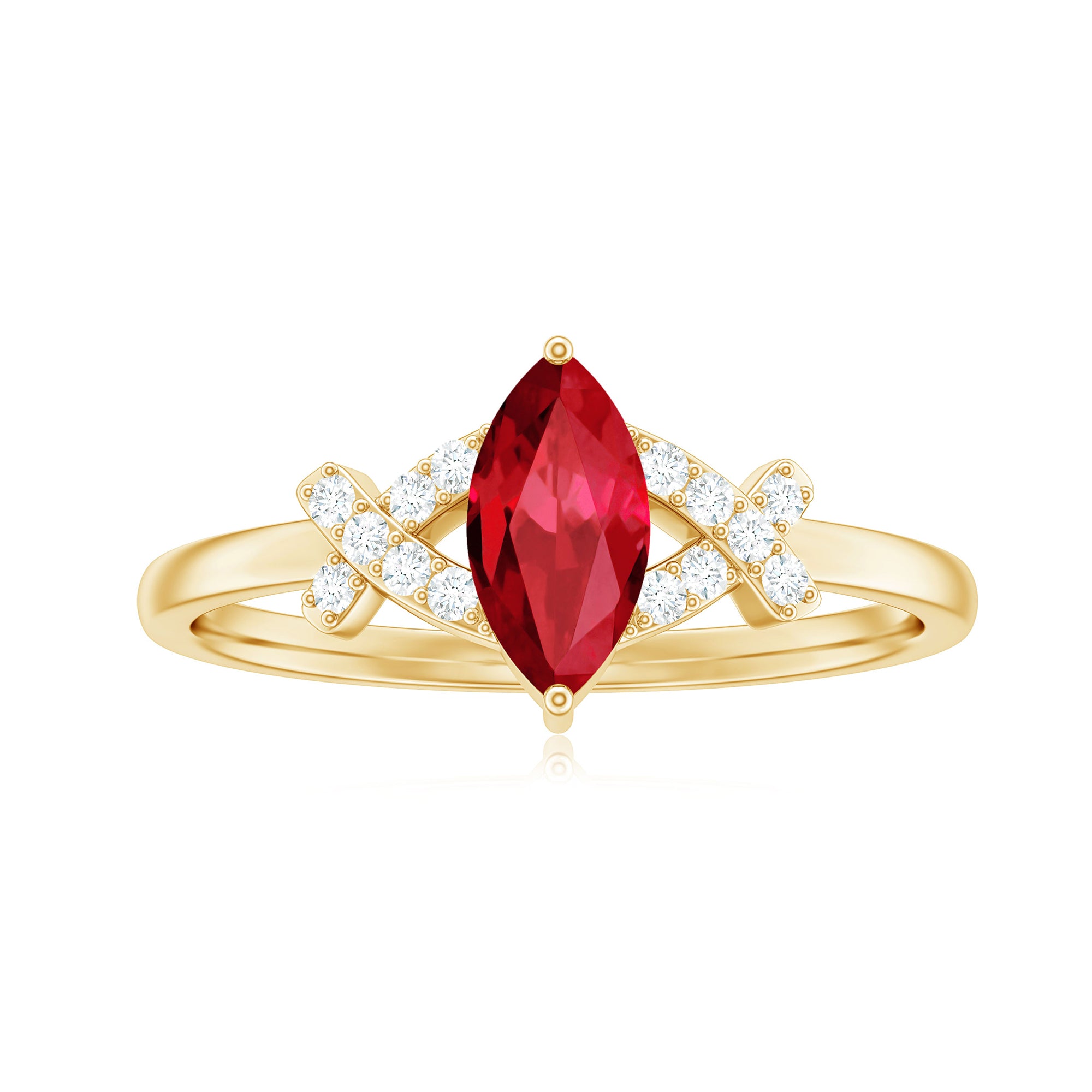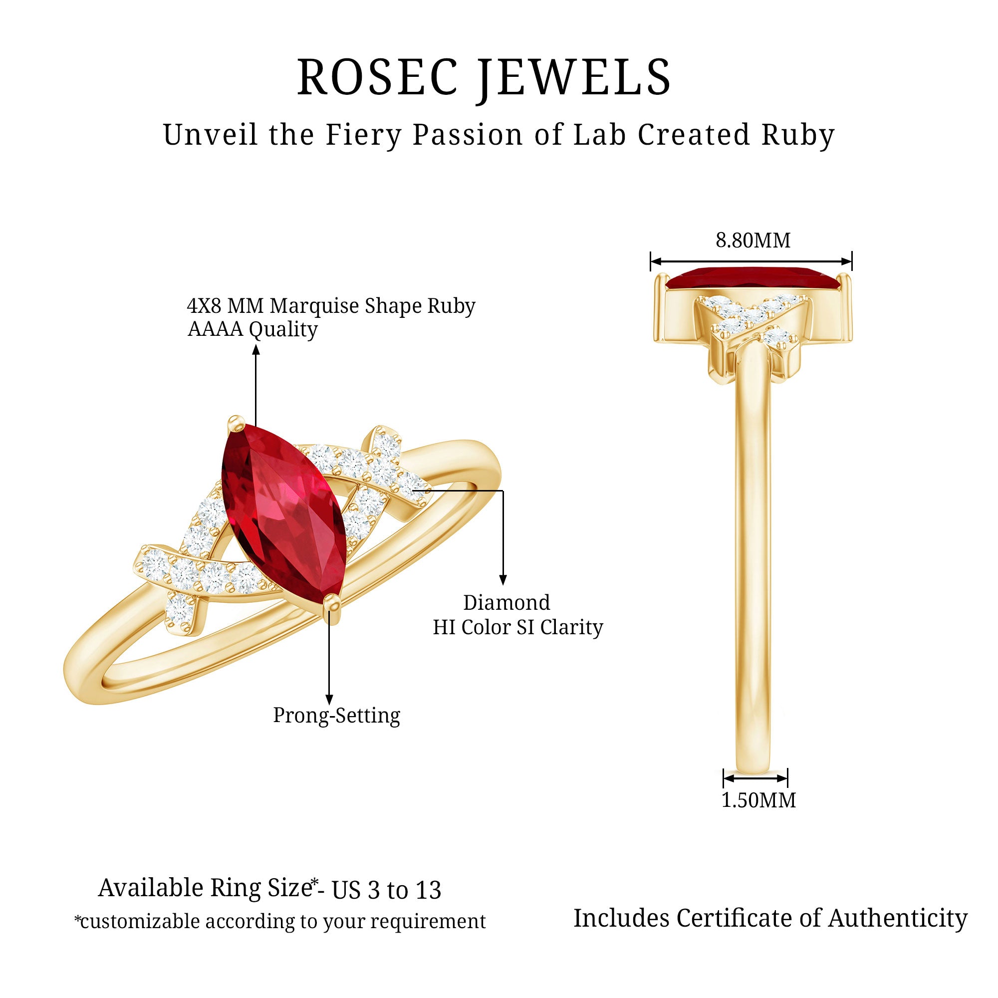 Turn your special moment into something unforgettable with this stunning Marquise Engagement Ring, designed to shine with love and elegance. At the center of the Designer Ring sits a beautiful 4X8 MM marquise cut lab created ruby, held securely in 2-prong setting, allowing it to catch the light perfectly and stand out as the star of the piece. The band features a stylish split shank design that is covered in sparkling diamonds, adding brilliance from every angle. This detail not only enhances the beauty of the ruby but also gives the Solitaire Engagement Ring a modern and graceful touch. Every sparkle from the diamonds complements the rich red hue of the ruby, creating a look that is both timeless and fresh. Perfect for someone who loves elegance with a touch of uniqueness, this Ruby and Diamond Engagement Ring blends classic romance with a contemporary design. It is crafted with care and attention to detail, offering comfort and durability for everyday wear while still feeling luxurious and special. Available in various sizes and beautifully packed in an elegant jewelry box, it is ready to gift and sure to bring a bright smile to the one who means everything to you.