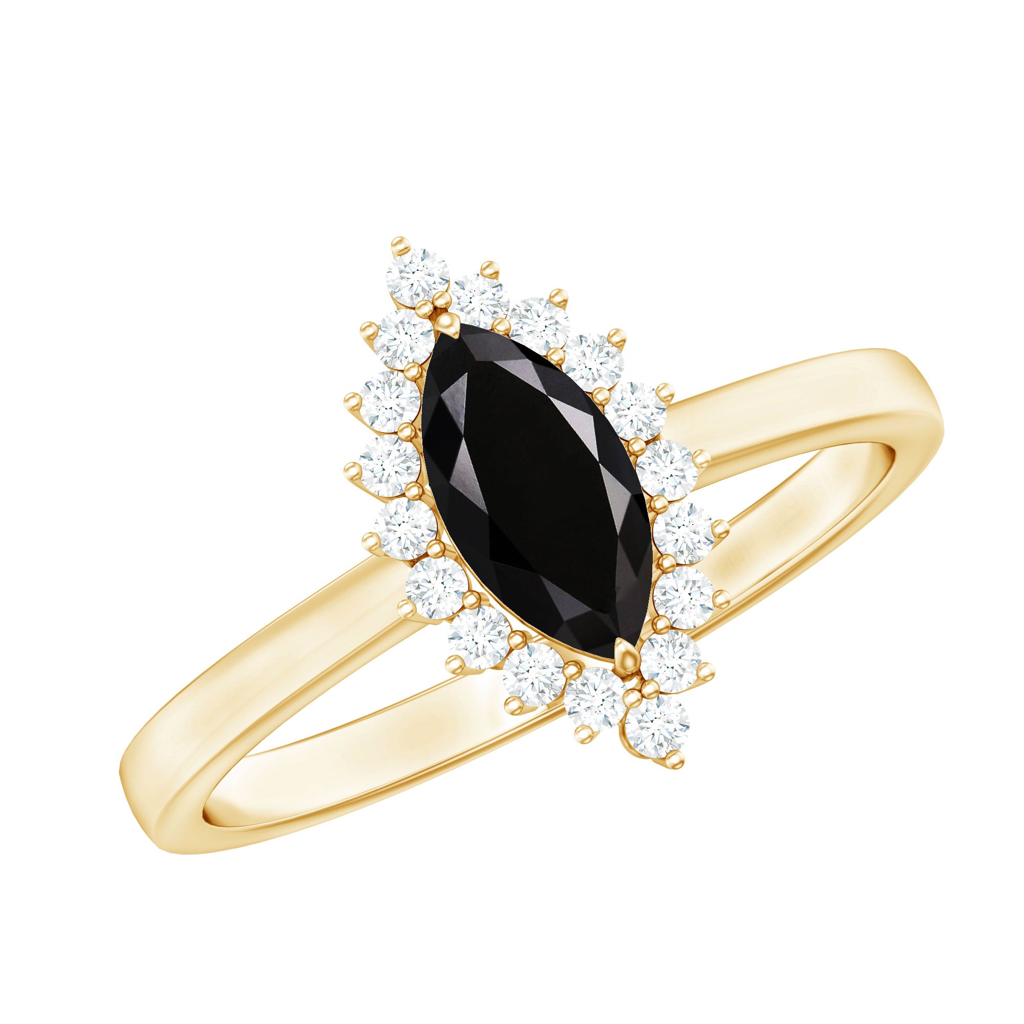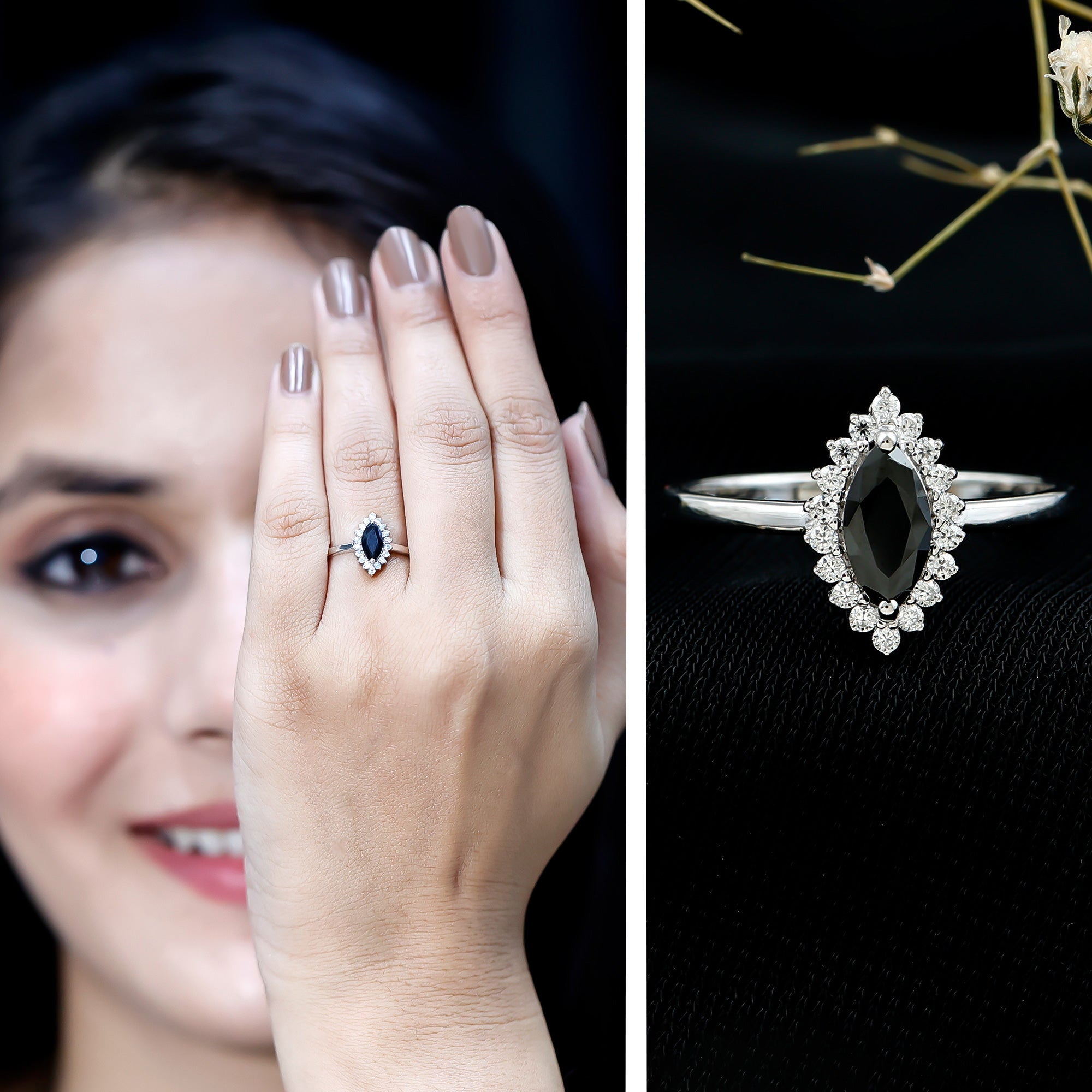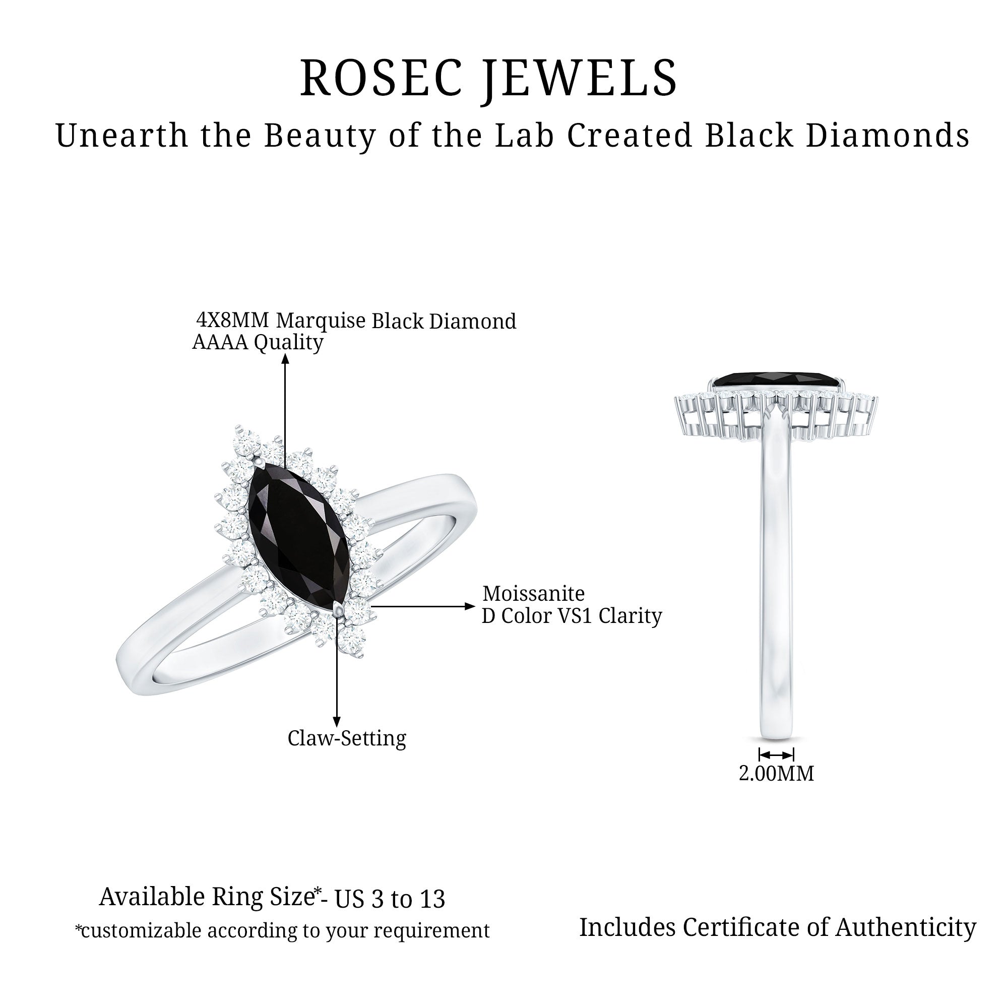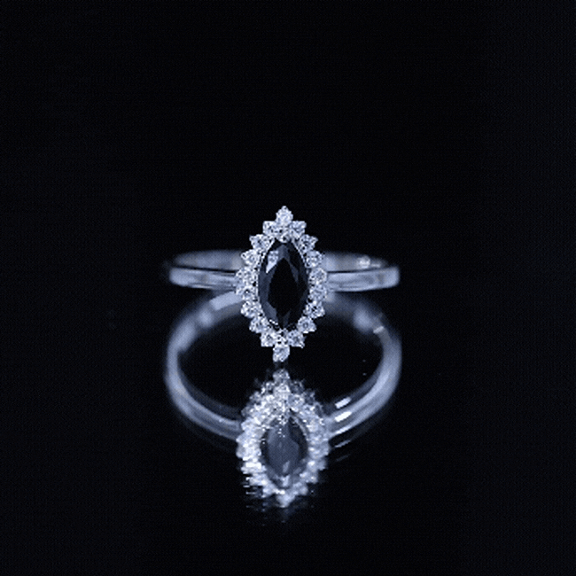 It is a Halo Ring consisting of Marquise Cut Created Black Diamond as a Solitaire embellished in Prong Setting with round shape Moissanite as Halo embellished in Prong Setting.