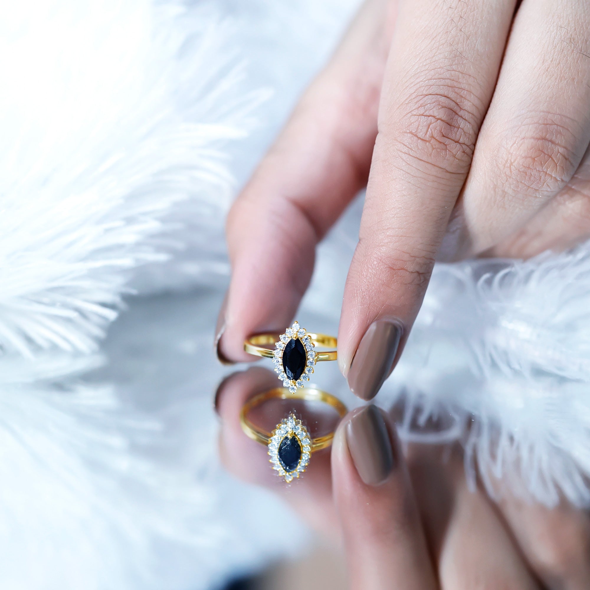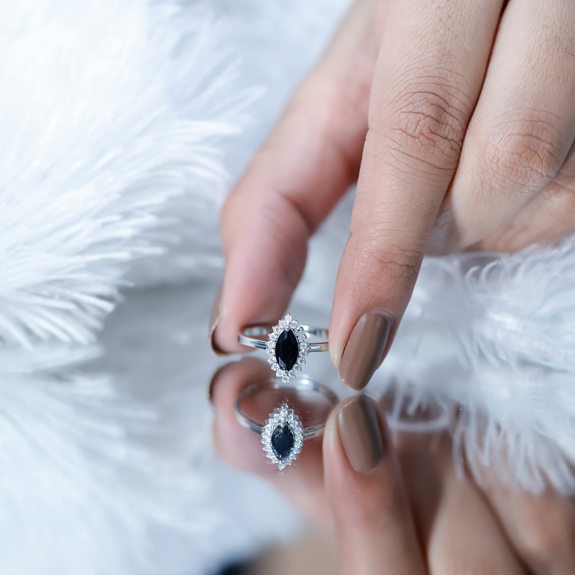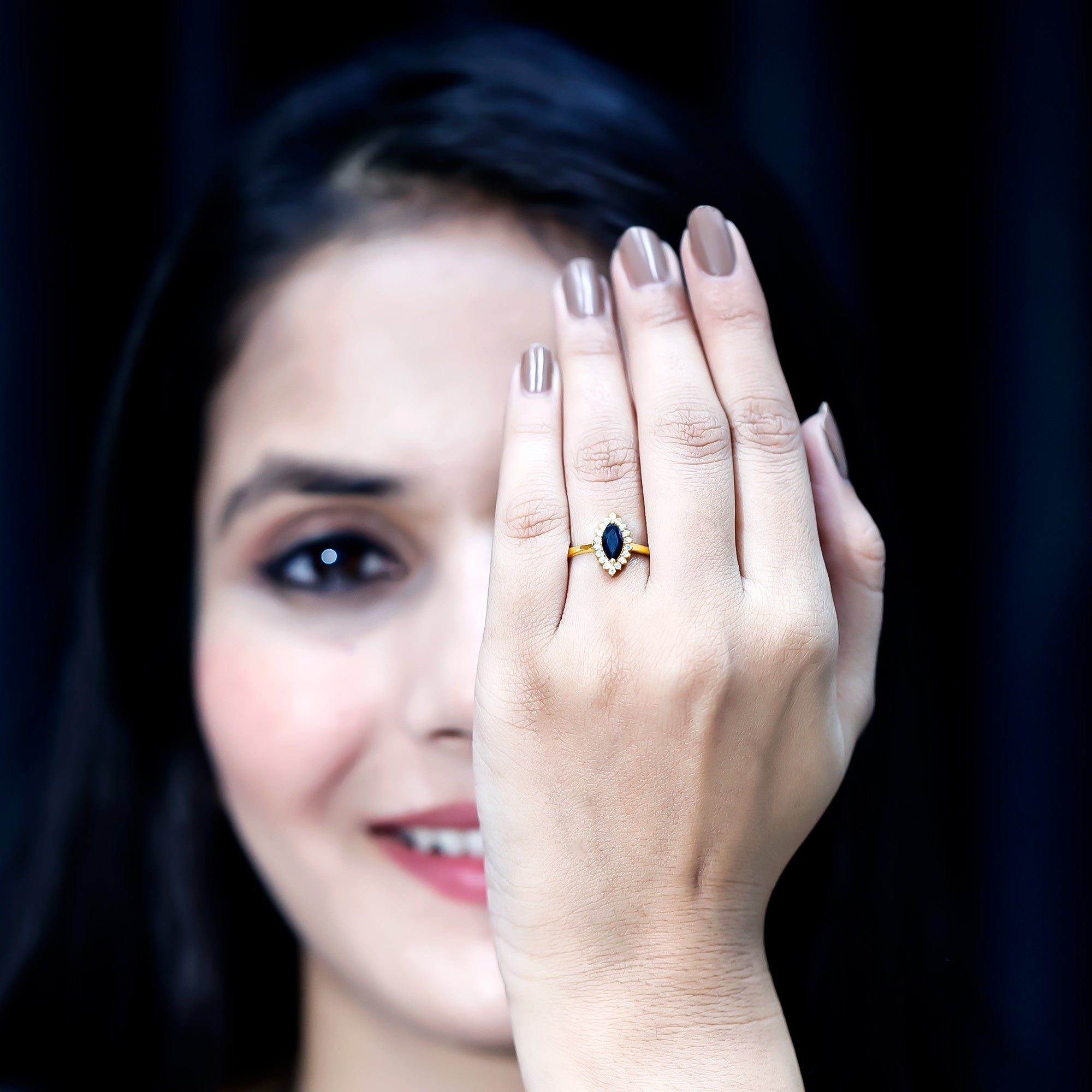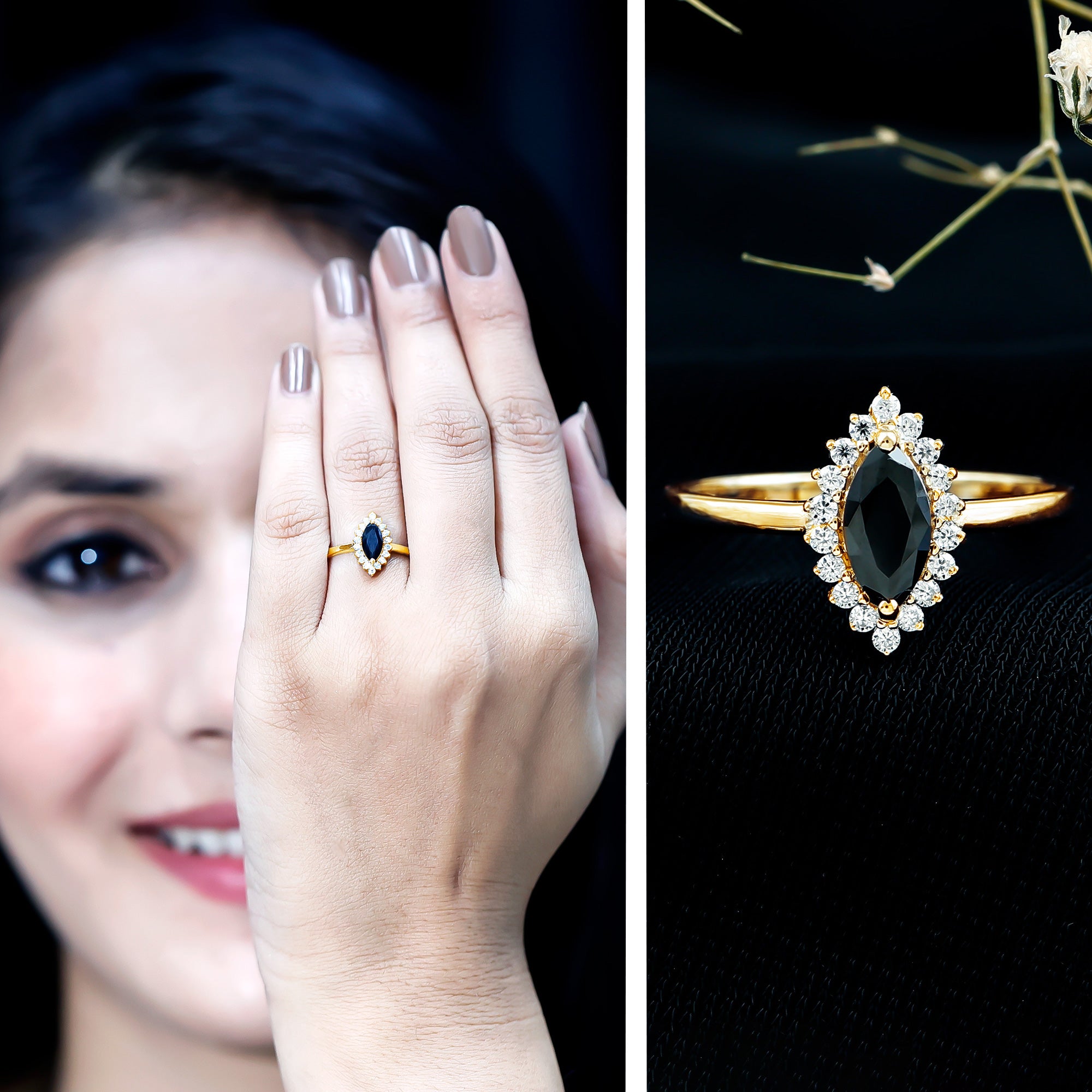 It is a Halo Ring consisting of Marquise Cut Created Black Diamond as a Solitaire embellished in Prong Setting with round shape Moissanite as Halo embellished in Prong Setting.