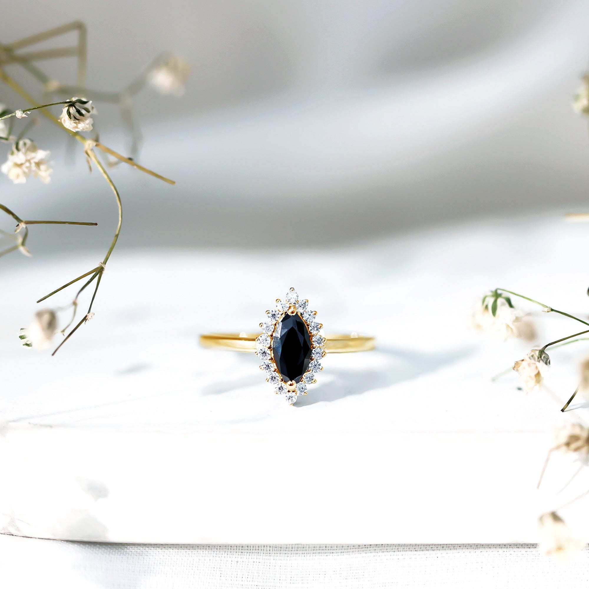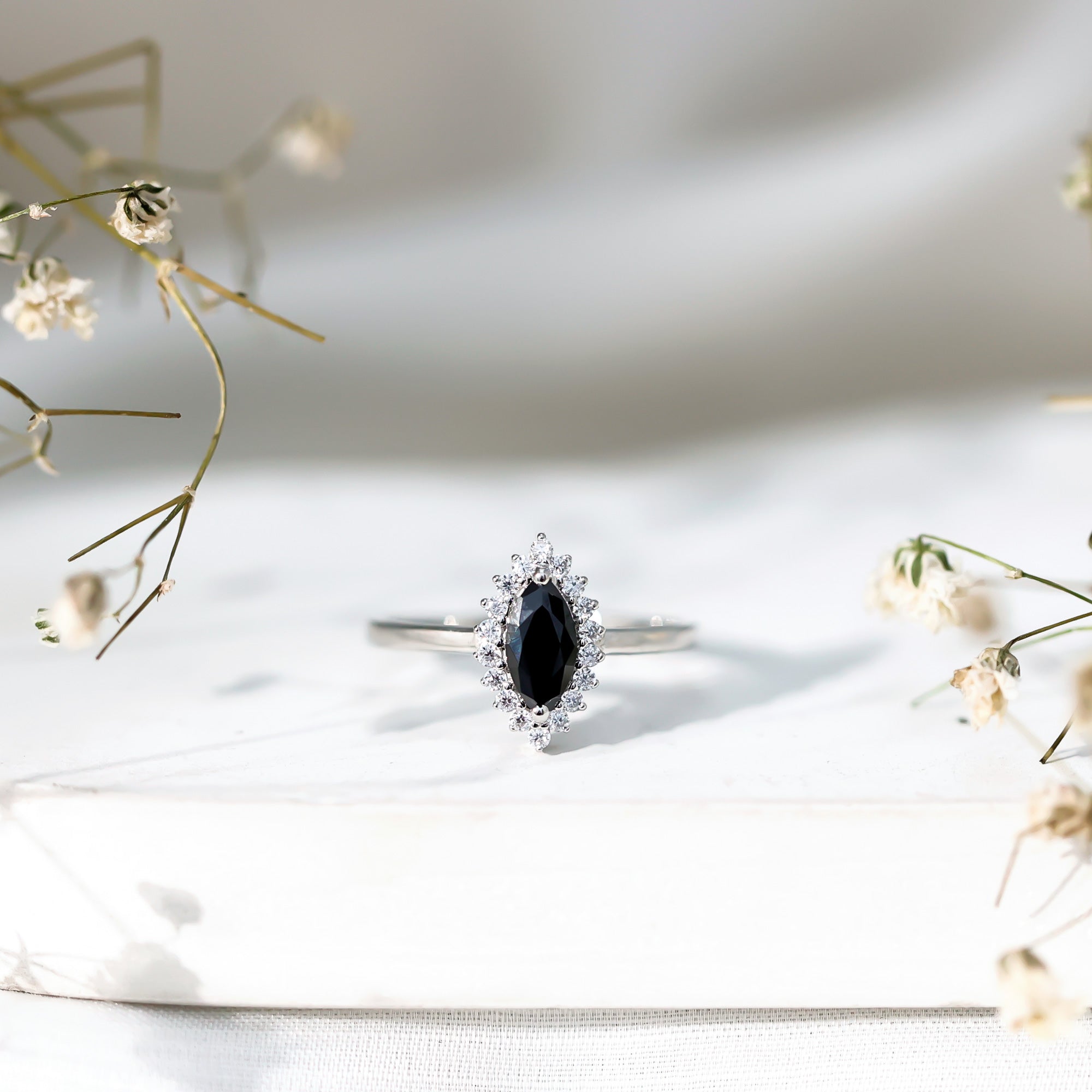 Marquise Cut Lab Grown Black Diamond Ring with Moissanite Halo