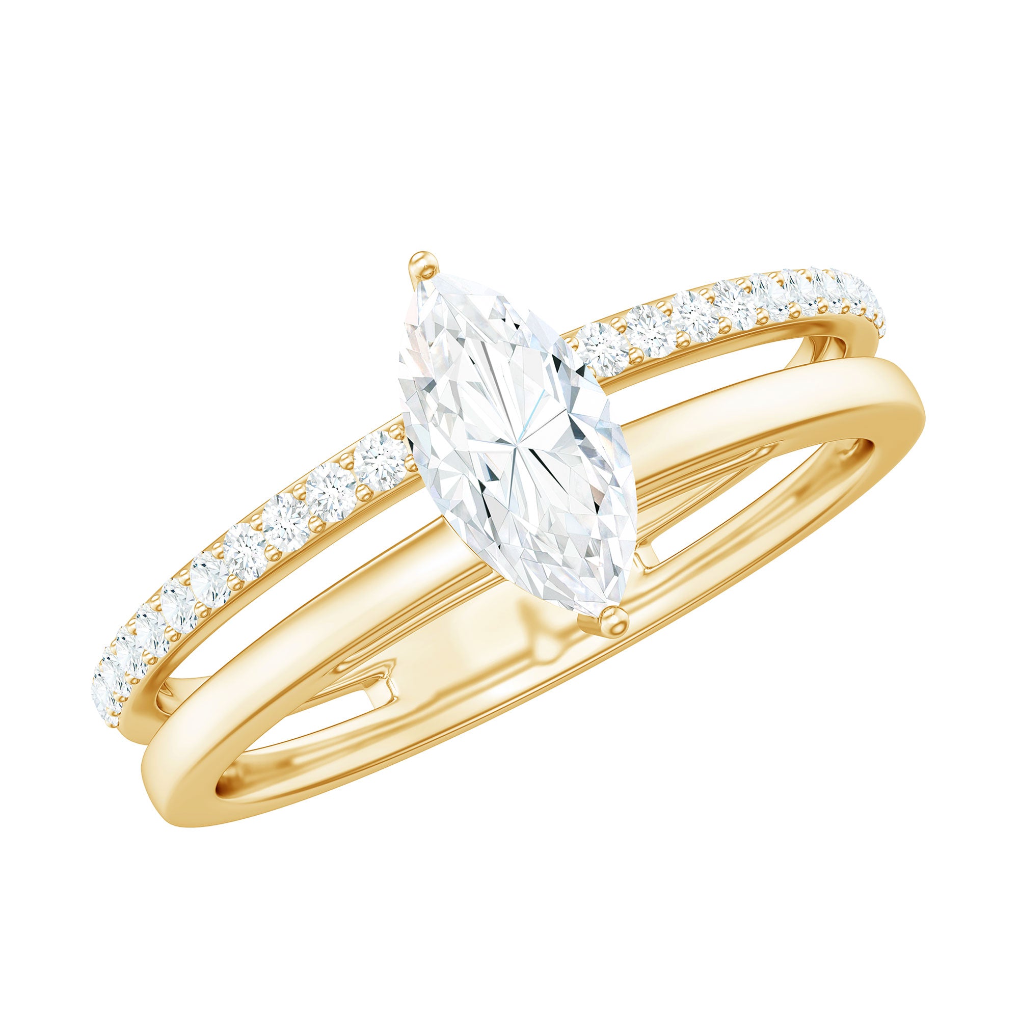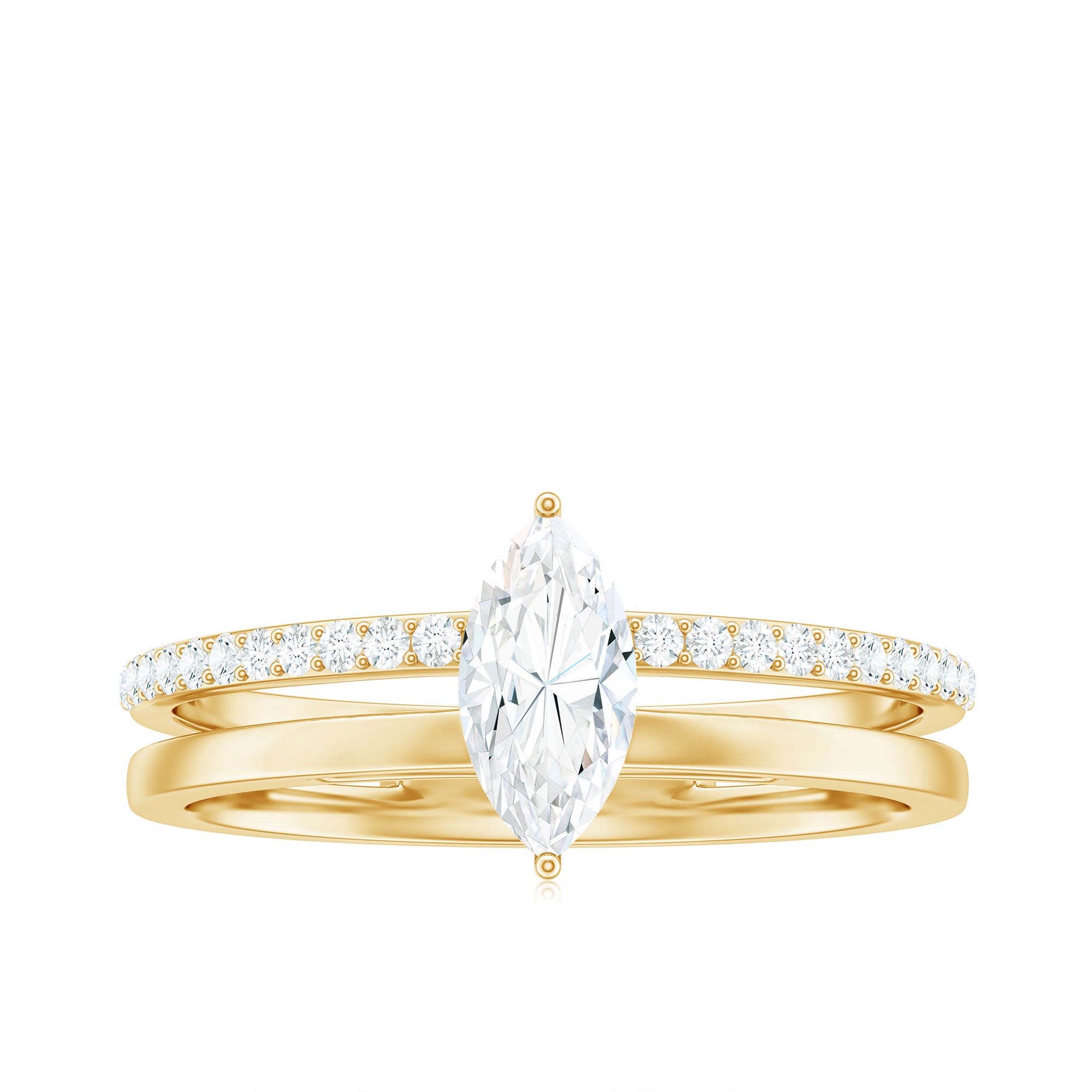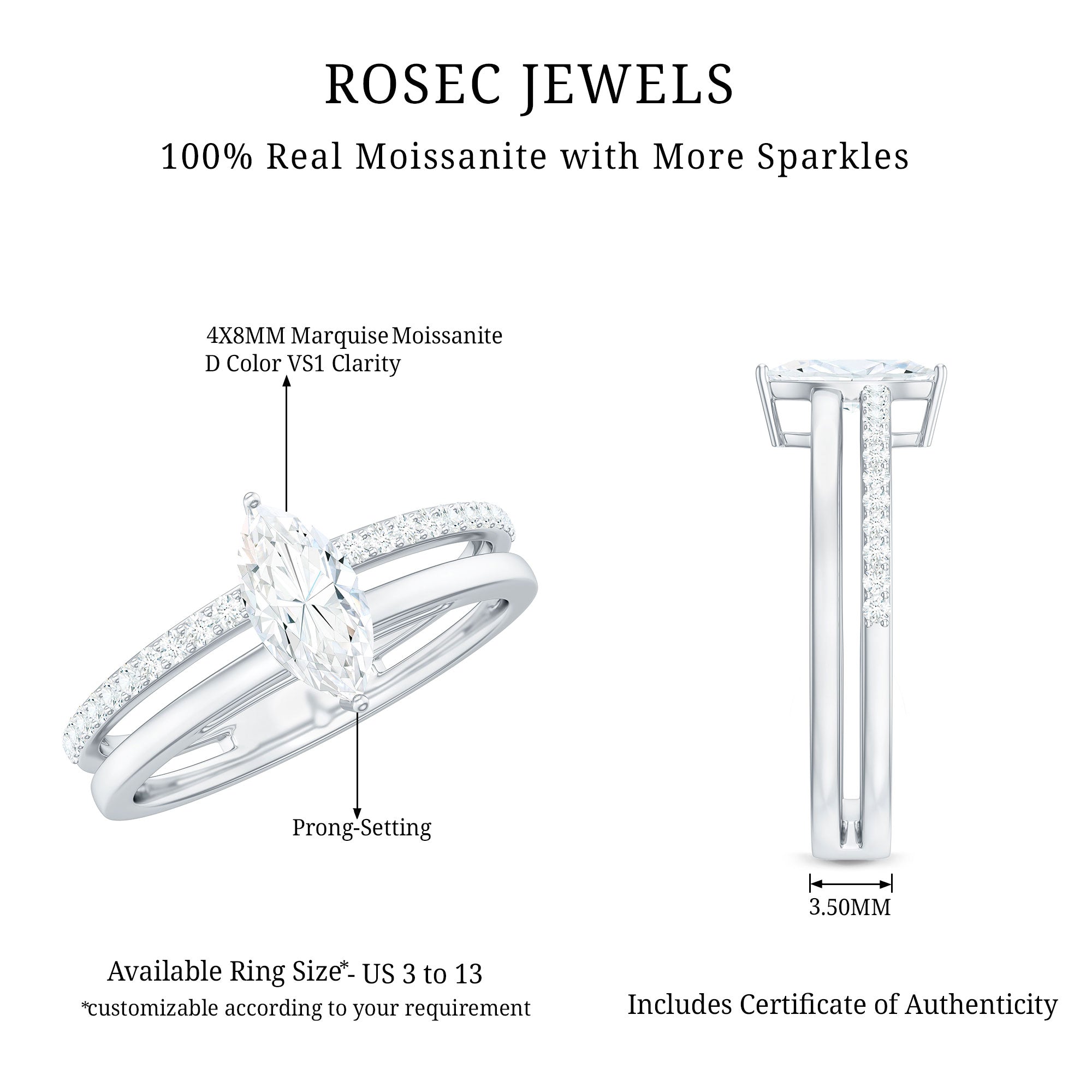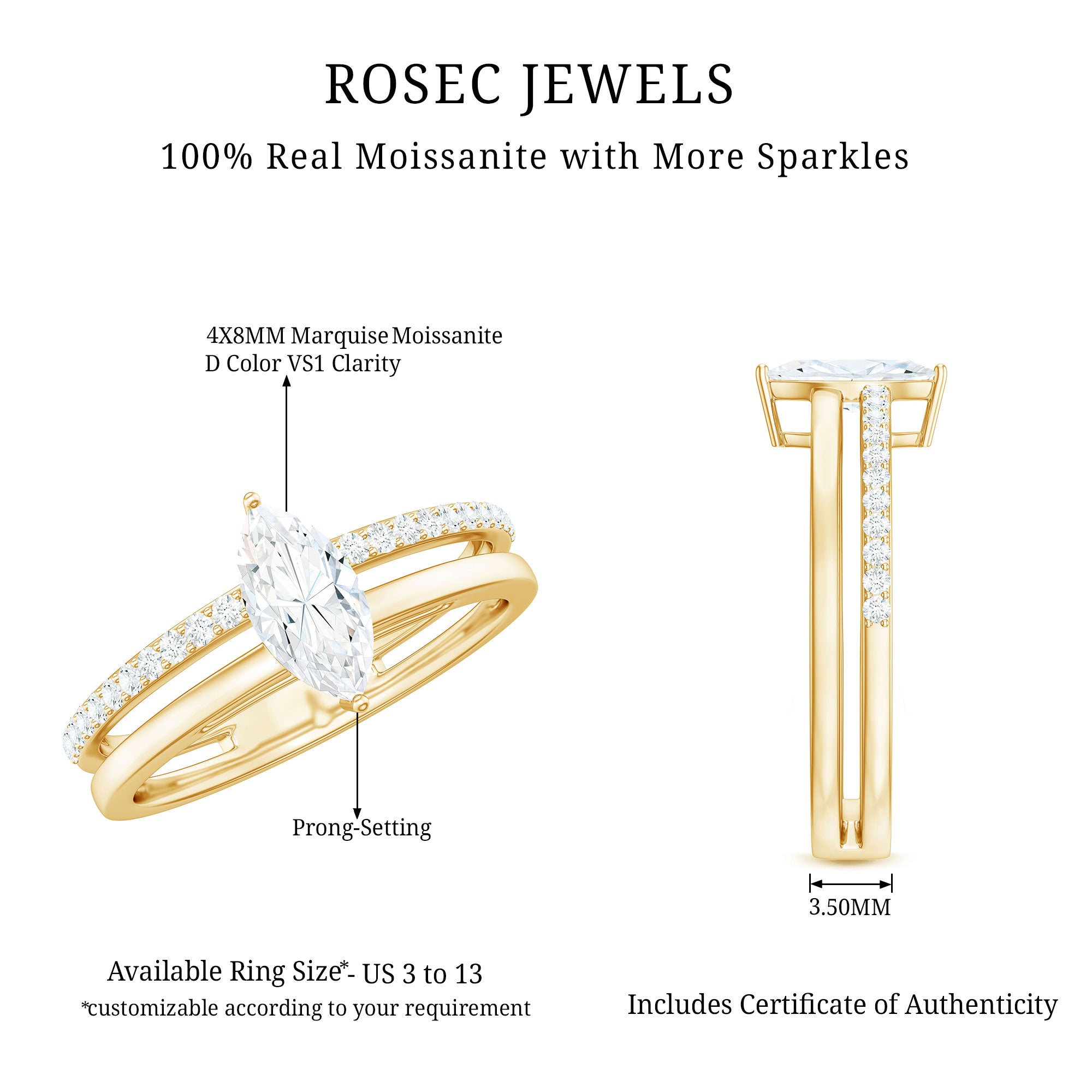 Elegant and full of romance, this Marquise Engagement Ring is a stunning symbol of love and commitment. At the center shines a brilliant 4x8 MM marquise cut moissanite, securely held in prong setting that allows light to reflect from every angle, creating a beautiful sparkle that is hard to miss. Adding to its charm, the double band is adorned with shimmering round moissanite stones that perfectly complement the center gem. This Double Band Engagement Ring features a graceful design, giving it depth, style, and a modern twist on a timeless look. A powerful and meaningful symbol of your journey ahead, this unique detail symbolizes the union of two hearts and two lives. The brilliance of the side stones enhances the center gem, making the entire Moissanite Engagement Ring shine with elegance and beauty. Every element is handcrafted with care, bringing out the best in each stone and giving the ring a high-end, refined finish. Ideal for proposals, anniversaries, or significant celebrations, this Designer Moissanite Ring transcends mere jewelry, it serves as a timeless symbol of love, commitment, and devotion. Whether it is worn every day or reserved for special events, it remains a piece that consistently makes an impression.