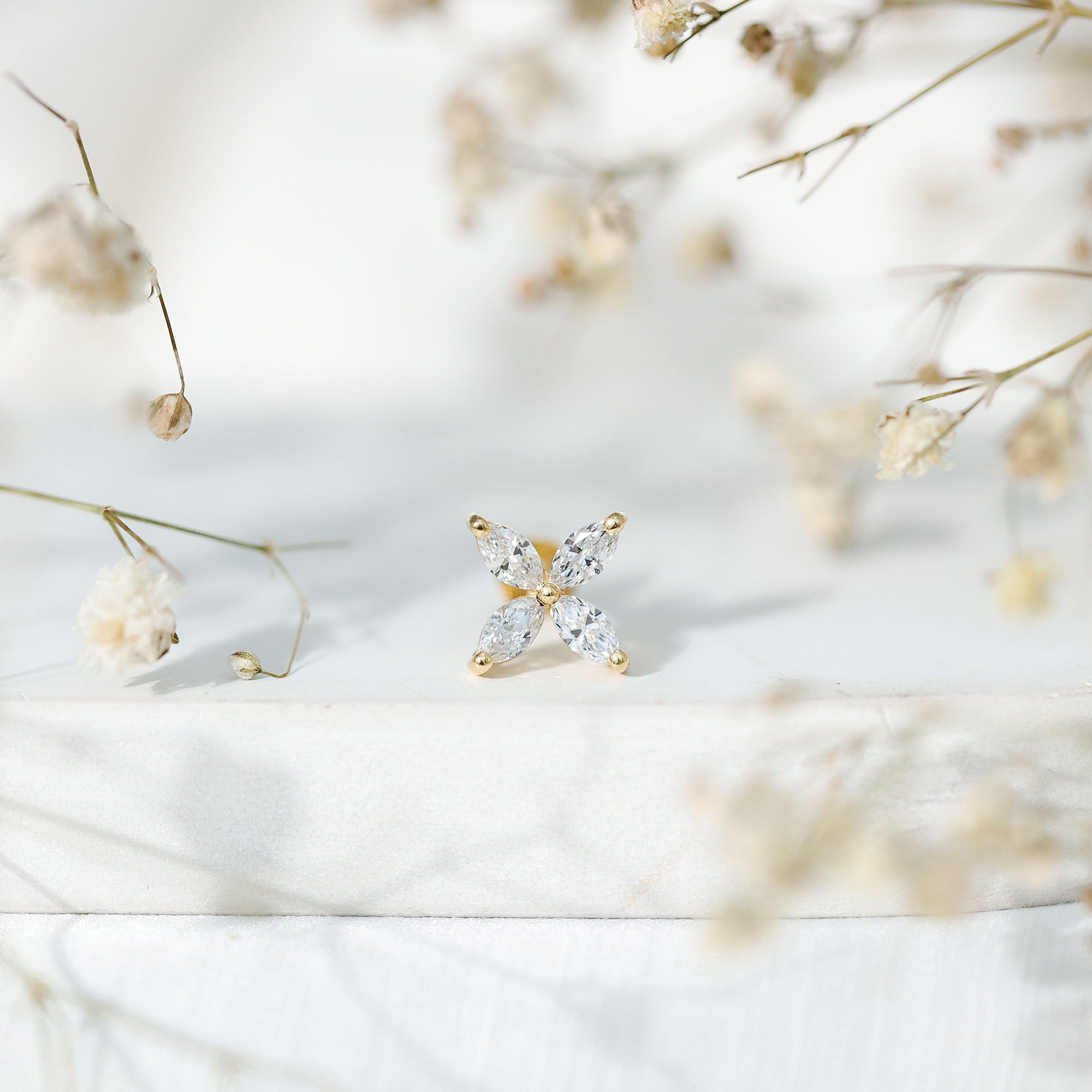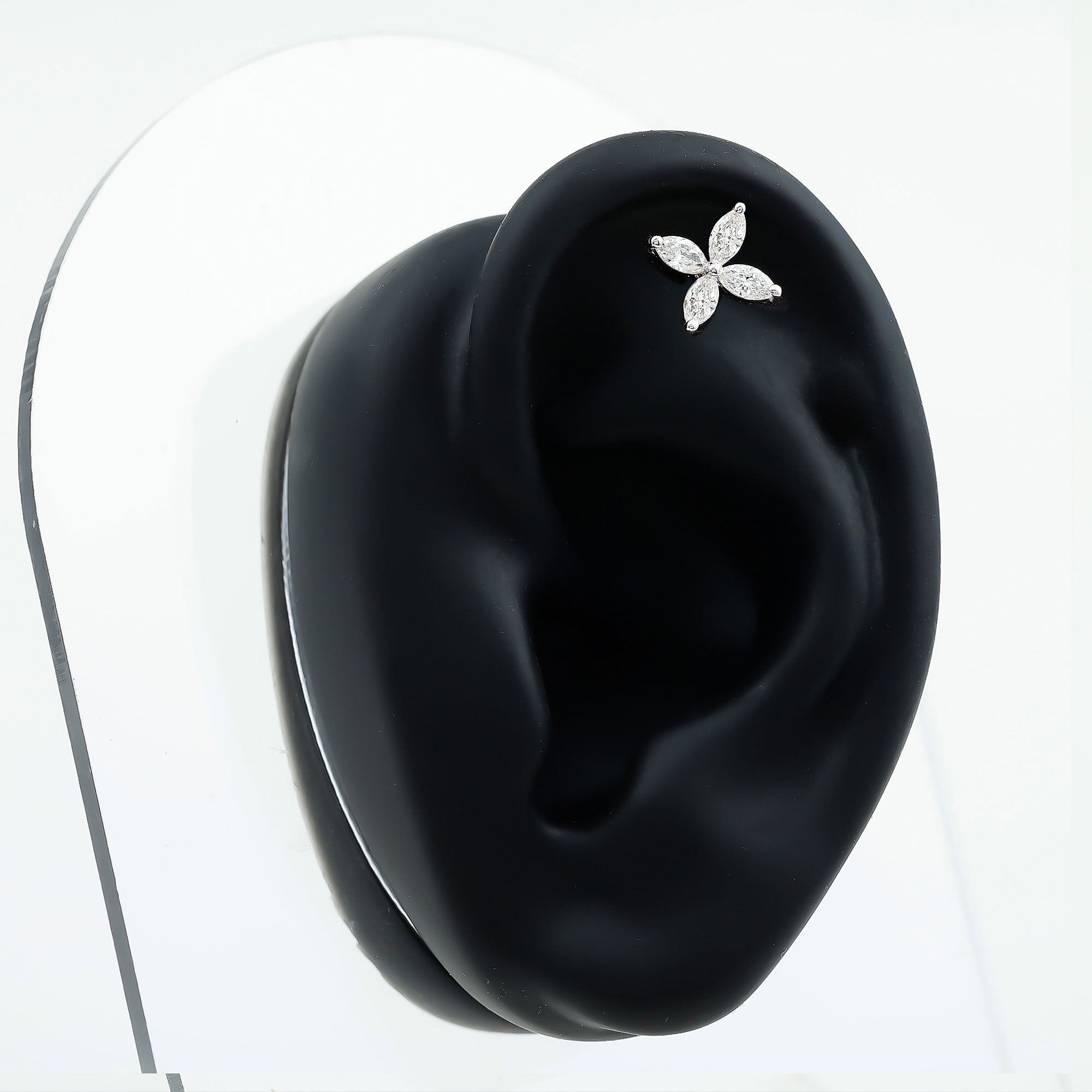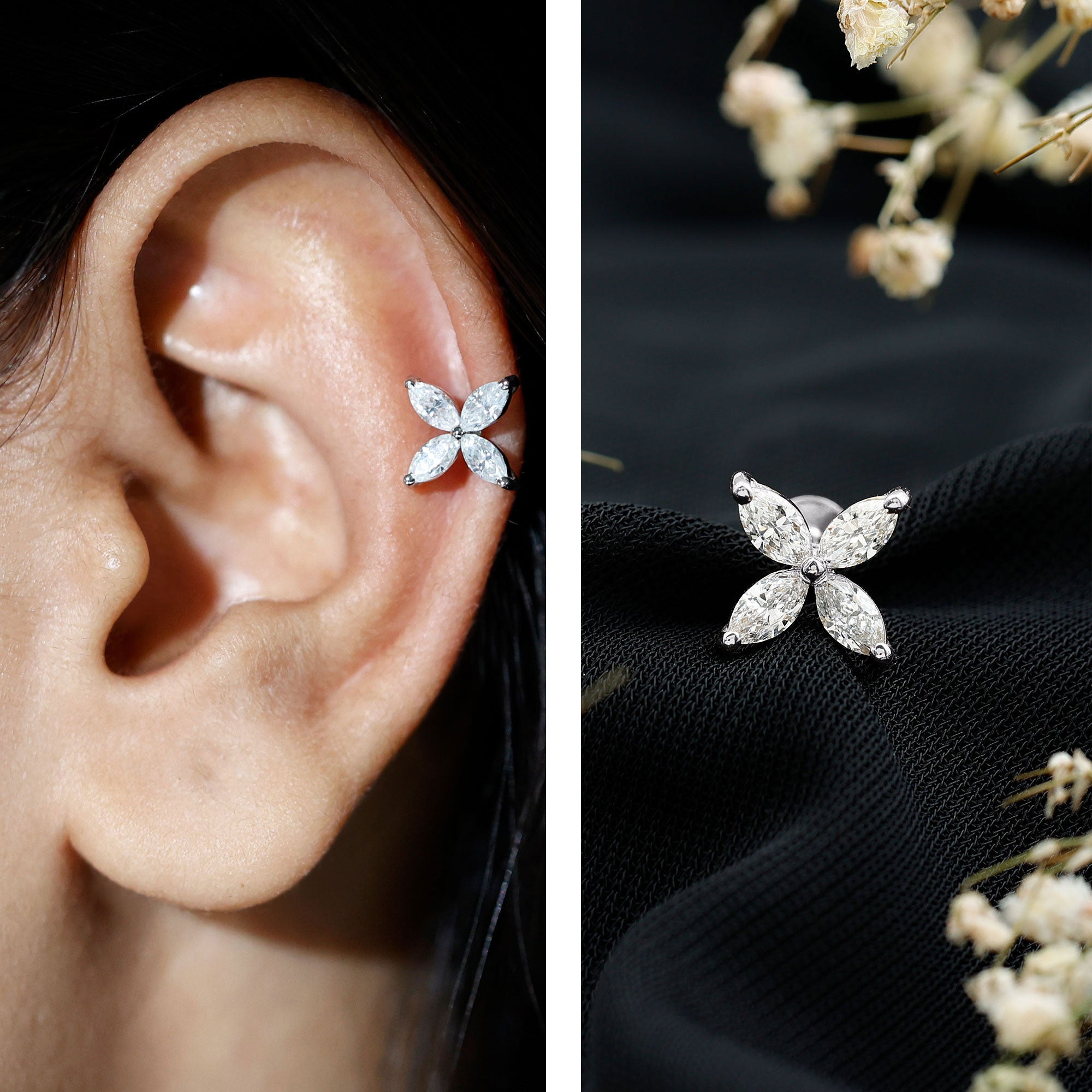 Delicate floral artistry meets everyday elegance in this Moissanite Cartilage Earring. Four marquise cut moissanites are arranged in a graceful flower, each stone held securely in prong setting, giving a sparkling look. Perfect for both casual days and special occasions, it adds a subtle charm to any outfit. Designed for helix, cartilage, or upper lobe piercings, it offers flexible styling and a personalized touch. The flat back closure ensures a comfortable and secure fit, so it stays in place all day. Crafted with D-VS1 quality moissanites, the Flower Helix Earring mirrors the brilliance of diamonds while remaining eco-friendly and budget-conscious. Each stone catches the light beautifully, highlighting the floral design and giving a delicate sparkle to your look. Arriving in a premium jewelry box with a certificate of authenticity, this Floral Cartilage Earring guarantees both quality and elegance. Ideal as a gift or a personal treat, the Moissanite Ear Piercing Earring blends timeless beauty, delicate detail, and wearable sophistication in one charming design.