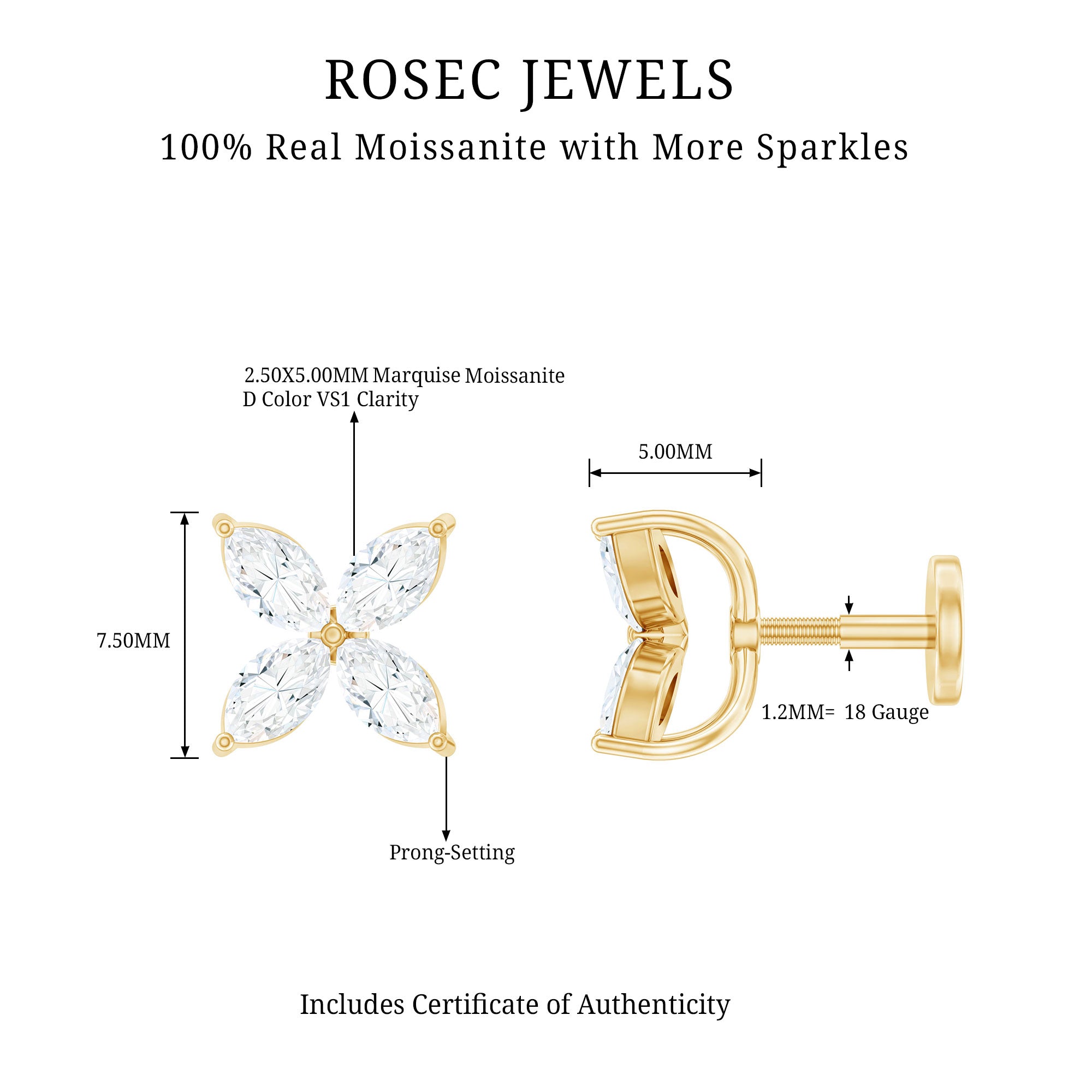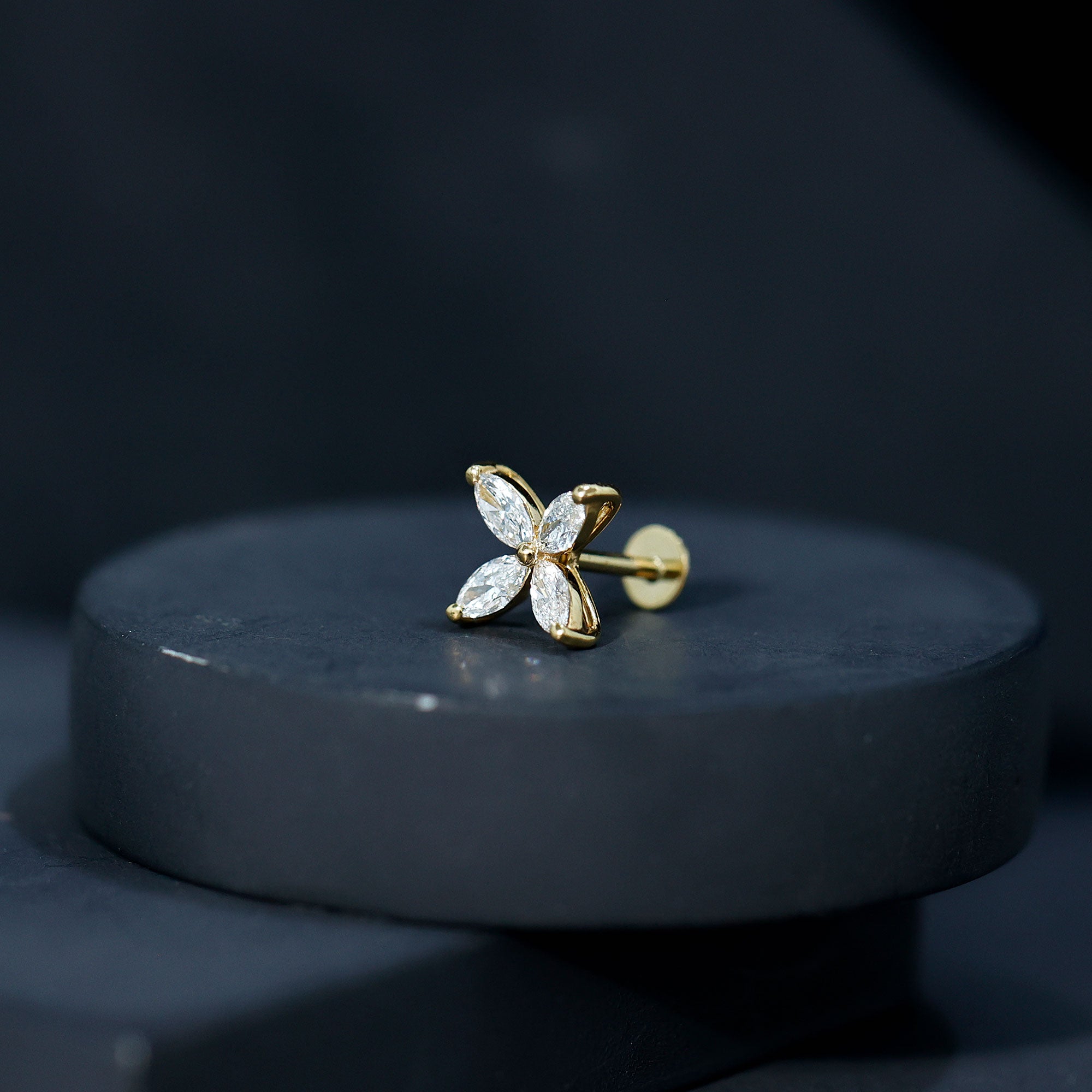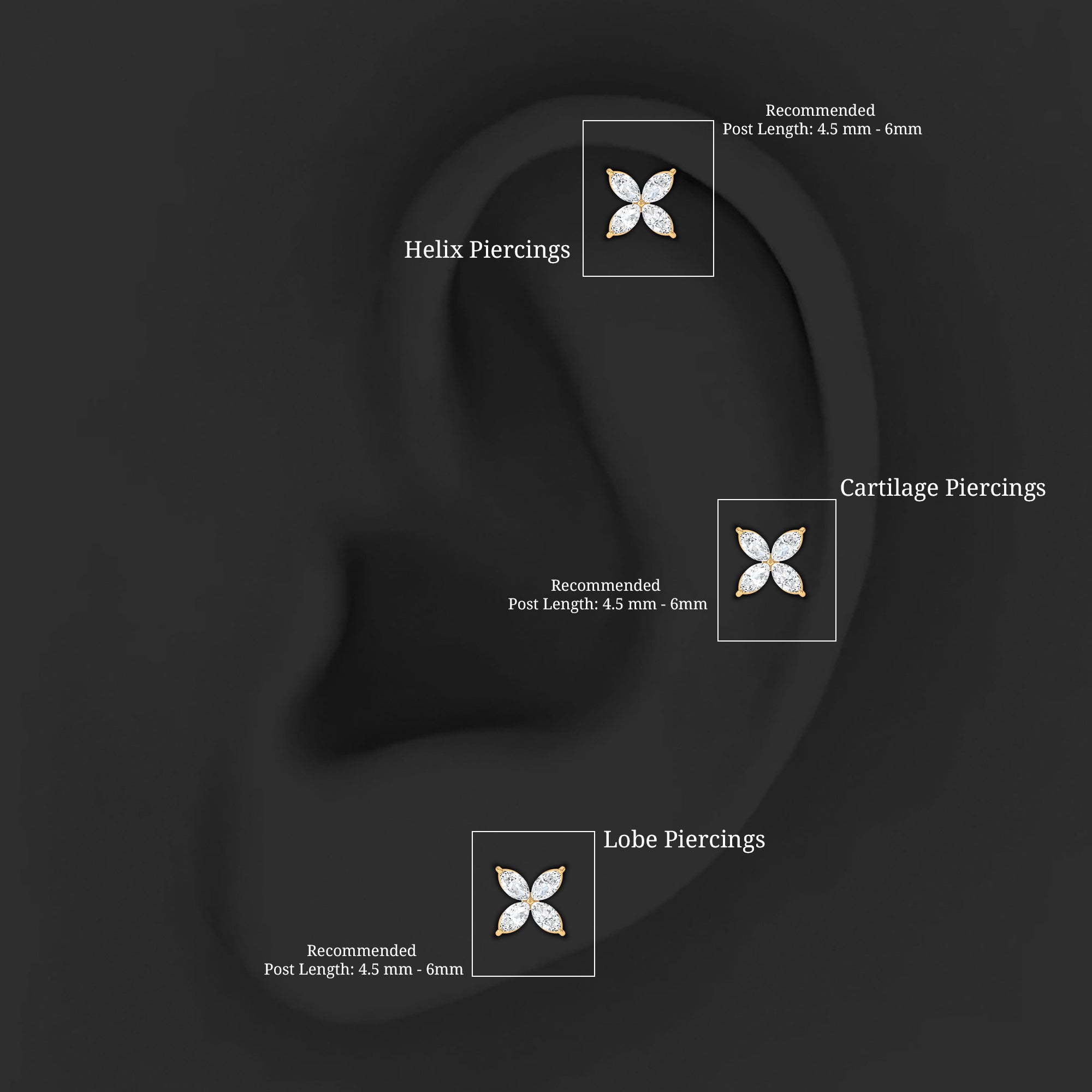 Delicate floral artistry meets everyday elegance in this Moissanite Cartilage Earring. Four marquise cut moissanites are arranged in a graceful flower, each stone held securely in prong setting, giving a sparkling look. Perfect for both casual days and special occasions, it adds a subtle charm to any outfit. Designed for helix, cartilage, or upper lobe piercings, it offers flexible styling and a personalized touch. The flat back closure ensures a comfortable and secure fit, so it stays in place all day. Crafted with D-VS1 quality moissanites, the Flower Helix Earring mirrors the brilliance of diamonds while remaining eco-friendly and budget-conscious. Each stone catches the light beautifully, highlighting the floral design and giving a delicate sparkle to your look. Arriving in a premium jewelry box with a certificate of authenticity, this Floral Cartilage Earring guarantees both quality and elegance. Ideal as a gift or a personal treat, the Moissanite Ear Piercing Earring blends timeless beauty, delicate detail, and wearable sophistication in one charming design.