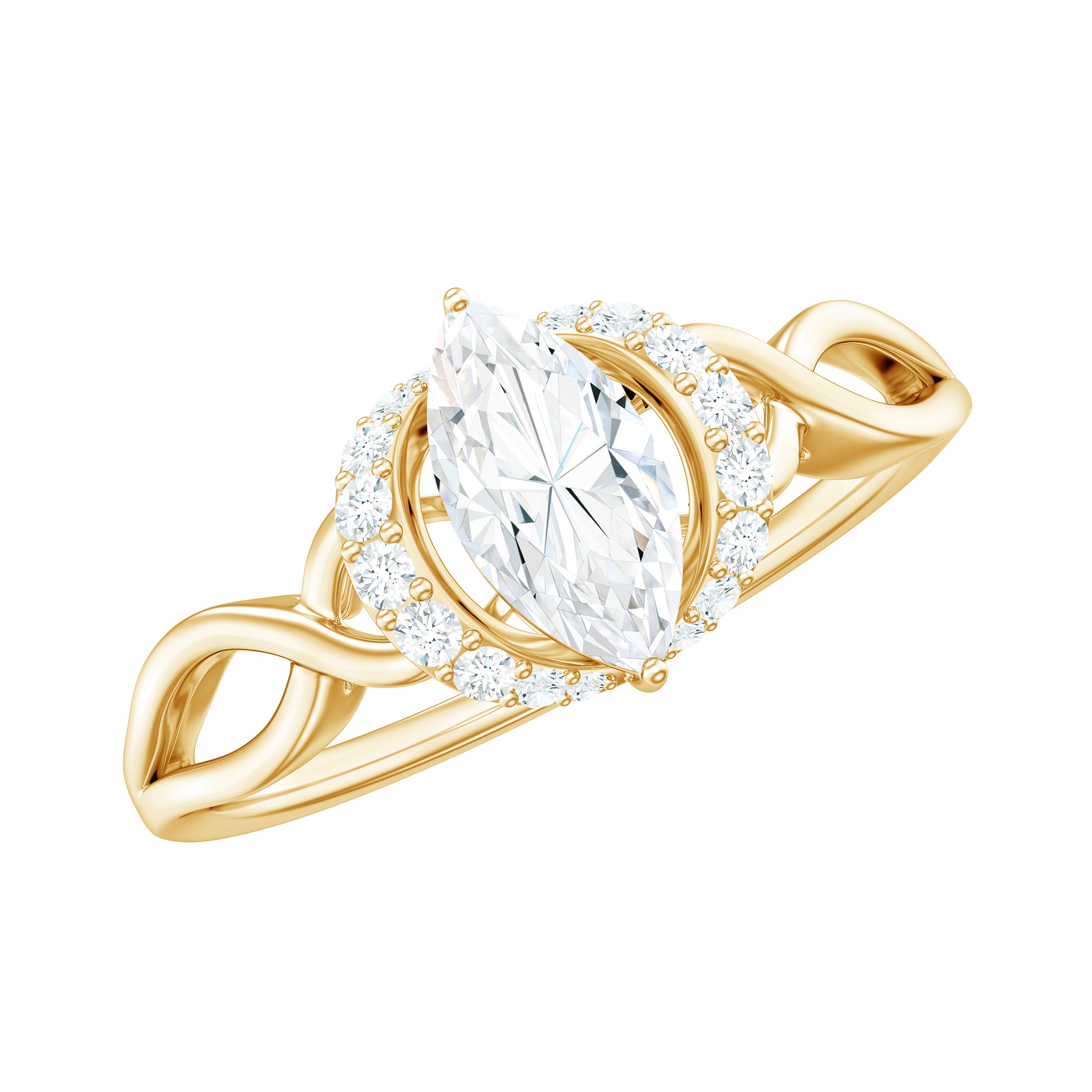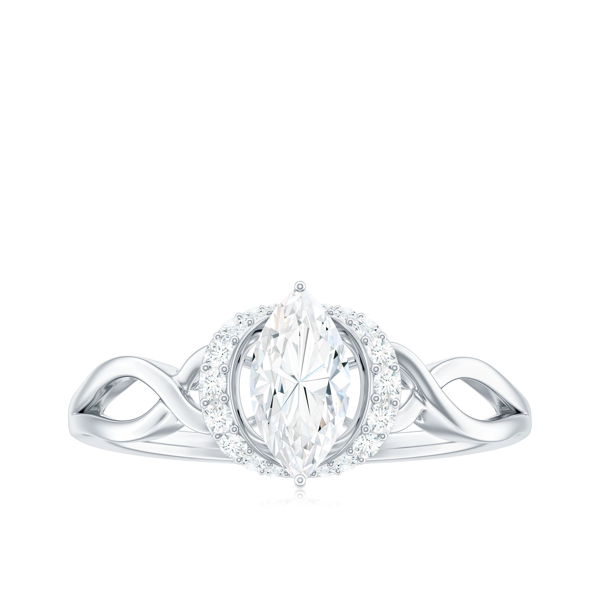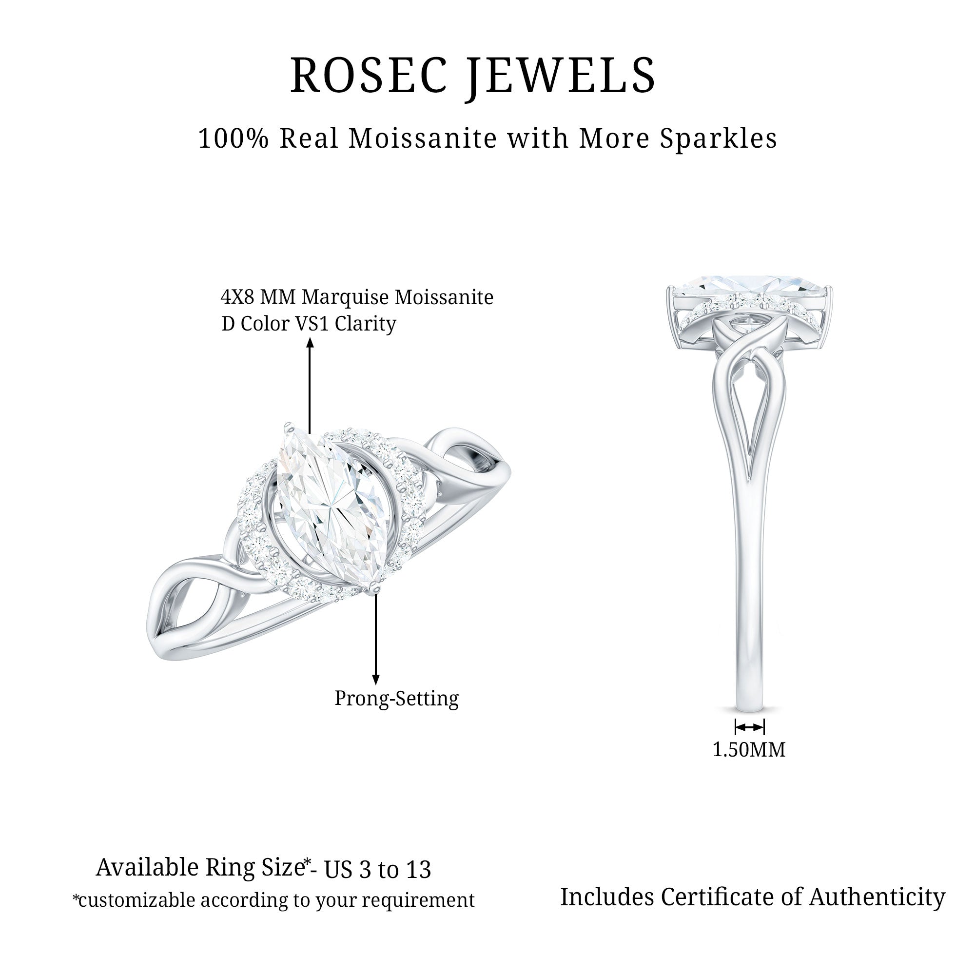 Dazzle your finger with this stunning Moissanite Engagement Ring, designed to capture the beauty of everlasting love. At the center of this graceful design is a 4X8 MM marquise cut moissanite, set securely in 2 prong setting. Its fiery brilliance shines bright, drawing every eye with its unmatched sparkle. The band features a delicate infinity-inspired twist, symbolizing two lives intertwined forever. Adorned with shimmering round moissanite side stones along the shoulders, this elegant piece brings a perfect balance of simplicity and sophistication. The unique twist design not only adds style but also represents the unbreakable bond you share. Crafted from premium metal and finished with fine attention to detail, this Infinity Engagement Ring is made for women who value both meaning and beauty in their jewelry. The D-VS1 quality moissanite stones provide extraordinary clarity and stunning brilliance, making them a luxurious yet considerate substitute for conventional diamonds. Each curve of this Marquise Cut Engagement Ring showcases outstanding craftsmanship and a classic design that she will cherish for a lifetime. Whether you are commemorating a proposal or simply celebrating love, this 1 Carat Moissanite Ring for Women transforms into a meaningful symbol of your shared journey. Carefully crafted and filled with significance, it is a ring that will forever remind her of the love it embodies, elegant, powerful, and eternal.
