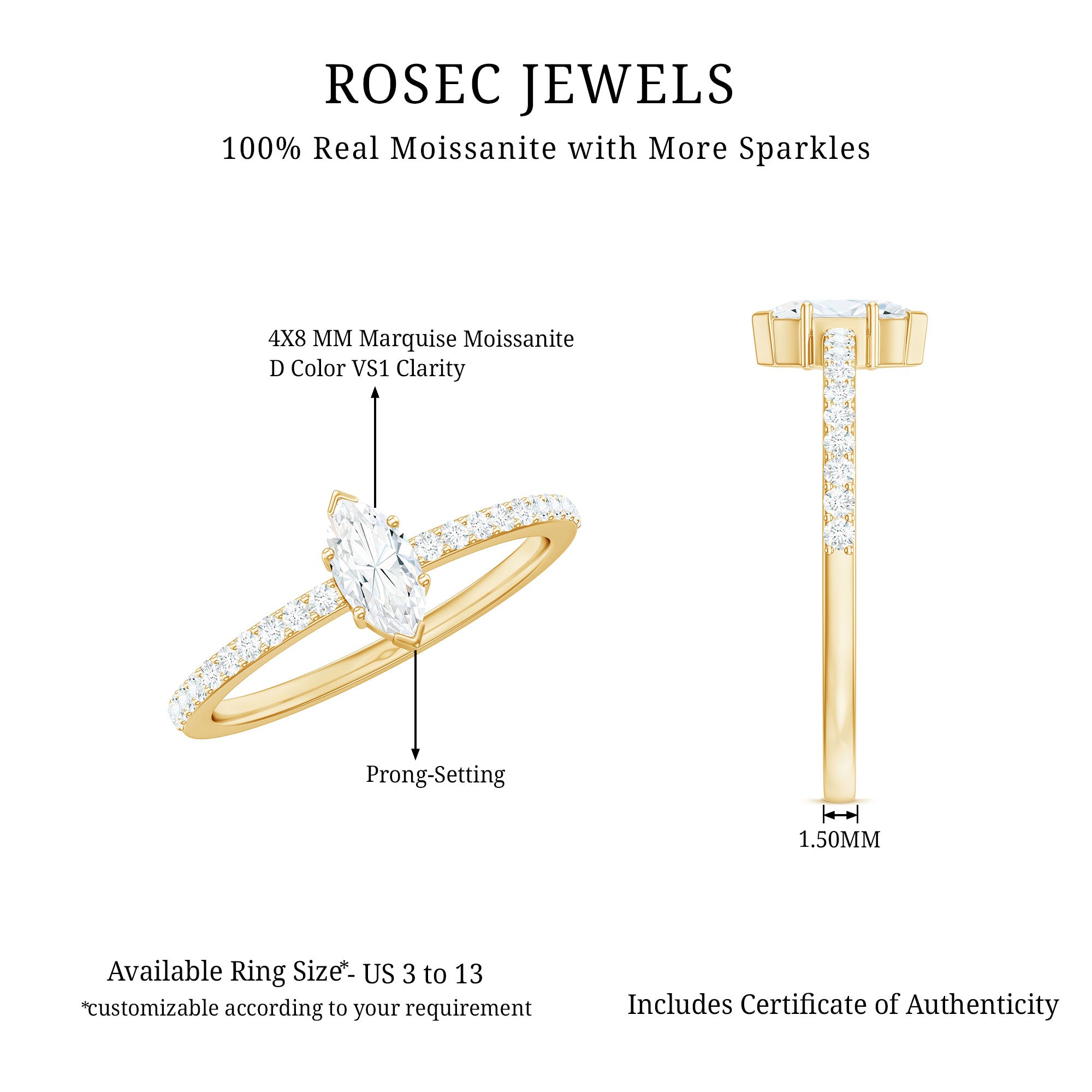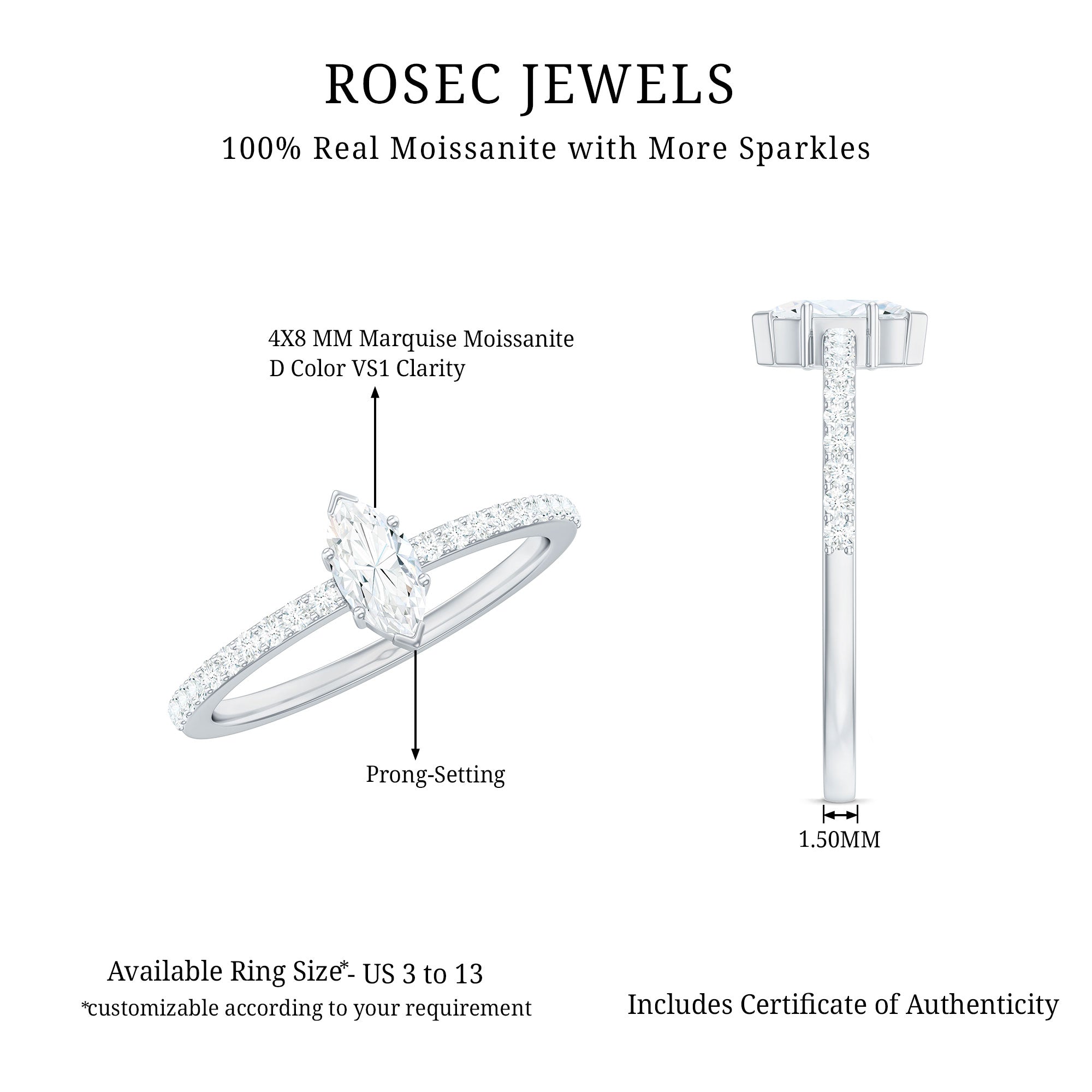 Express your feelings without uttering a single word with this stunning Moissanite Promise Ring, a classic symbol of love and commitment. At the core of this exquisite Commitment Ring is a 4X8 MM marquise cut moissanite, elegantly secured in V-prong setting that enhances the gem and allows it to shine with unparalleled brilliance. The band showcases a delicate trail of small moissanite stones along the shank, contributing a gentle sparkle that glimmers with every movement. Their elegant arrangement adds a sophisticated charm to the design, striking the perfect balance between simplicity and elegance. This Solitaire Moissanite Ring is perfect for commemorating a significant promise, celebrating a milestone, or simply expressing your devotion in a heartfelt manner. Crafted for daily comfort and lasting beauty, this Solitaire Promise Ring for Her is offered in US sizes 3 to 13 to guarantee an ideal fit. Whether you are planning a heartfelt surprise or a serene, intimate moment, this Marquise Cut Ring arrives thoughtfully packaged in a lovely jewelry box, ready to be cherished from the instant it is unveiled.