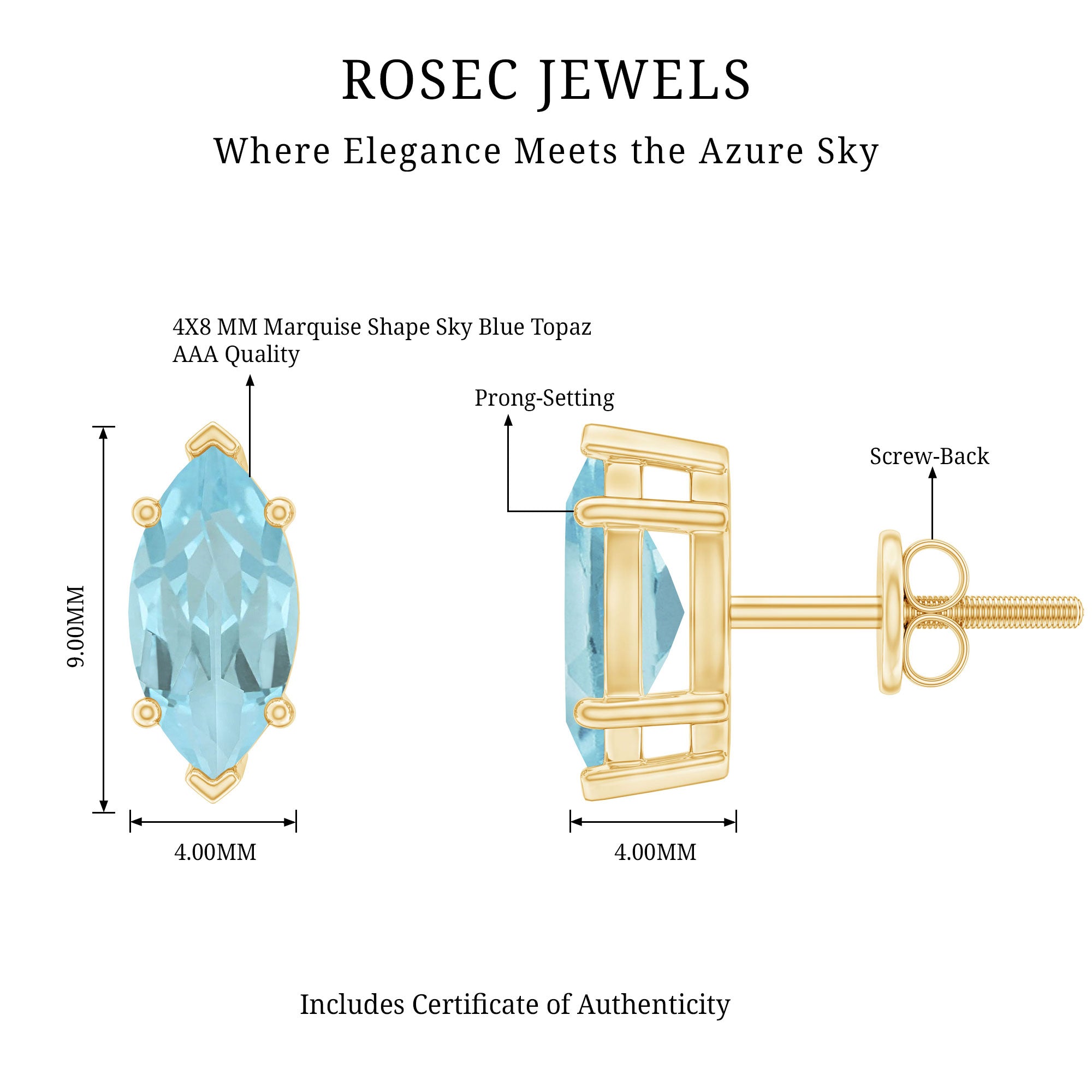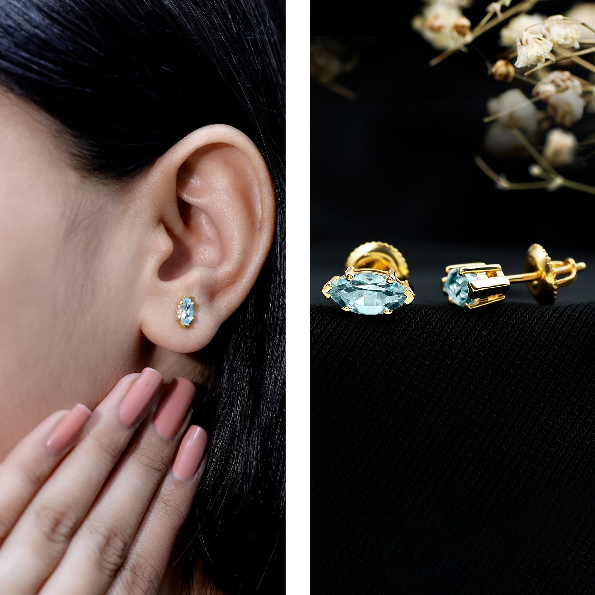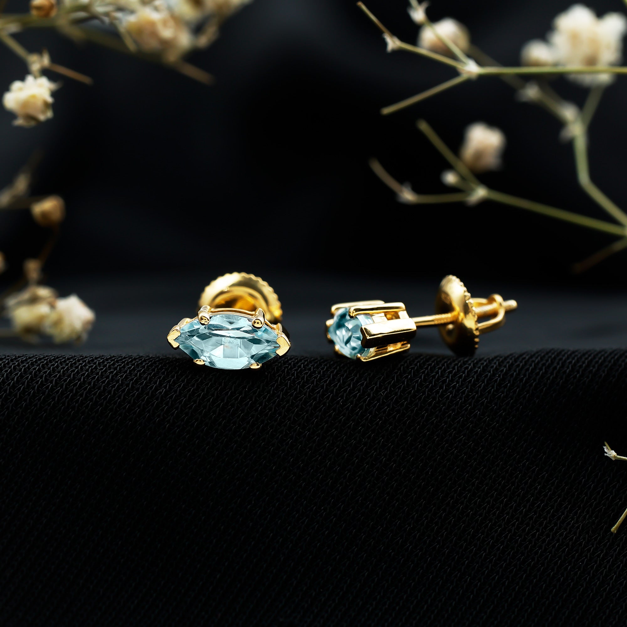 Let your love shine brighter than ever with these enchanting Sky Blue Topaz Stud Earrings, crafted to add a touch of elegance to her everyday look. Designed with care and attention to detail, each earring features a 4X8 MM marquise cut Sky Blue Topaz, set securely in prong setting that allows the light to beautifully reflect off every angle of the stone. Handcrafted in 14k yellow gold plated silver, these Solitaire Earrings are the perfect blend of simplicity and sophistication. Plus, the secure screw back closure guarantees a snug fit and extra safety, so the duo stays comfortably in place all day long. These Sky Blue Topaz Earrings are perfect for everyday wear or special occasions. Whether she is dressing up for an anniversary dinner, a birthday celebration, or simply wants to add a bit of sparkle to her daily outfit, these Marquise Earrings will be her new go-to pair. Their lightweight and elegant design makes them comfortable to wear all day long. The pair is handcrafted by our experienced artisans and carefully checked for quality. To make your gift even more special, the December Birthstone Earrings come beautifully packaged in our signature jewelry box, ready for gifting. Give her a gift she will cherish, something timeless, meaningful, and full of love.