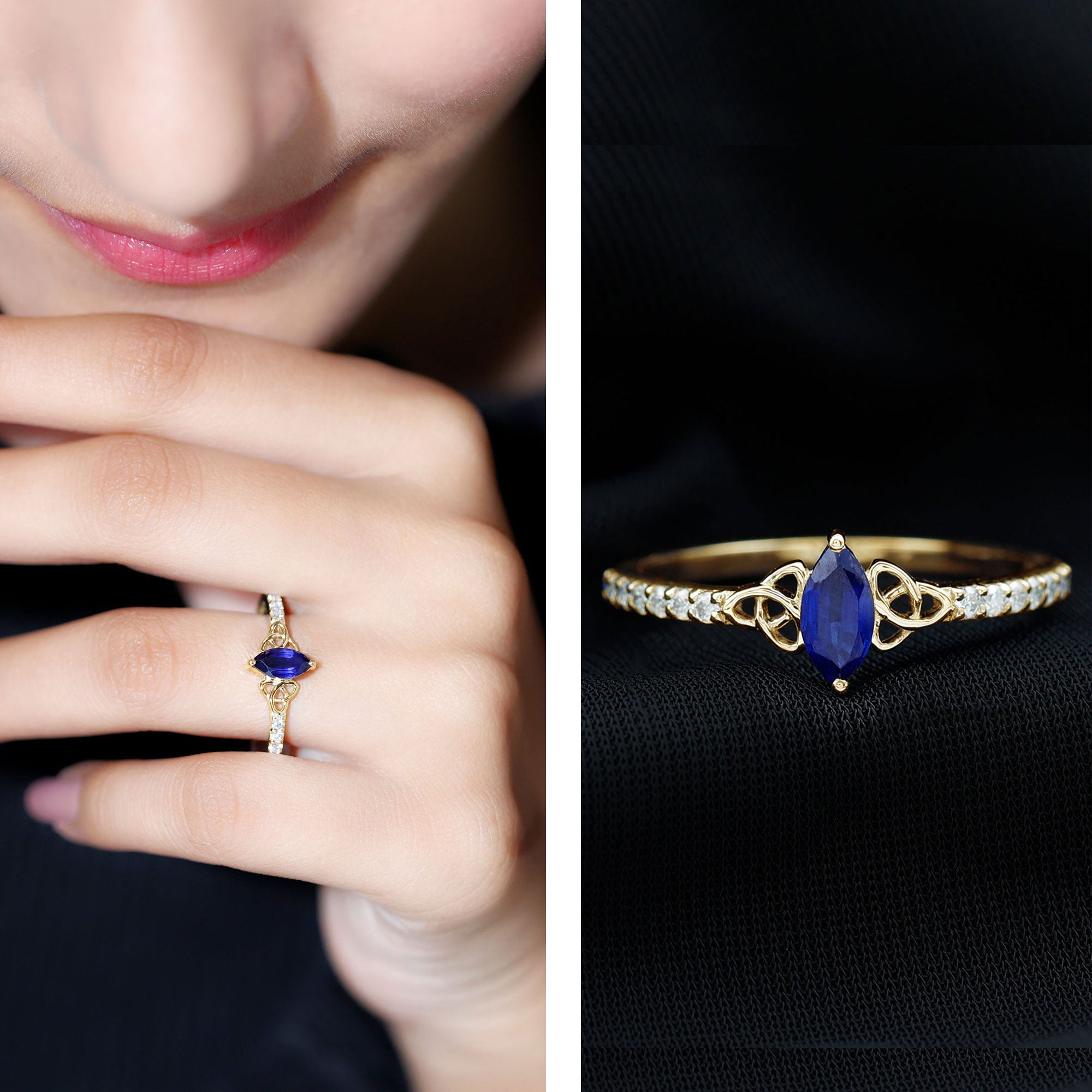 Marquise Cut Solitaire Created Blue Sapphire Celtic Knot Ring with Diamond