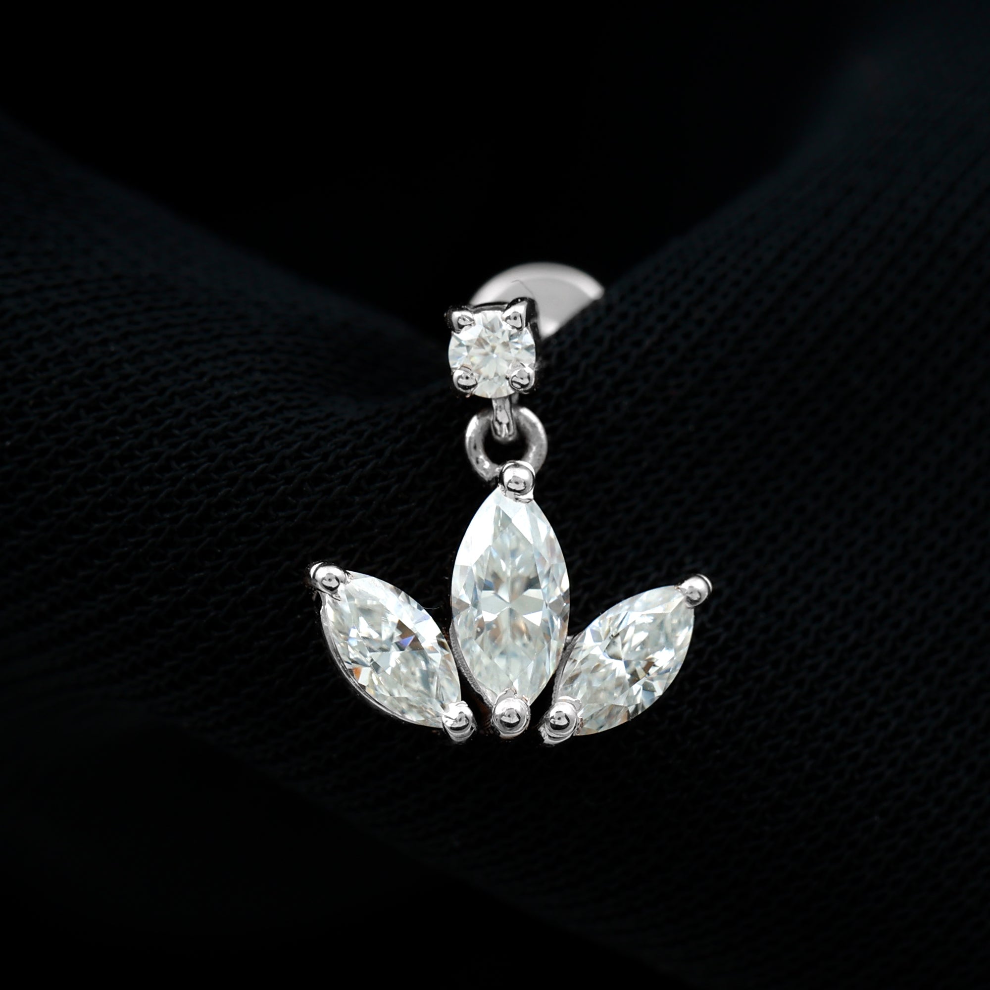 The marquise diamond lotus cartilage drop earring is designed for curated ear styling with a distinct yet balanced presence. Its lotus-inspired silhouette introduces symbolic elegance while maintaining proportion suitable for cartilage placement.