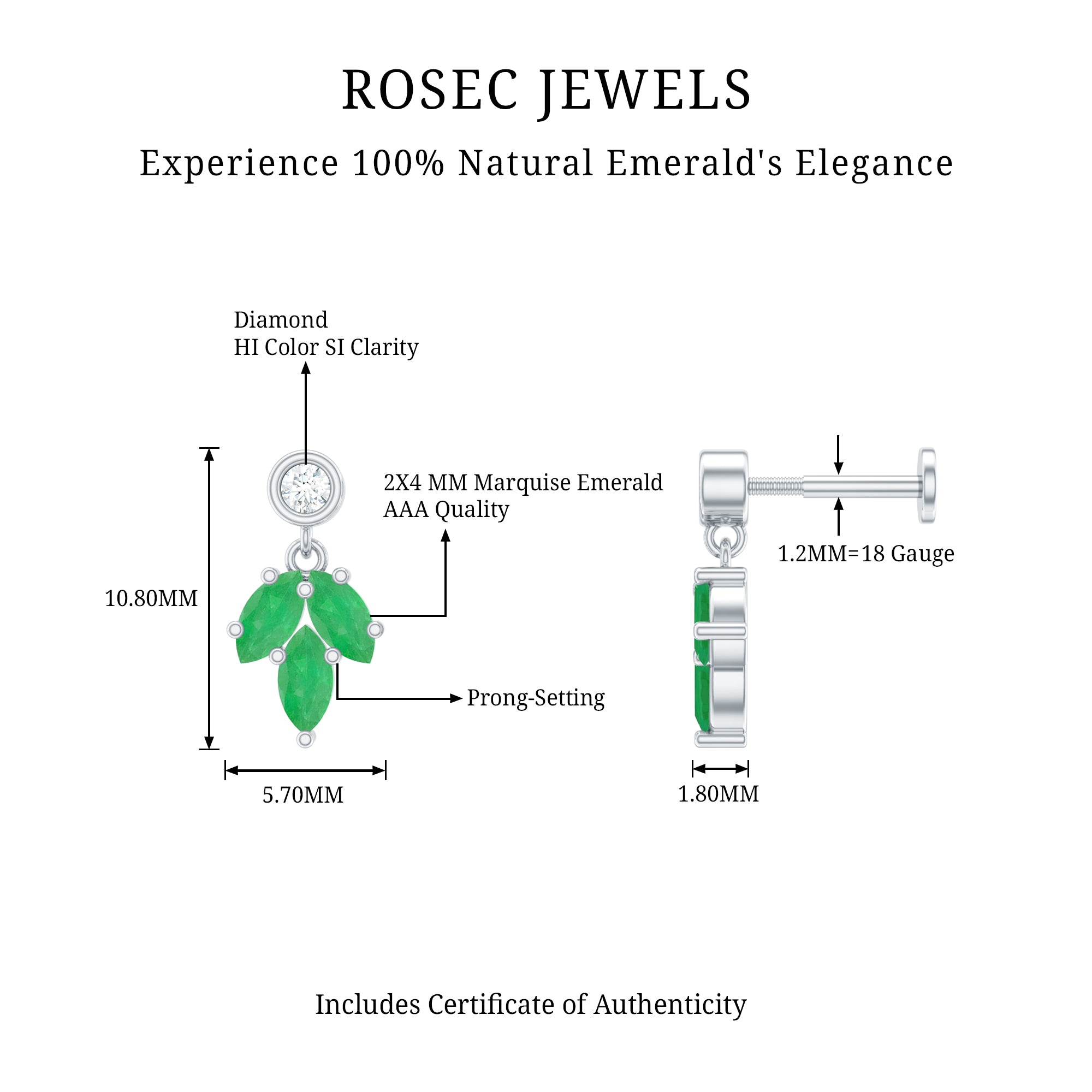 Let Nature inspire your style! This Emerald Leaf Earring features shimmering Marquise Emeralds securely nestled in a leaf-inspired design, adorned with Prong Setting with a Round Diamond on the top secured by bezel setting. Perfect for adorning your Helix, Cartilage, Conch, or Upper Lobe Piercing, this Emerald Leaf Earring exudes charm that effortlessly complements your casual, formal, and party ensembles. Capture the heart of your beloved wife with this exquisite Emerald Earring, making it an ideal anniversary, birthday, or Mothers Day gift. Witness her priceless reaction as she discovers the beauty of this nature-inspired piece.