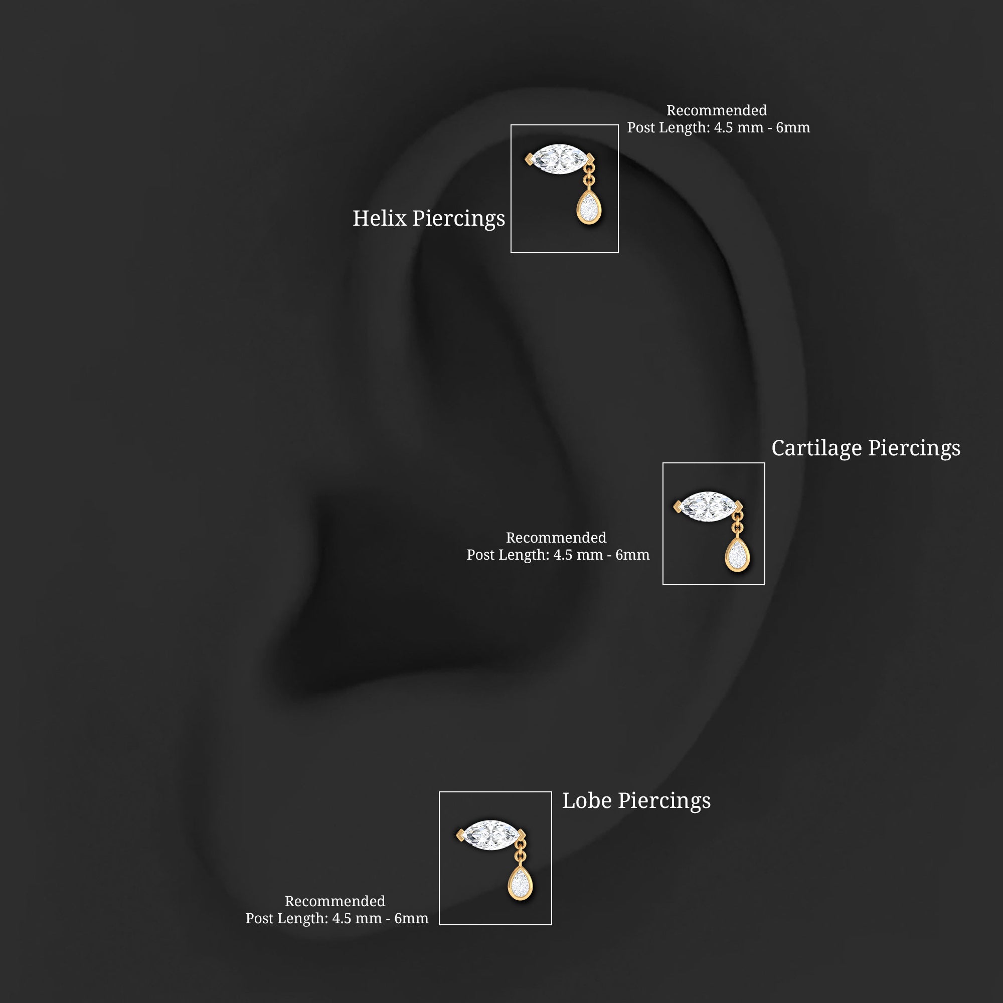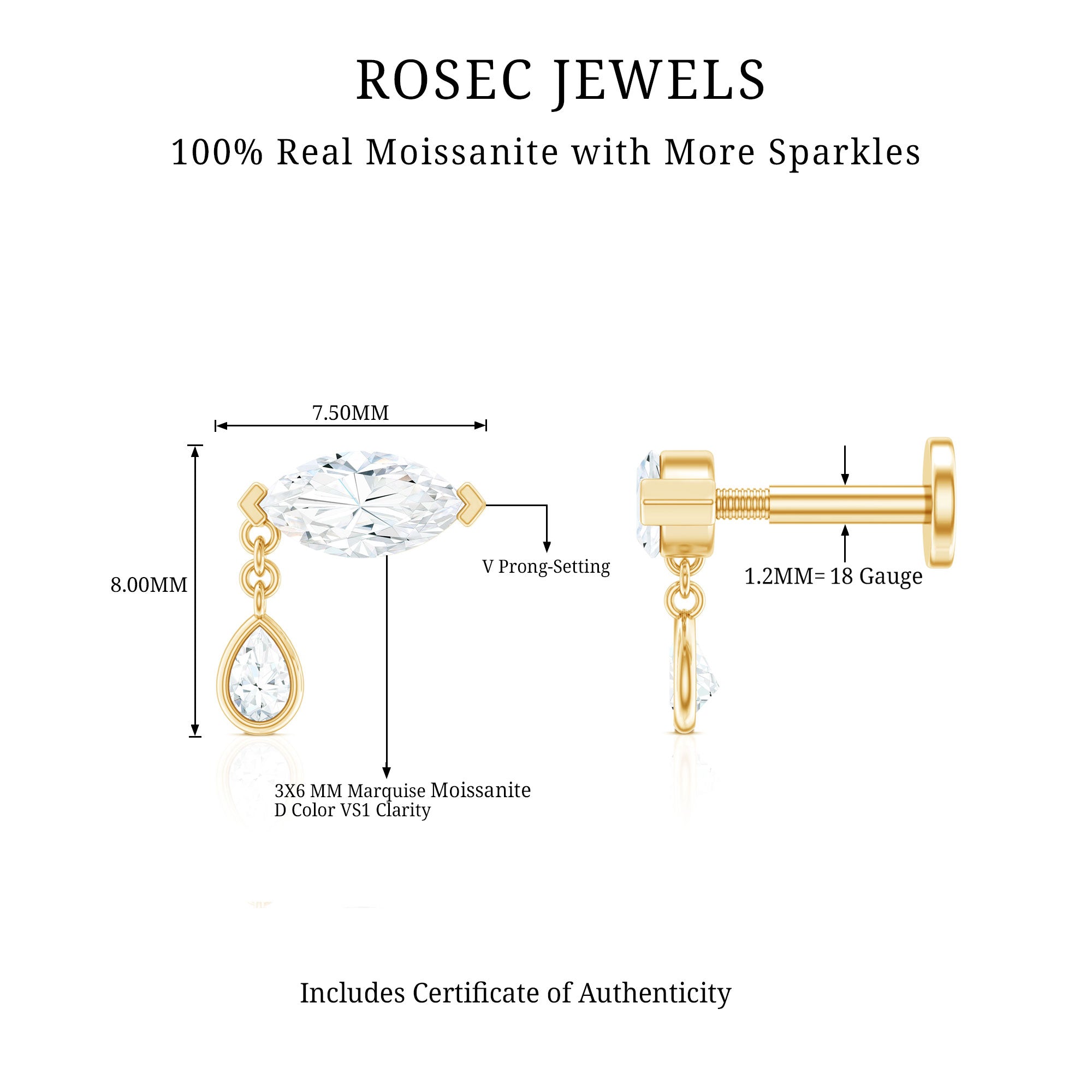 This elegant Moissanite Cartilage Earring is designed to bring a touch of sparkle and movement to your ear styling. It features a beautifully cut 3X6 MM marquise shaped moissanite set in secure V-prong setting, paired with a delicate pear shaped moissanite that hangs from a fine chain on one side. Made with D-VS1 quality moissanite, this Marquise Helix Earring shines brightly from every angle. It is comfortable and versatile, making it perfect for helix piercings, cartilage piercings, and even lobe piercings. You can wear it on its own for an elegant look, or pair it with bold statement earrings or simple studs to create a stylish curated ear. Ideal for everyday wear or special occasions, this Cartilage Dangle Earring adds a graceful touch to any outfit, whether casual, dressy, or bridal. It also makes a thoughtful and memorable gift for someone you love. Give it as an anniversary present, birthday surprise, or Christmas gift, and watch her smile when she sees this beautiful piece of jewelry.