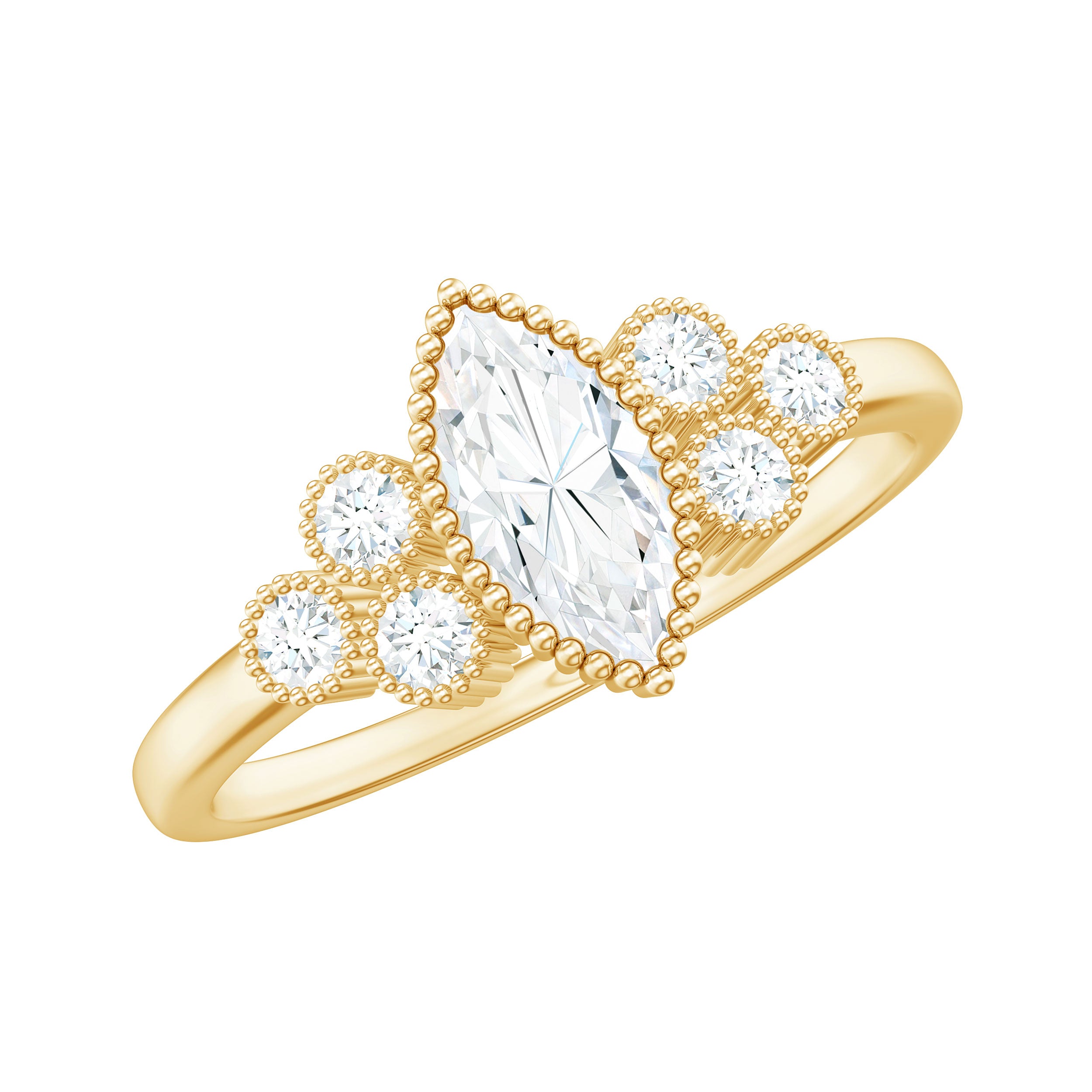 Make yourself the talk of the town with the stunning details of this Moissanite Engagement Ring, which seamlessly combines classic allure with a contemporary, radiant shine. At its heart lies a stunning 4X8 MM marquise cut moissanite, skillfully set in designer setting that highlights its graceful, elongated form. The D-VS1 quality Moissanite represents enduring love and genuine commitment. To enhance its brilliance, three round shaped moissanite stones are carefully placed on either side of the center stone, all set in the same designer style for a cohesive appearance, forming a beautiful and striking trio design. This arrangement of stones boosts the ring’s overall glow while keeping a refined simplicity that speaks volumes. Each moissanite in this Marquise Engagement Ring is meticulously chosen and arranged, providing an ethical and budget friendly option to conventional diamonds without sacrificing beauty or sparkle. The sleek, comfortable band pairs perfectly with the eye-catching trio style, making this Half Carat Moissanite Ring for Women an ideal choice for daily wear with a hint of elegance.
