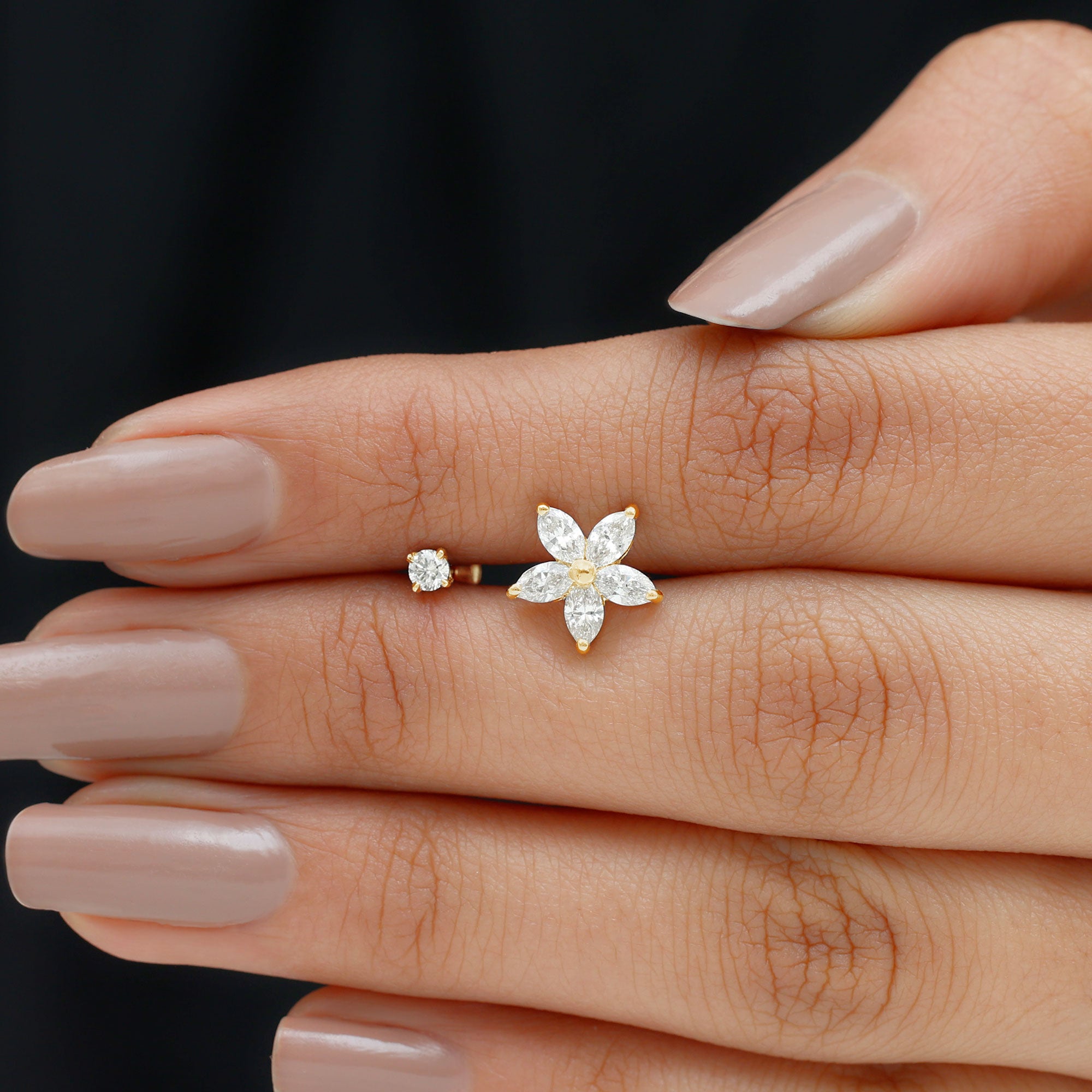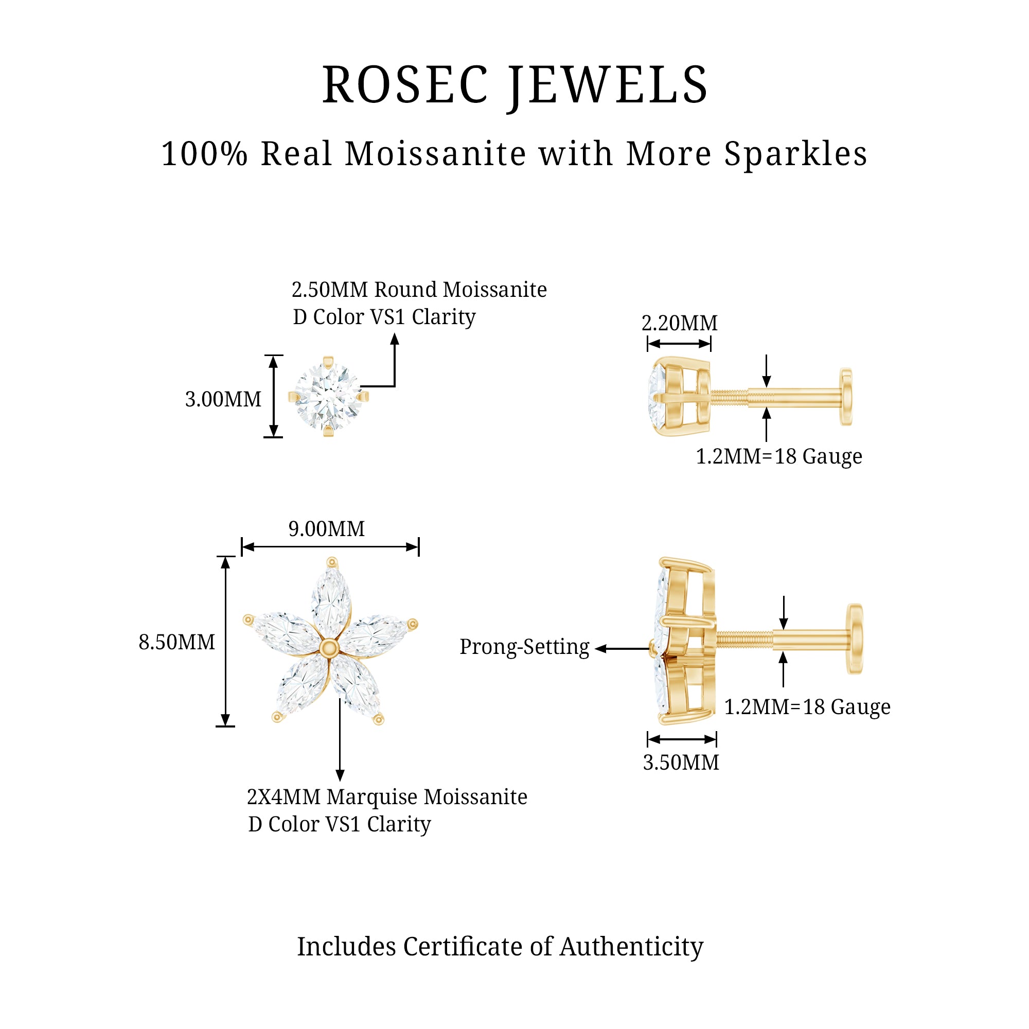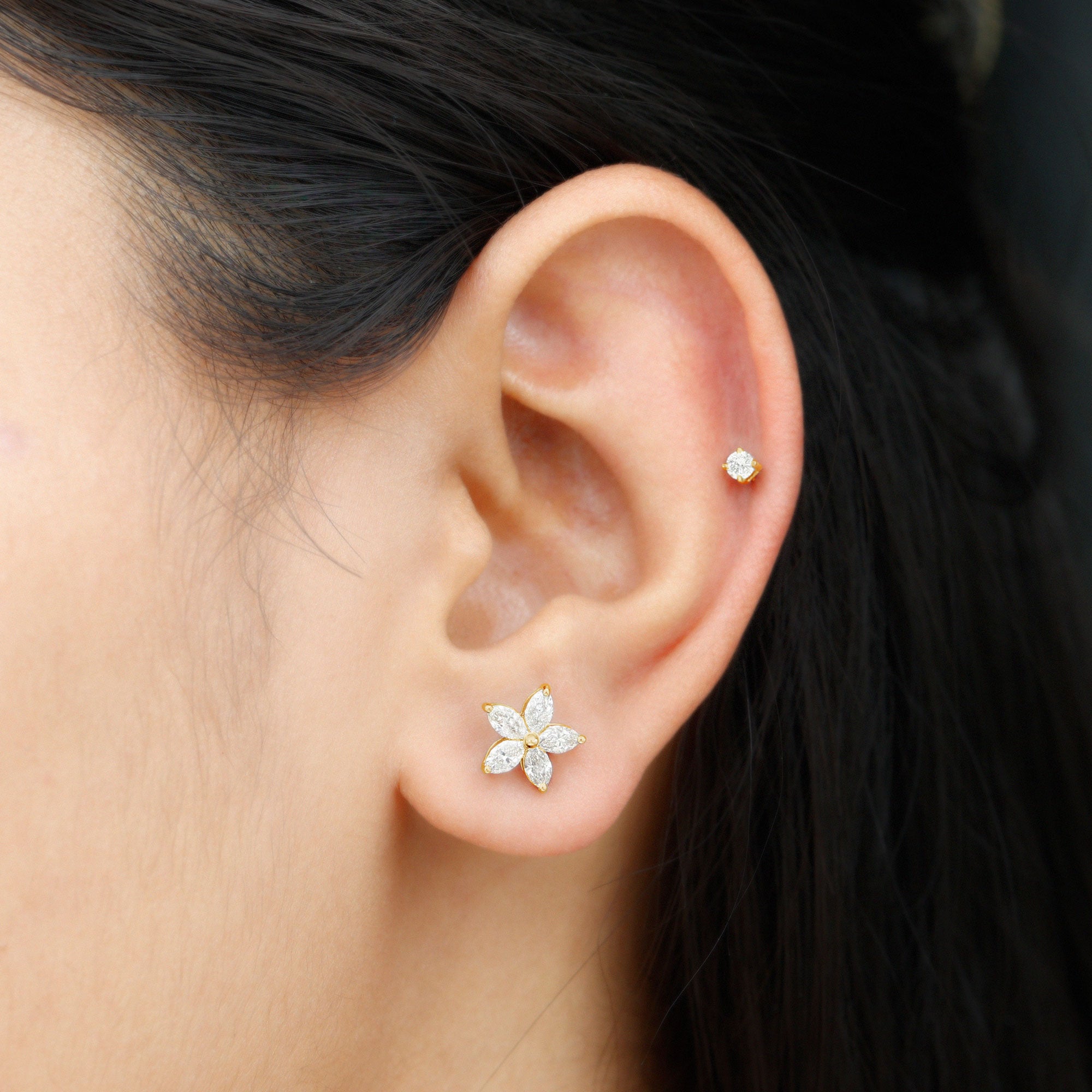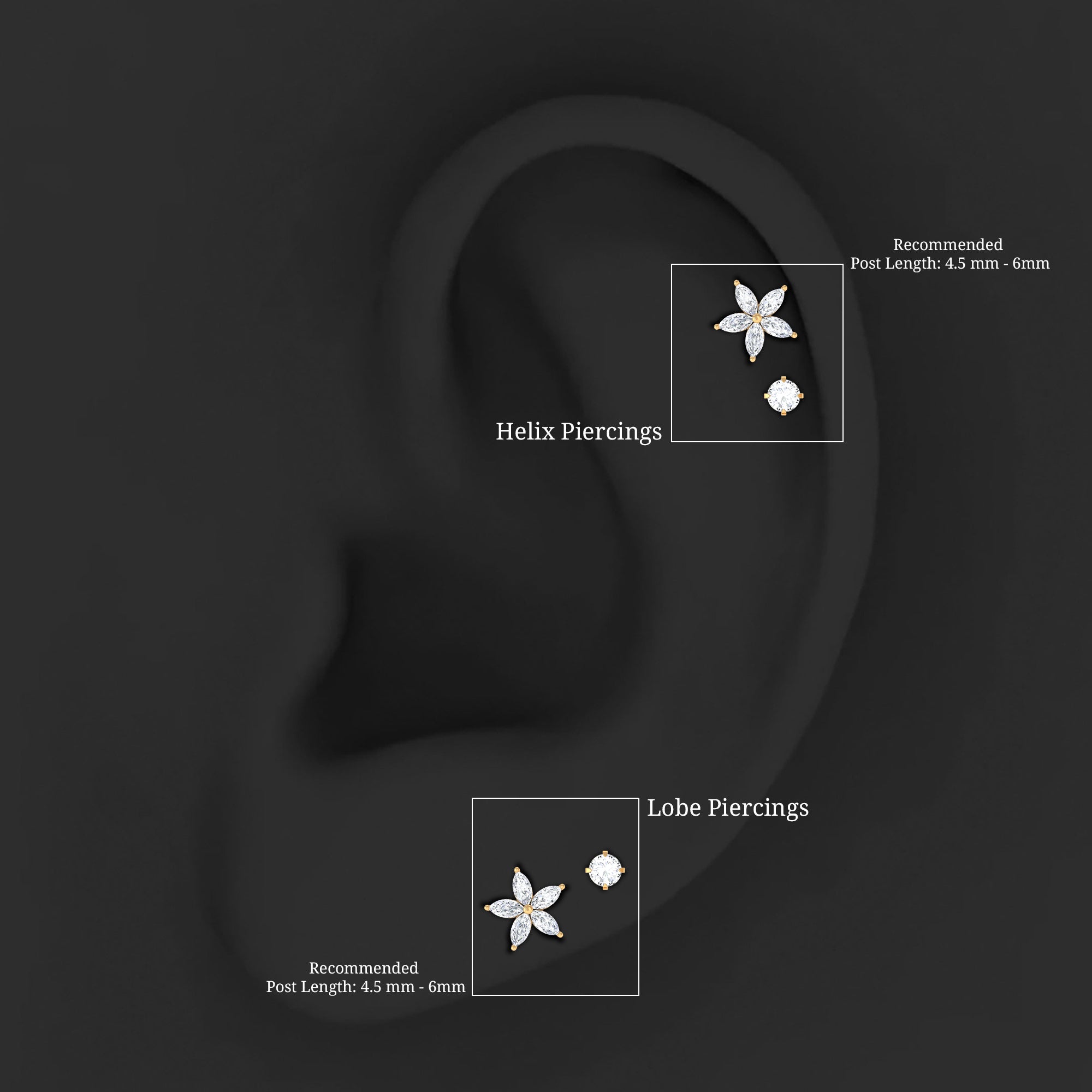 Bring a fresh and elegant touch to your ear styling with this Moissanite Cartilage Earring Set. Designed with beauty and versatility in mind, this set includes a floral inspired earring and a simple solitaire stud. The flower design is created using marquise cut moissanites arranged like delicate petals, forming a graceful and eye-catching look. Paired with it is a dainty round cut moissanite stud that adds a minimal sparkle. Crafted with high quality D-VS1 moissanites, both Moissanite Earrings shine with exceptional brilliance and clarity. The thoughtful design makes this Flower Earring Set easy to mix and match or wear together for a layered ear look. These earrings are perfect for helix, cartilage, or upper lobe piercings, offering multiple styling options to suit your personal taste. The flat back closures provide a secure and comfortable fit, making them ideal for all-day wear. This Helix Earring Set is a lovely addition to any jewelry collection and a perfect choice for everyday elegance or special occasions.