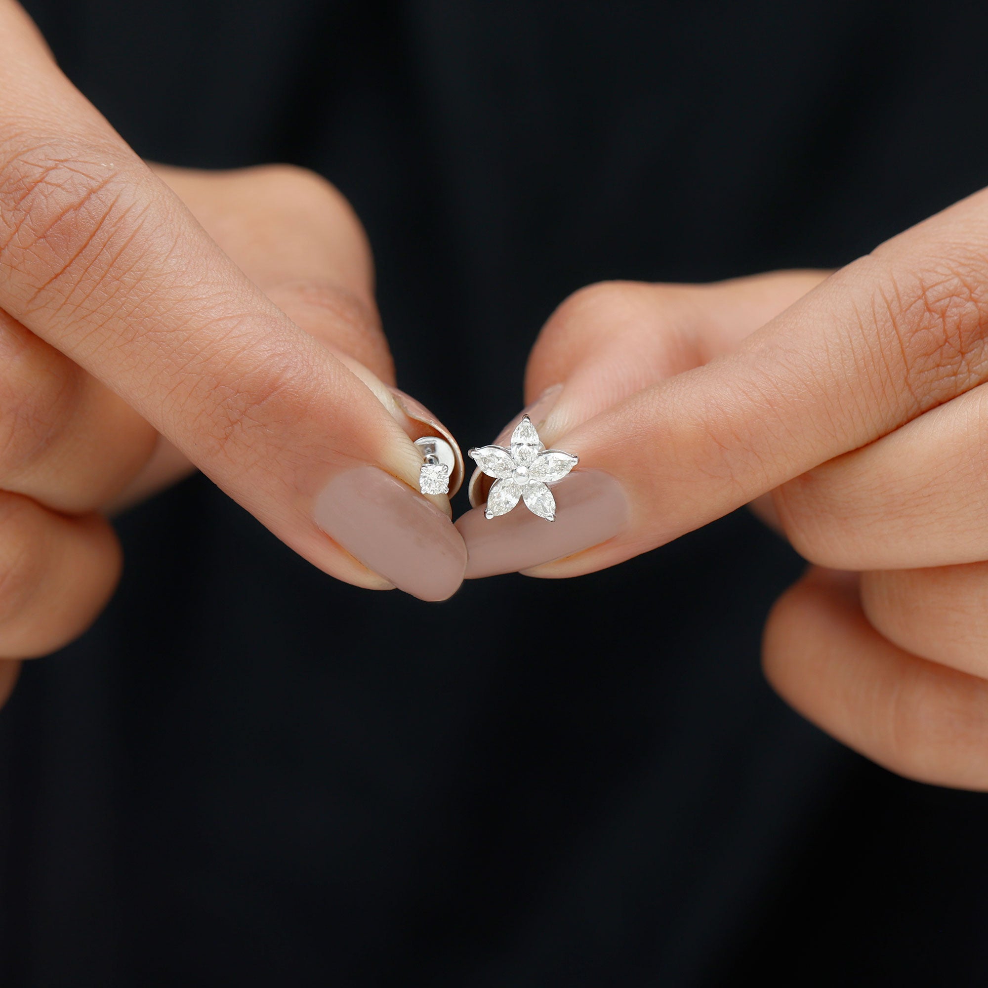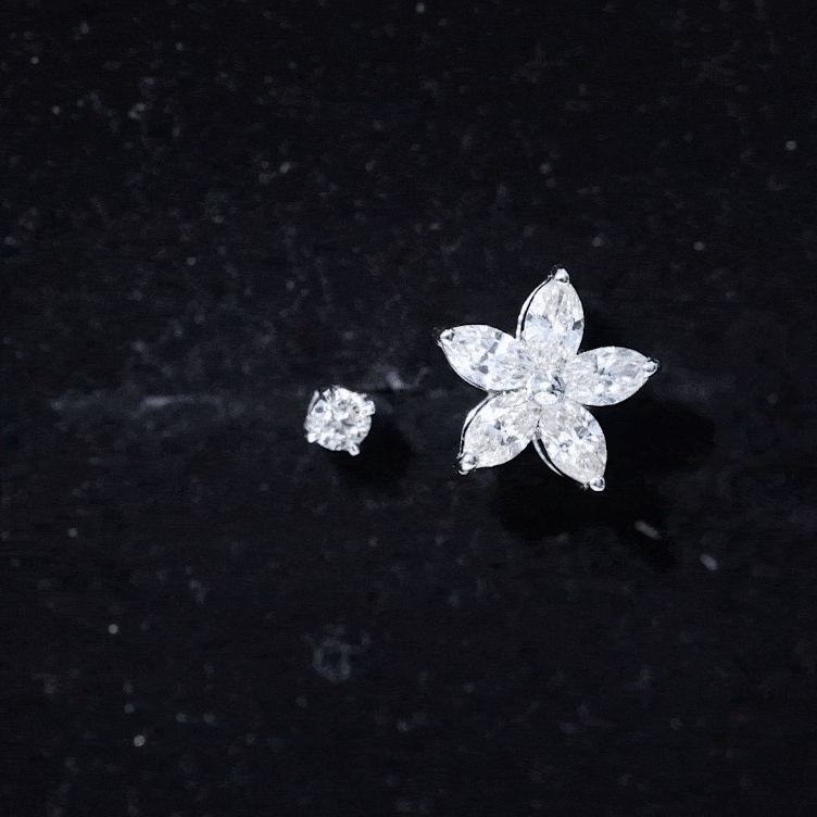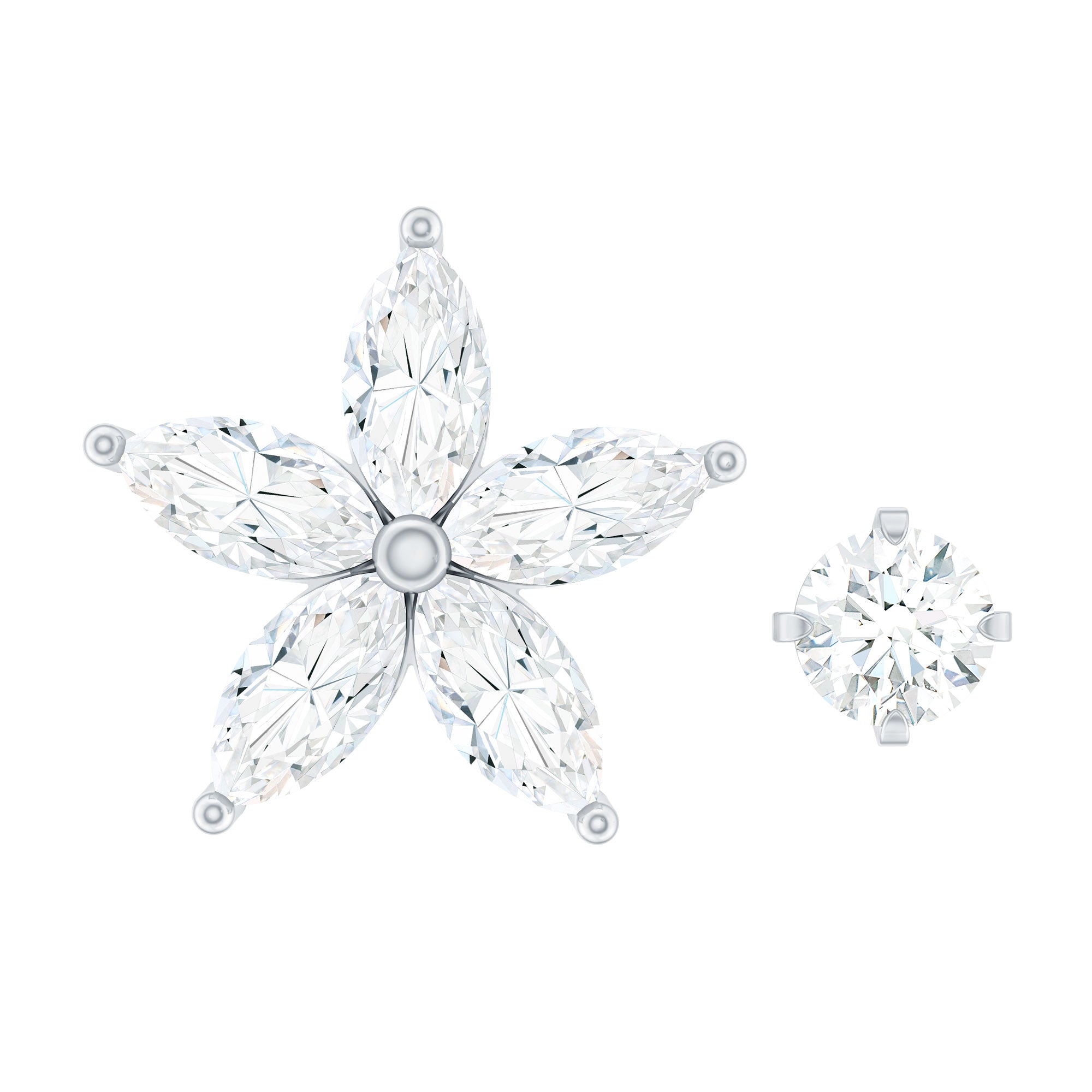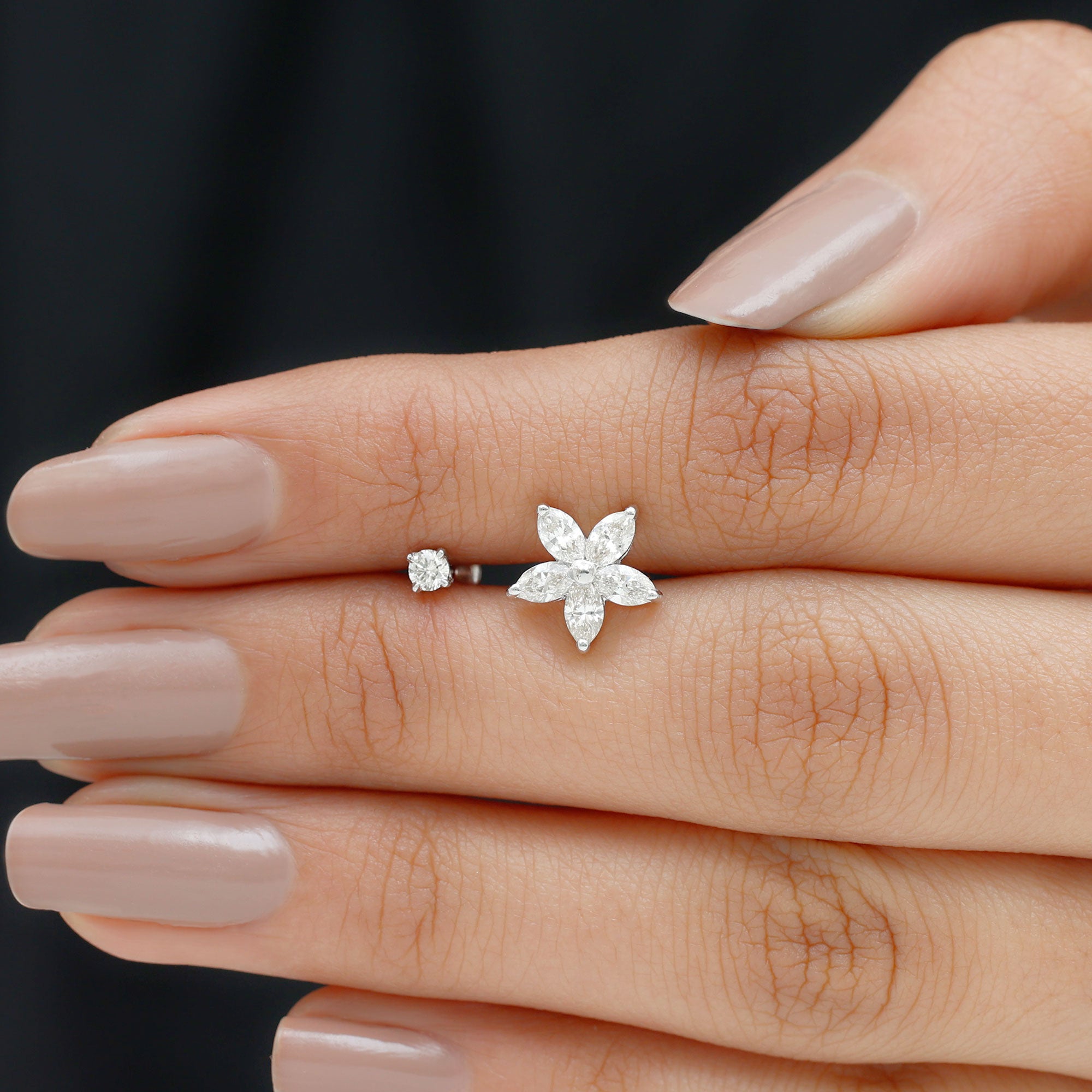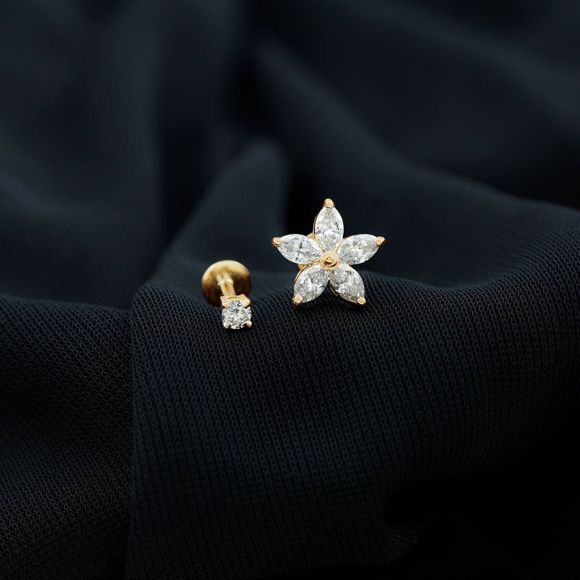 Bring a fresh and elegant touch to your ear styling with this Moissanite Cartilage Earring Set. Designed with beauty and versatility in mind, this set includes a floral inspired earring and a simple solitaire stud. The flower design is created using marquise cut moissanites arranged like delicate petals, forming a graceful and eye-catching look. Paired with it is a dainty round cut moissanite stud that adds a minimal sparkle. Crafted with high quality D-VS1 moissanites, both Moissanite Earrings shine with exceptional brilliance and clarity. The thoughtful design makes this Flower Earring Set easy to mix and match or wear together for a layered ear look. These earrings are perfect for helix, cartilage, or upper lobe piercings, offering multiple styling options to suit your personal taste. The flat back closures provide a secure and comfortable fit, making them ideal for all-day wear. This Helix Earring Set is a lovely addition to any jewelry collection and a perfect choice for everyday elegance or special occasions.