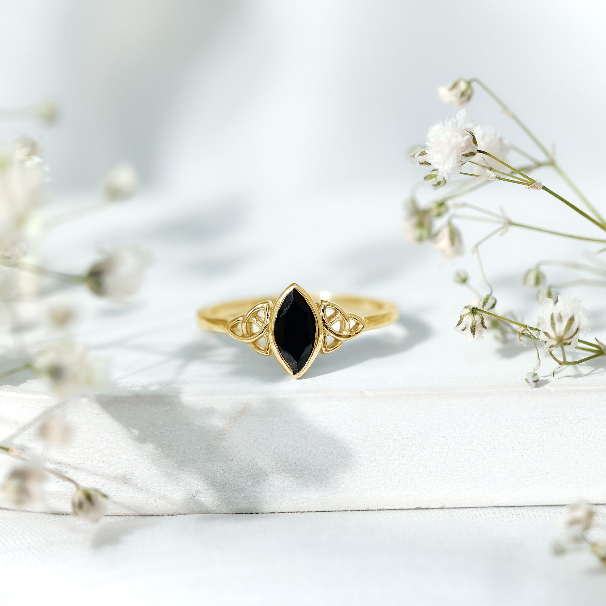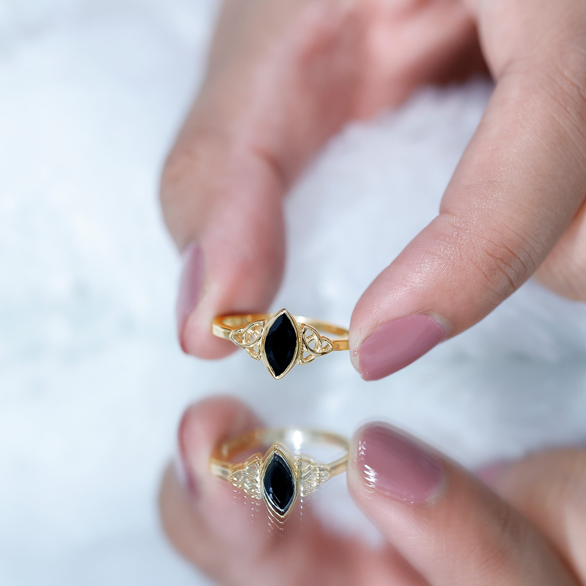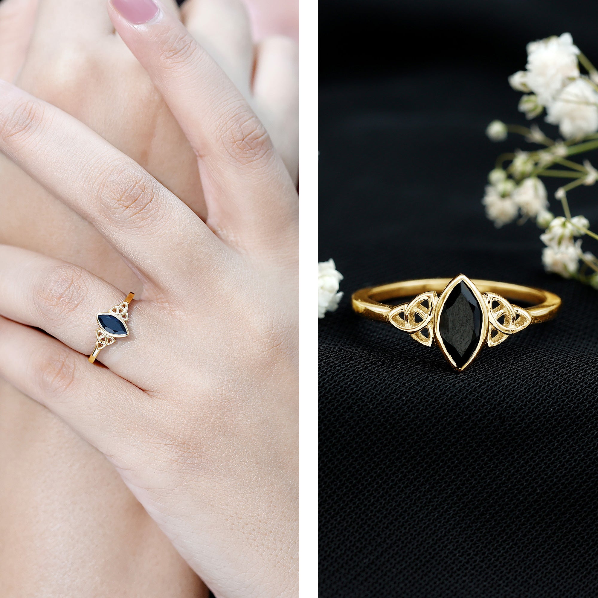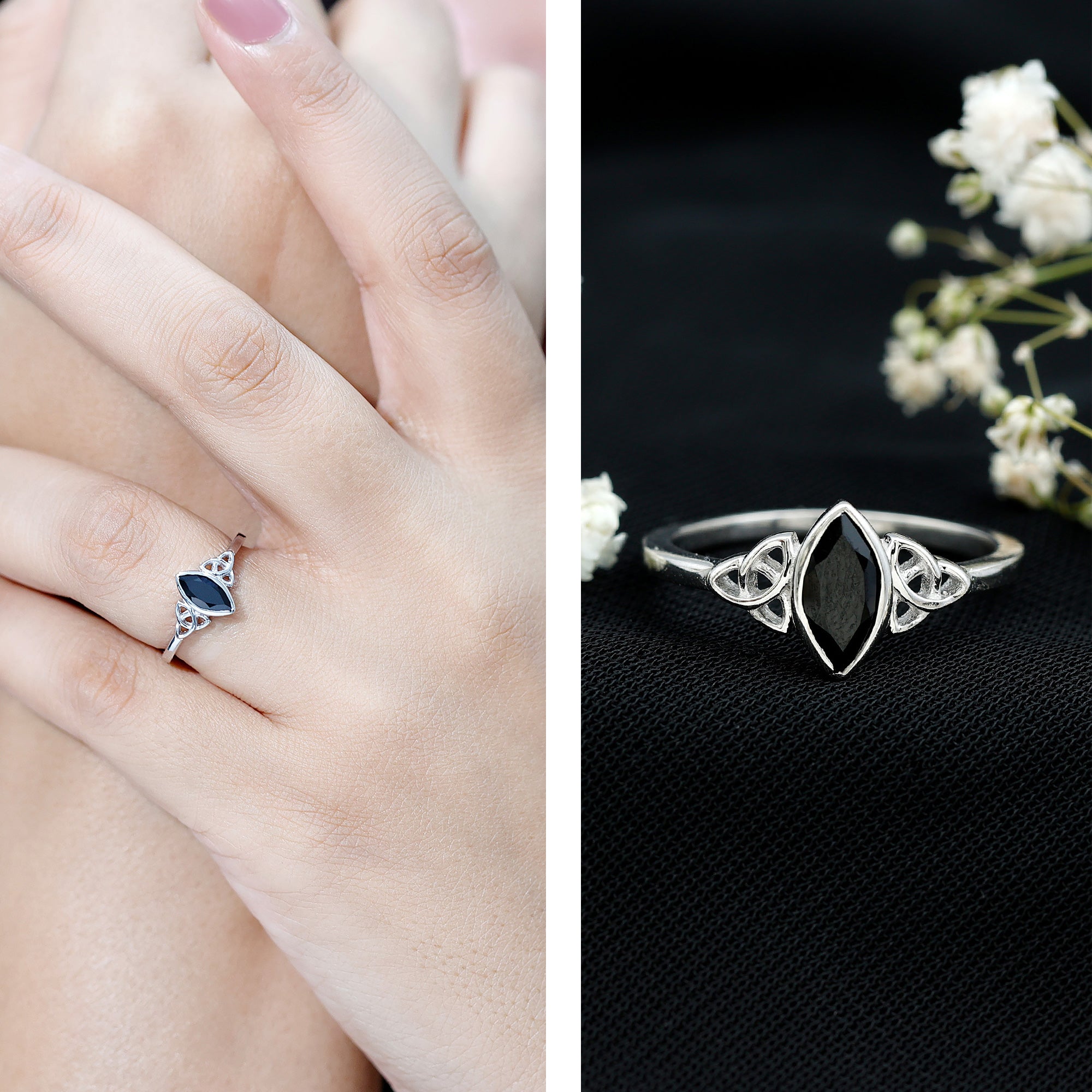 Meaningful jewelry often begins with a design that tells its own story, and this Black Spinel Promise Ring does exactly that. Curated with a 4X8 MM marquise cut black spinel, held securely in a bezel setting that gives the stone an elegant outline. On both sides of the gemstone, a beautiful Celtic knot pattern is set over the band, adding depth, tradition, and symbolism. The knot work represents unity, loyalty, and a bond that has no beginning or end, making the Spinel Solitaire Ring a heartfelt choice for someone you love. Its simple lines and detailed design bring together modern style and timeless meaning, creating a piece that feels both classic and unique. Comfortable to wear every day, the Marquise Cut Ring is perfect for anyone who enjoys jewelry with emotional value. It works wonderfully as a promise ring, a commitment ring, or even a thoughtful gift for a special moment. With its symbolism, charm, and meaningful craftsmanship, the Black Spinel Ring becomes a reminder of love, trust, and lasting connection.
