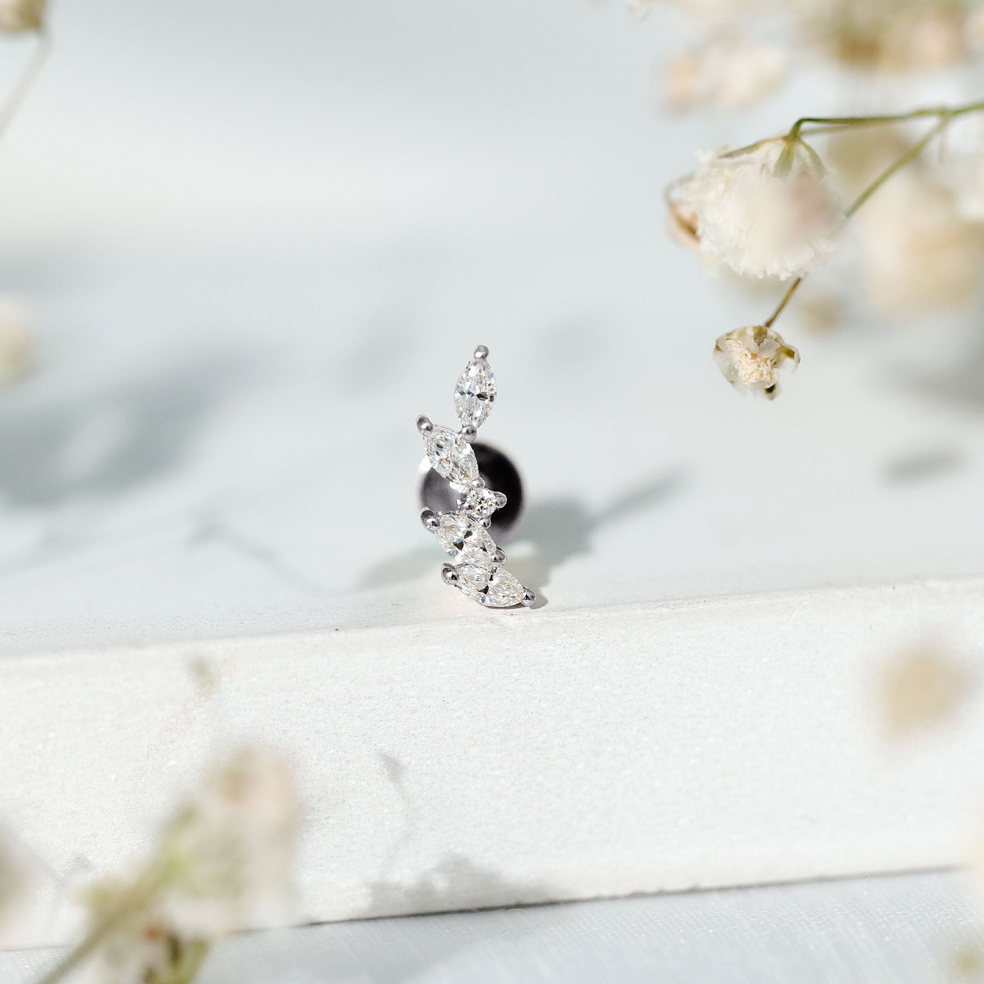 The leaf-inspired layout arranges marquise diamonds in a flowing pattern that mimics natural foliage. This structure allows the earring to sit along the ear rather than hang downward, offering a streamlined profile. The setting secures each diamond while maintaining a delicate appearance suited for curated ear styling.