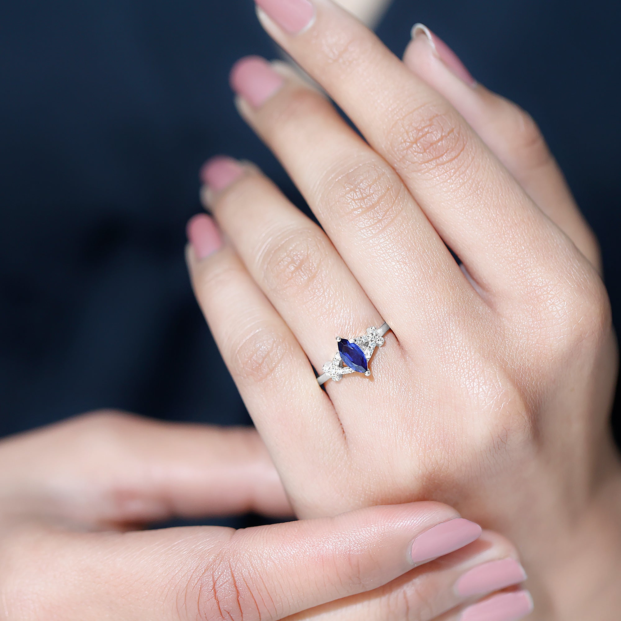 Explore the captivating allure of this Engagement Ring, featuring a marquise-cut created blue sapphire while the dainty diamonds sparkle on the unique shank. This stunning created blue sapphire ring captures the essence of elegance and sophistication, making it an ideal ring for an engagement, or a wedding day. Surprise your better half by gifting our sapphire ring on this wedding anniversary and make her fall for you again.