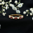 The modern appearance of this Ruby Eternity Ring makes a perfect classic wedding or anniversary band ring for the one close to your heart. Having a sparkling Marquise Shape Ruby in East West Style and Round Moissanite in a Half Eternity pattern gives a superb touch to this ring. A subtle design with exclusive sparkle is sure to steal your heart. Either a commitment, a promise or a birthday making a stunning present that intensifies the radiance and creates a unique reflection pattern. Graceful and timelessness this Ruby Anniversary Ring has a red brilliant color that has an aesthetic appearance and contemporary appeal. Truly a symbol of elegance this Ruby Moissanite Ring has a gorgeous delicate milgrain framing sit atop of a band.