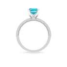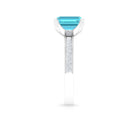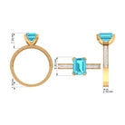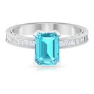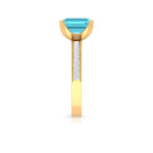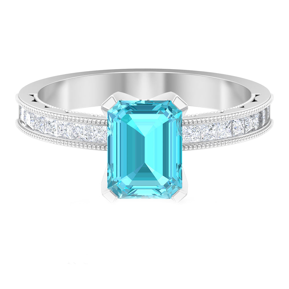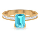 It is a Milgrain Ring for Women, set in Solid Gold featuring an Emerald Cut Swiss Blue Topaz as Solitaire embellished in Prong Setting with Princess Cut Diamond as Side Stone embellished in Pave Setting, only for you.