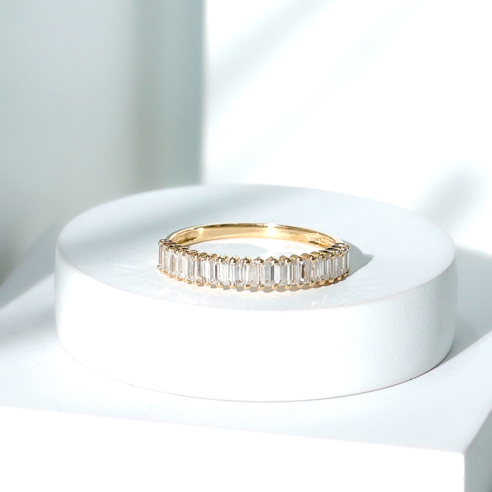 This minimalist half eternity ring features shimmering baguette cut cubic zirconia set in a shared prong setting. The simple yet sophisticated design is perfect for everyday wear or as a stackable piece with other rings. The gleaming gold band holds the sparkling stones in place, showcasing the gems stunning clarity and fire. This simulated diamond ring is an effortless way to add a touch of sparkle to your look and is sure to become a timeless addition to your jewelry collection.