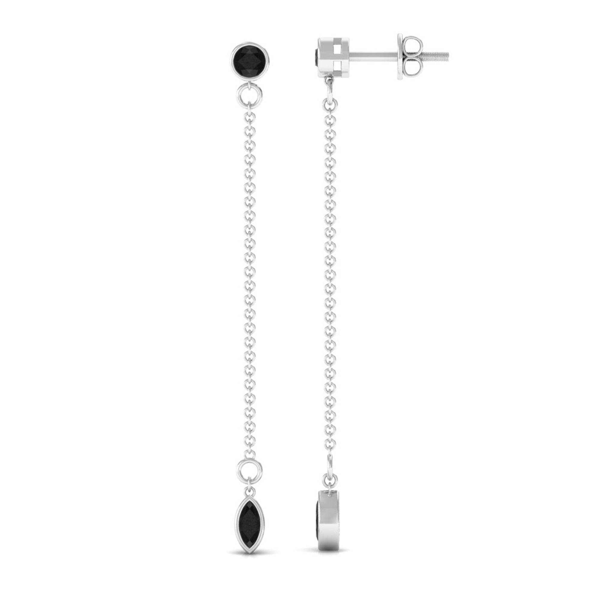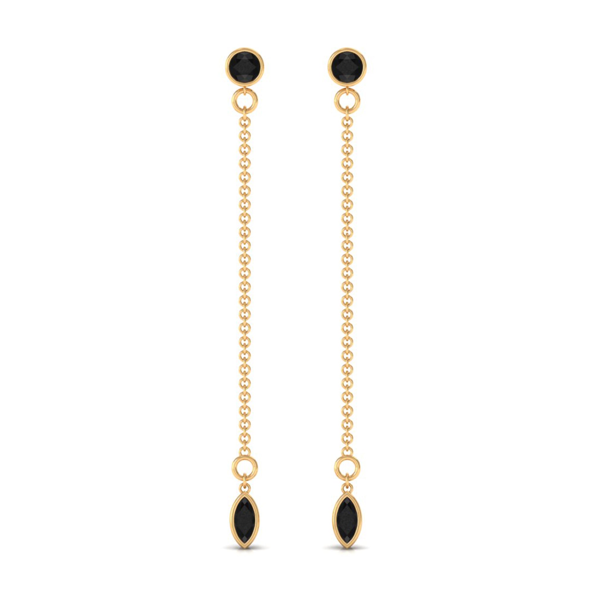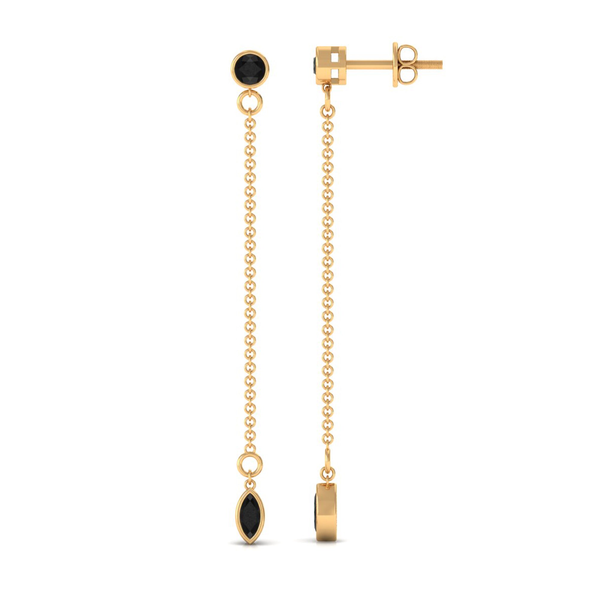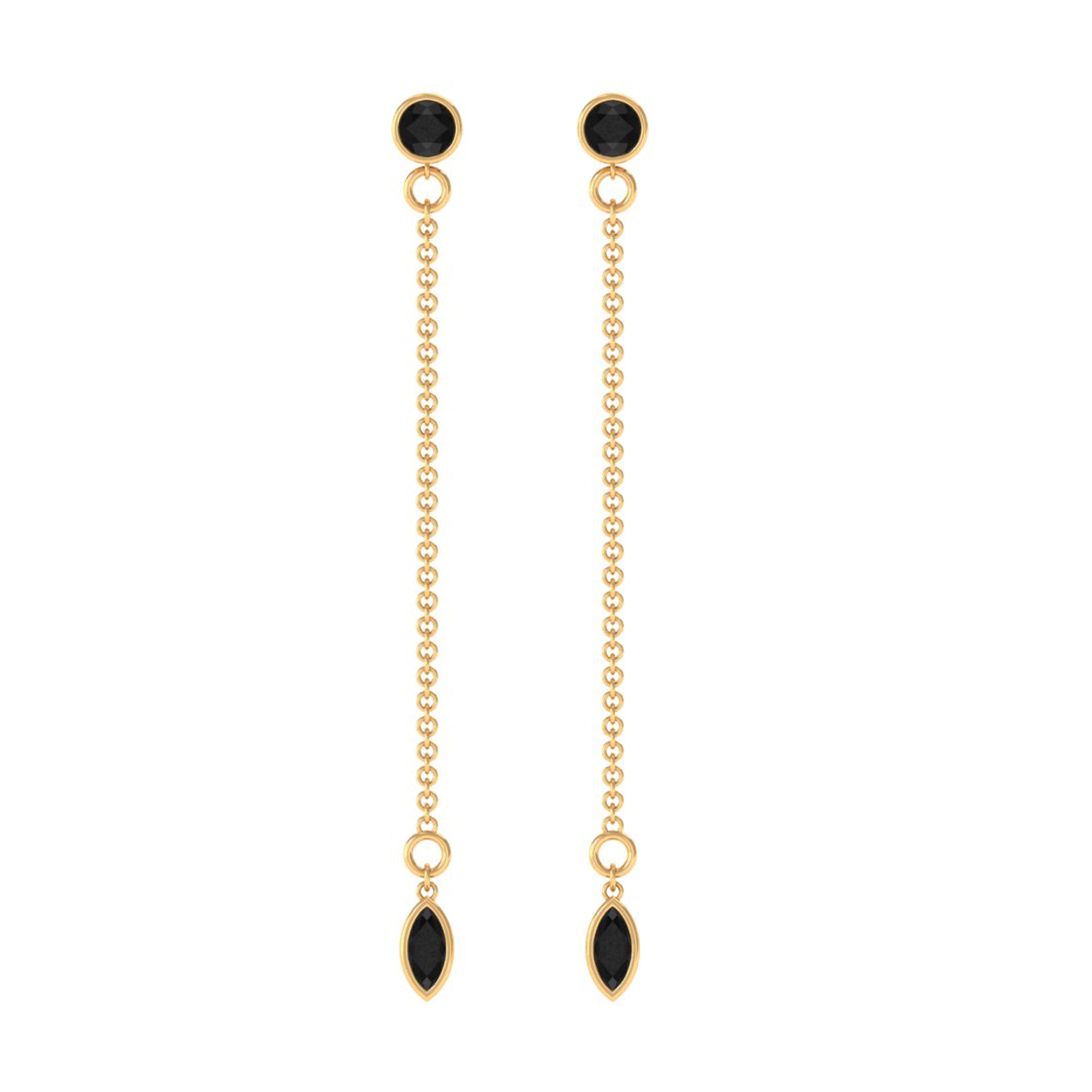 Enhance your beauty with these graceful Dangle Chain Earrings adorned with a combination of Bezel Set Marquise and Round Created Black Diamond, perfectly complementing your look. These earrings are sure to add a touch of elegance and charm to your overall appearance.