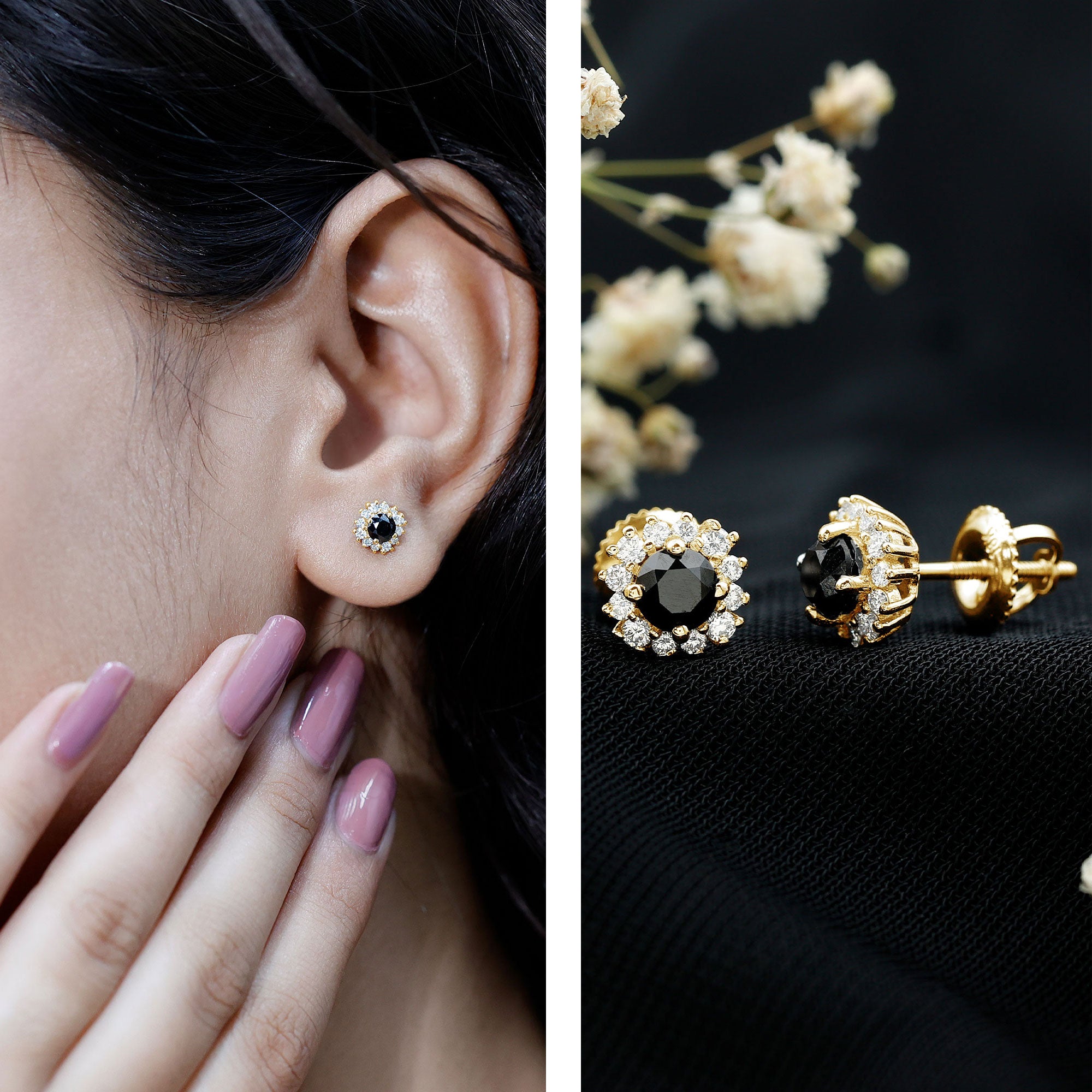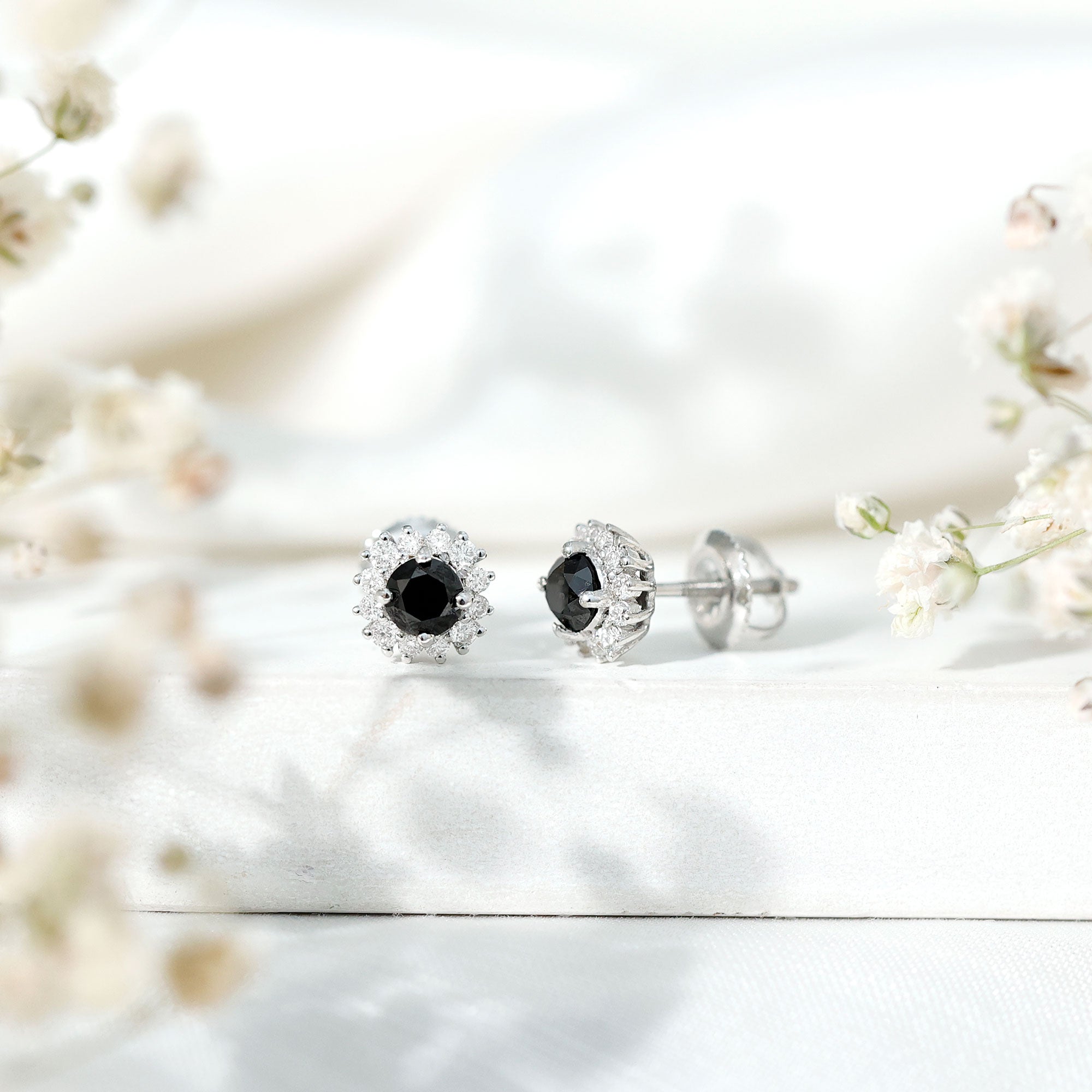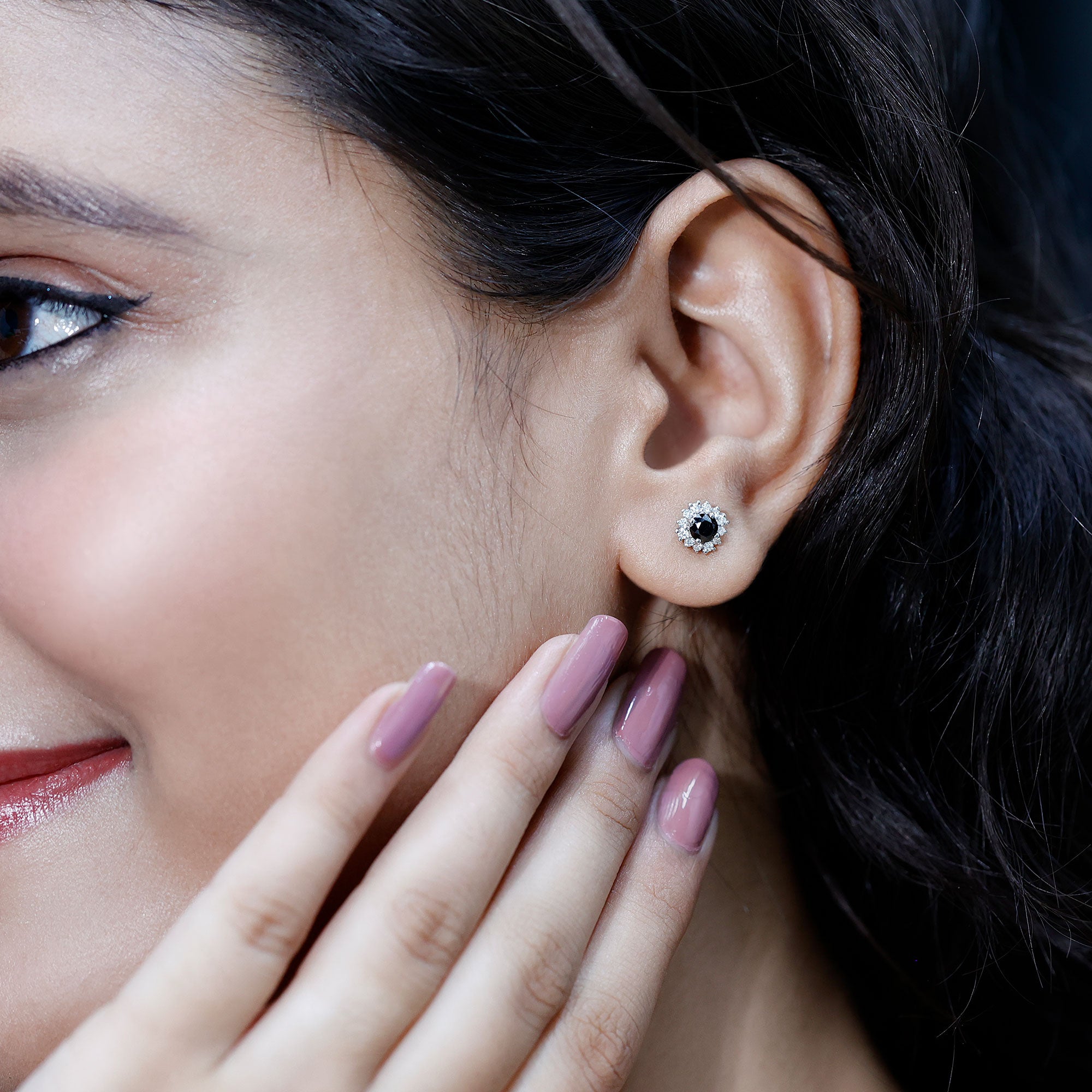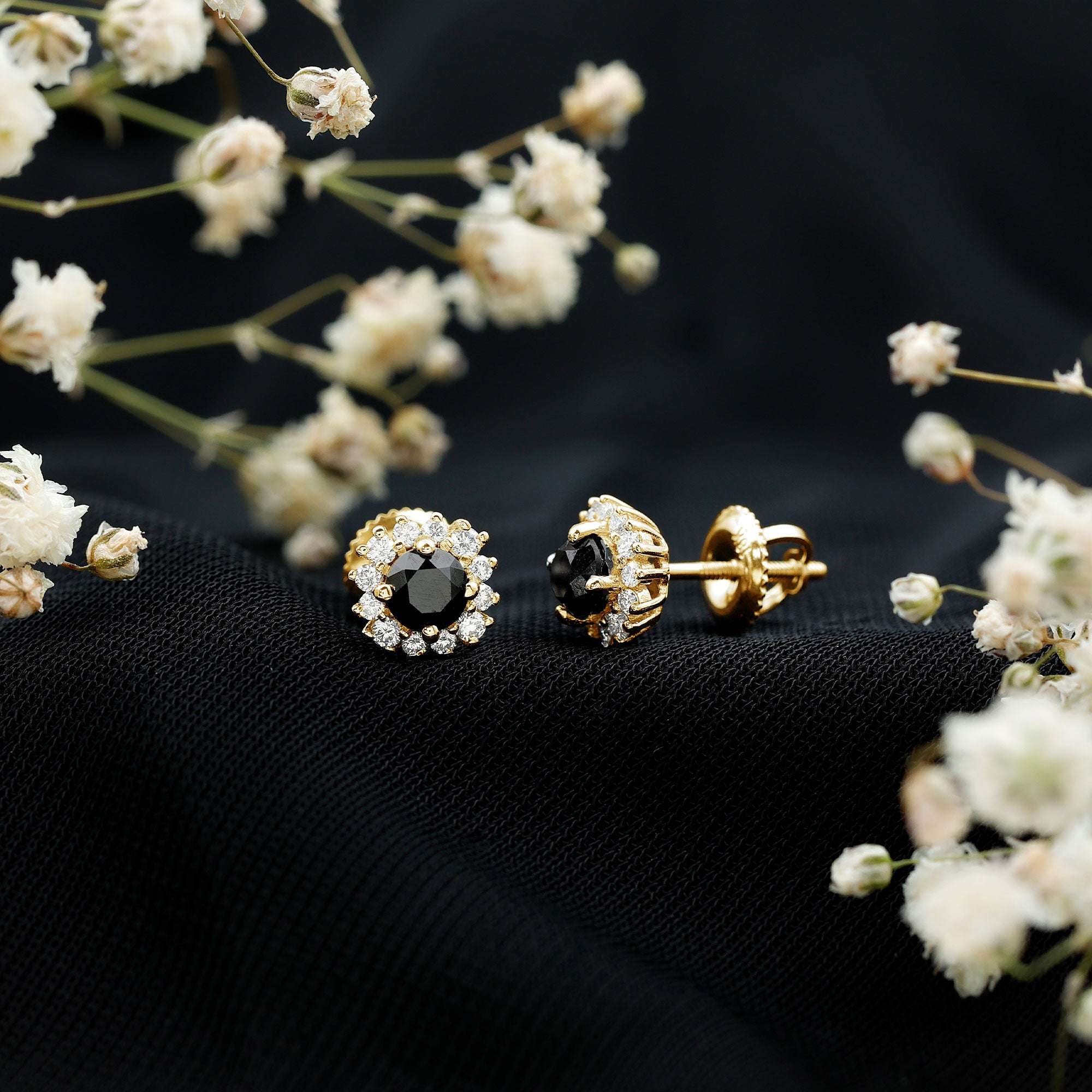 Give her a stunning surprise with these elegant Black Onyx Earrings. It features a Round Shape Black Diamond gemstone securely cradled in a prong setting. The addition of a dazzling Diamond halo on these stud earrings ensures they effortlessly catch the eye.