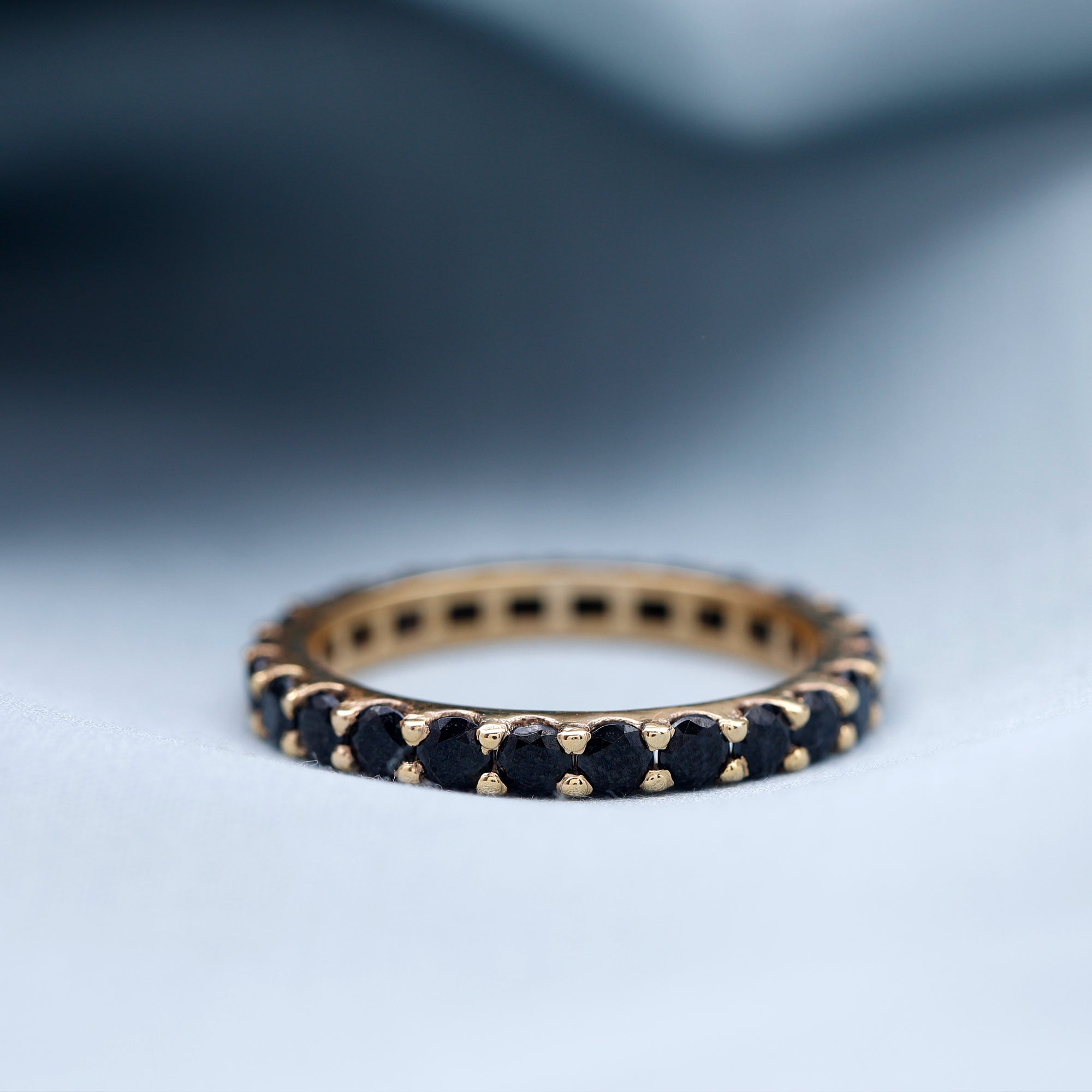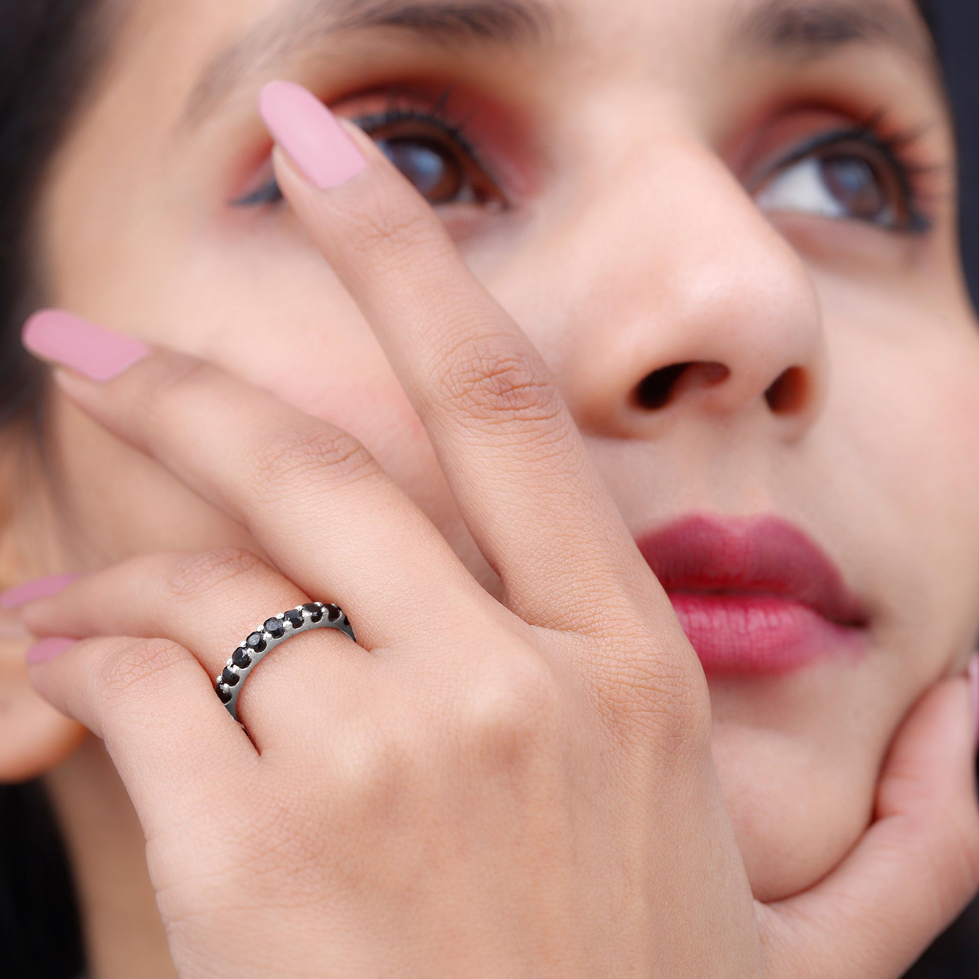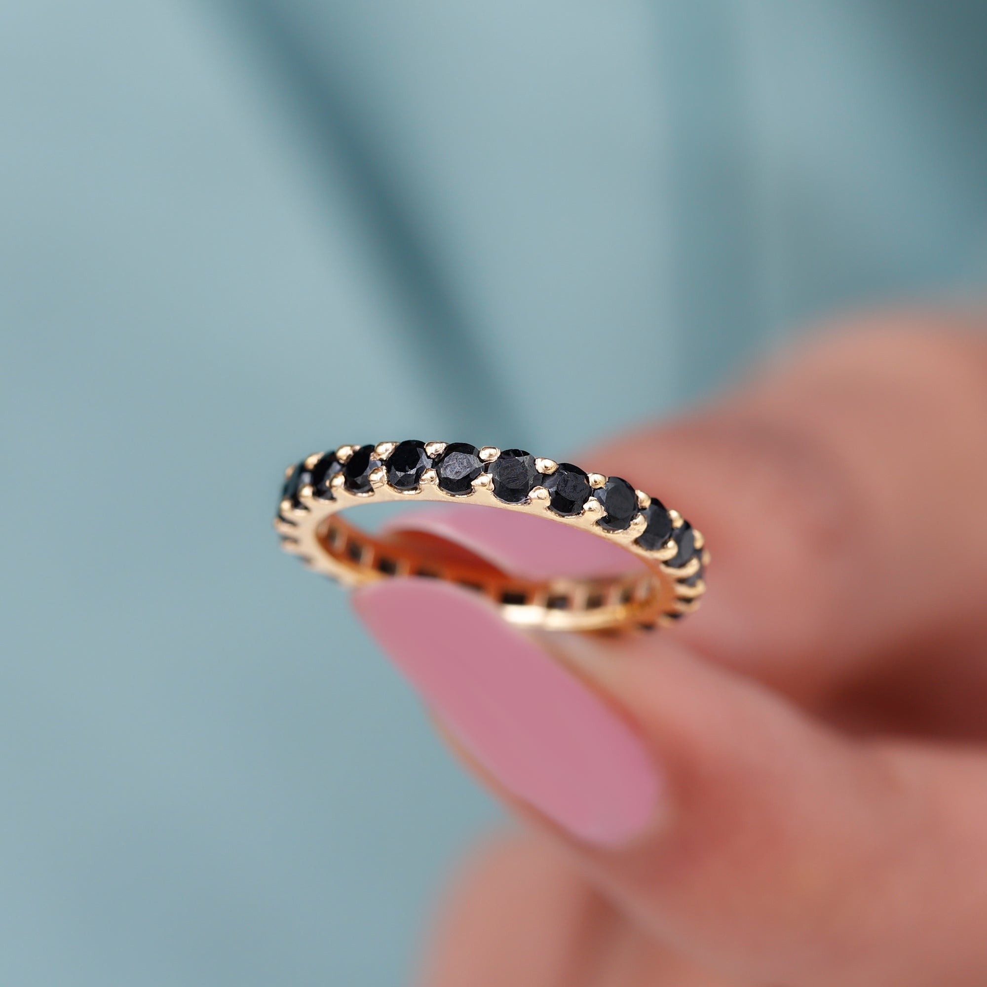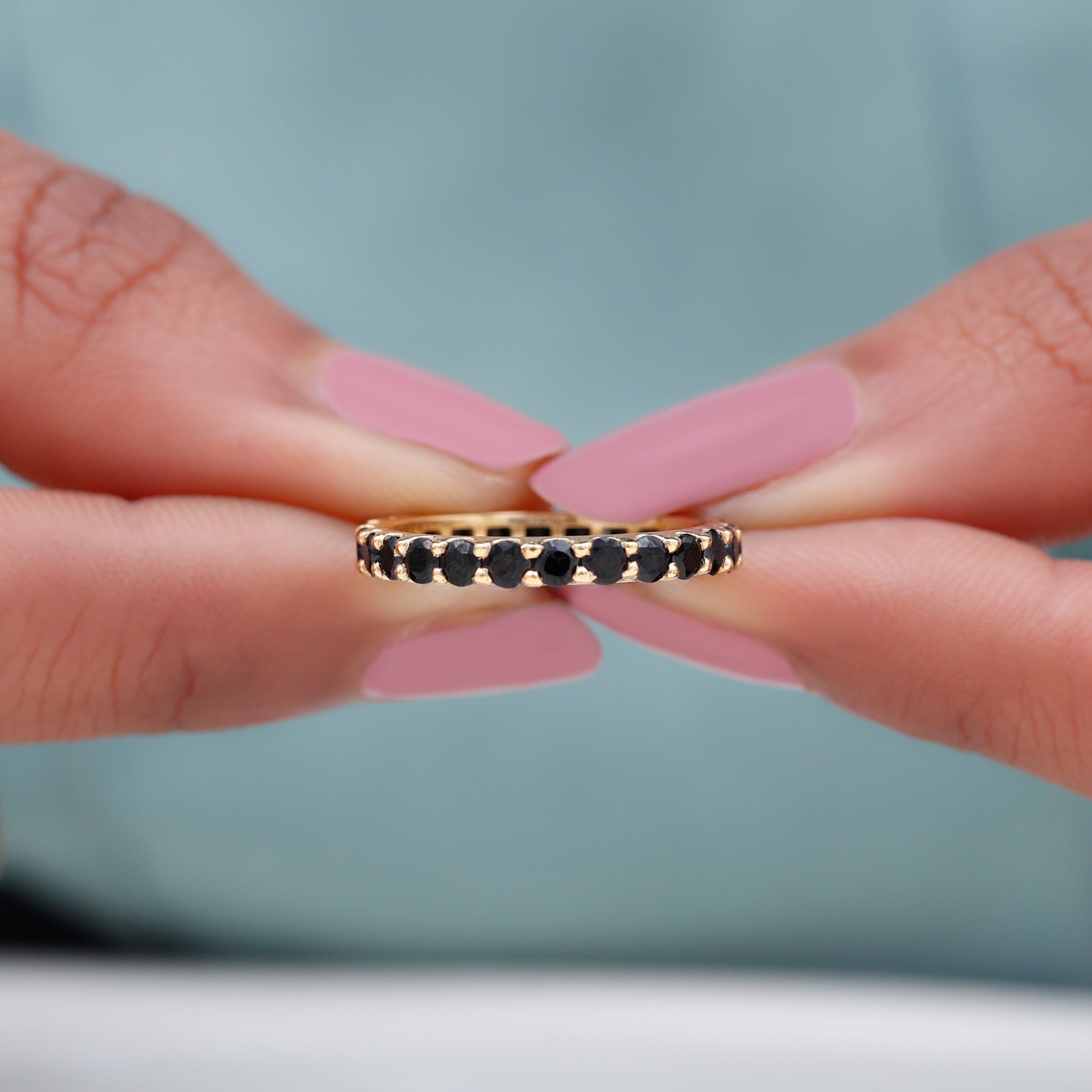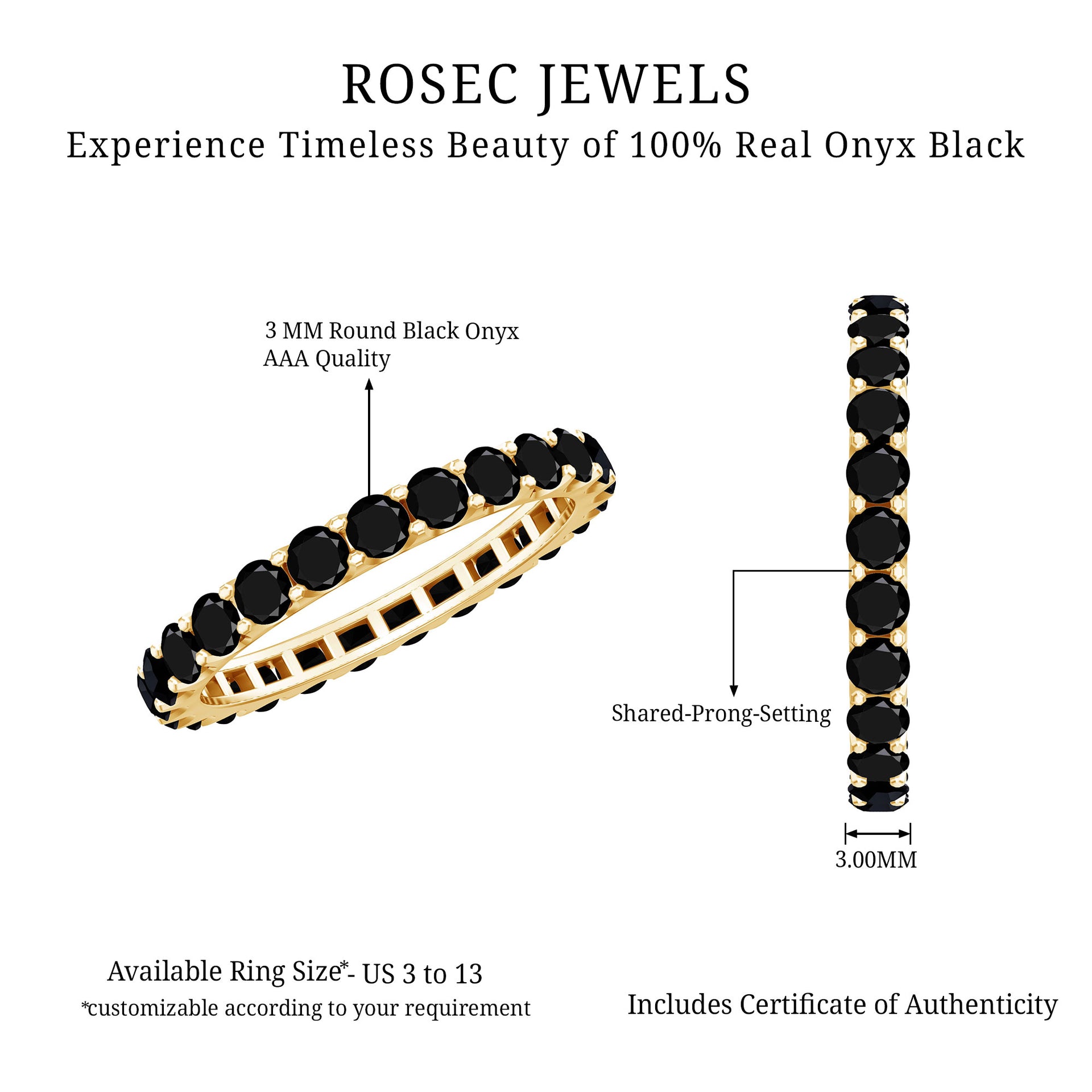 Timeless elegance meets modern design in this striking Full Eternity Band, designed for everyday wear and lasting impact. Set with 3 MM round cut black onyx stones all around the band, held securely in shared prong setting, creating a smooth and seamless flow of sparkle around the finger. Ideal for stacking or wearing solo, this Black Onyx Wedding Band adapts to your style, whether minimal or layered. The continuous circle of black onyx symbolizes never-ending love, strength, and connection, making it a meaningful choice for a wedding band, anniversary ring, or simply a bold new addition to your collection. It features AAA quality black onyx stones, selected for their intense color and polished finish. Built for both beauty and durability, the setting ensures the stones stay secure while maintaining a lightweight, comfortable feel for daily wear. With a variety of metal options available, you can customize the look to suit your personal taste. Available in US ring sizes 3 to 13, it offers the perfect fit for any hand. This Onyx Eternity Band makes a thoughtful gift for someone special or a powerful statement piece for yourself.