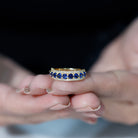 Celebrate your anniversary in style and show your queen how much she means to you with this magnificent half eternity ring. Adorned with regal gemstones including created blue sapphire and Diamond, this stunning anniversary band ring is fit for royalty. Crafted from solid gold, it is the perfect way to express your love and appreciation for your partners grace and beauty.