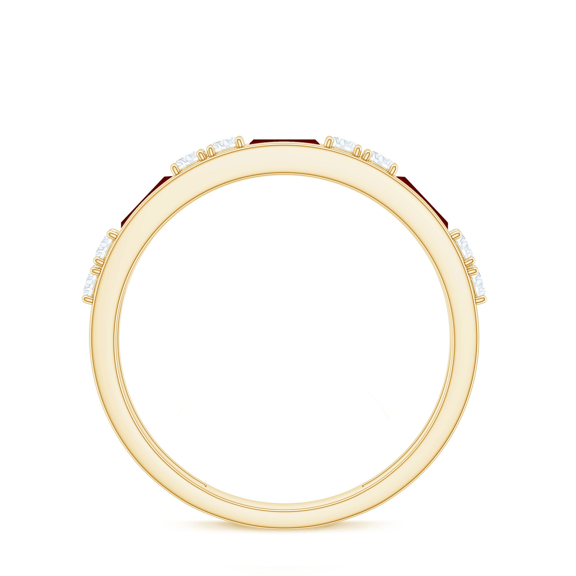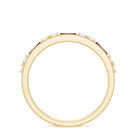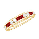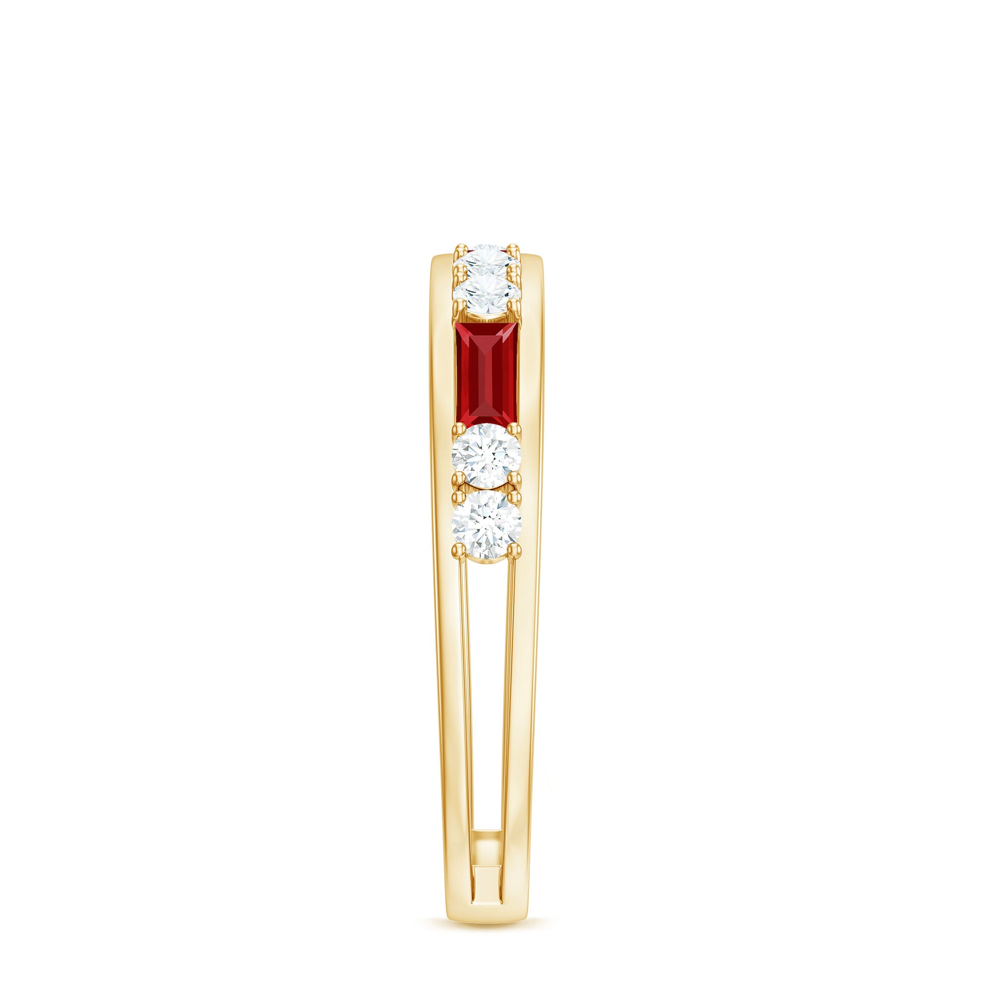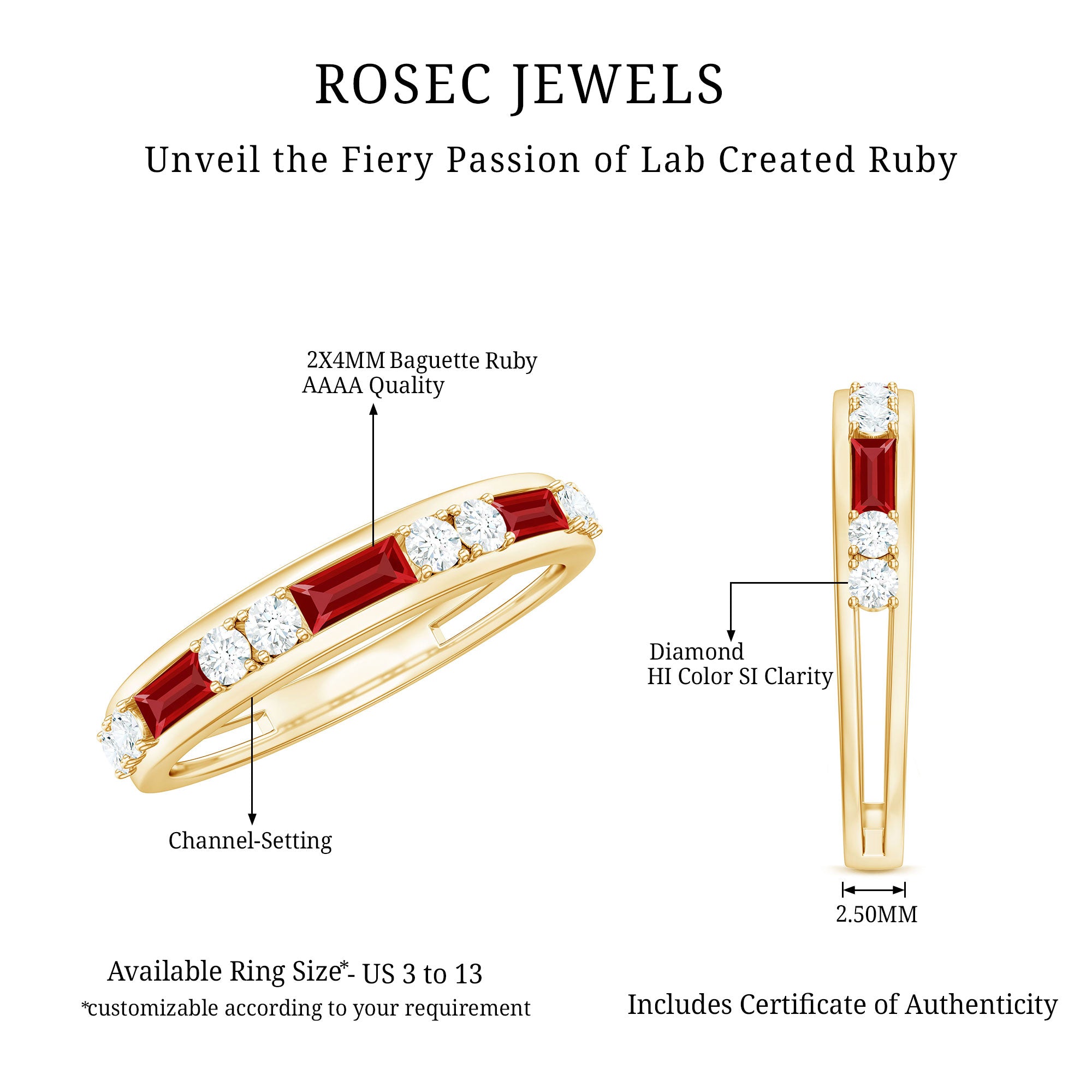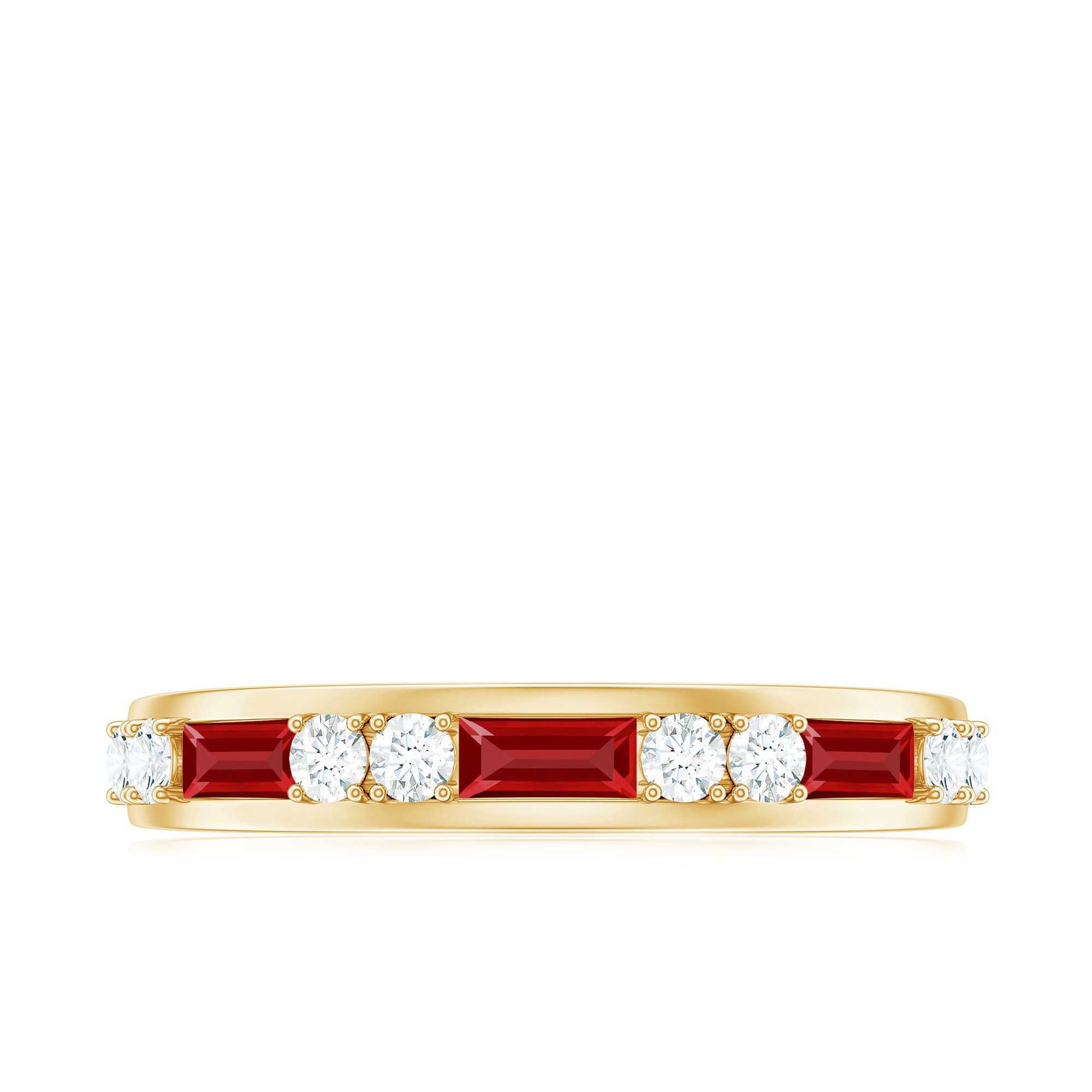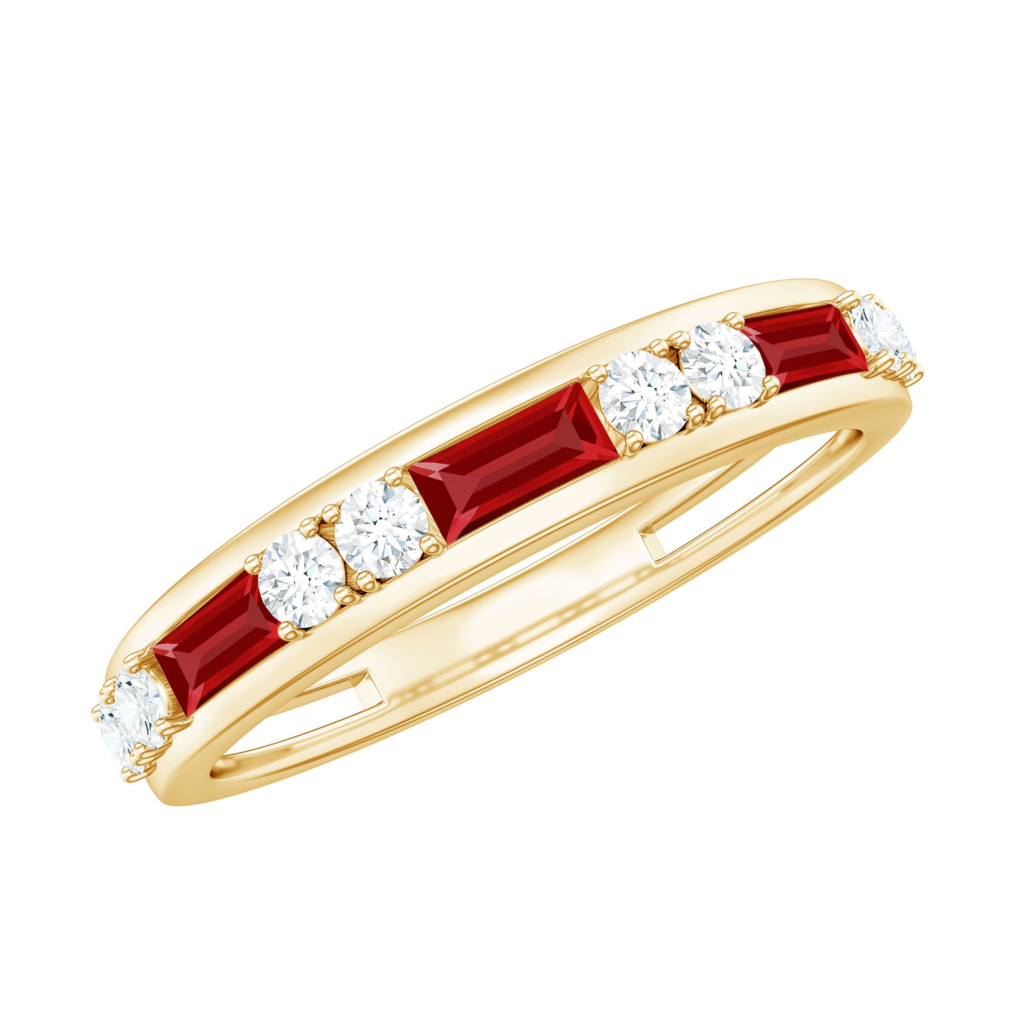 Add a touch of elegance to your look with this Minimal Half Eternity Band Ring. The ring features a minimalist design with alternating baguette cut created ruby in a channel setting and Round Shape Diamond in a prong setting. The gems are expertly crafted in gold, giving the ring a timeless appeal. This Half Eternity Band Ring is the perfect choice for anyone looking for a simple yet stunning piece of jewelry. Whether youre looking for an everyday ring or something special for a special occasion, this ring is sure to impress.