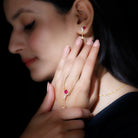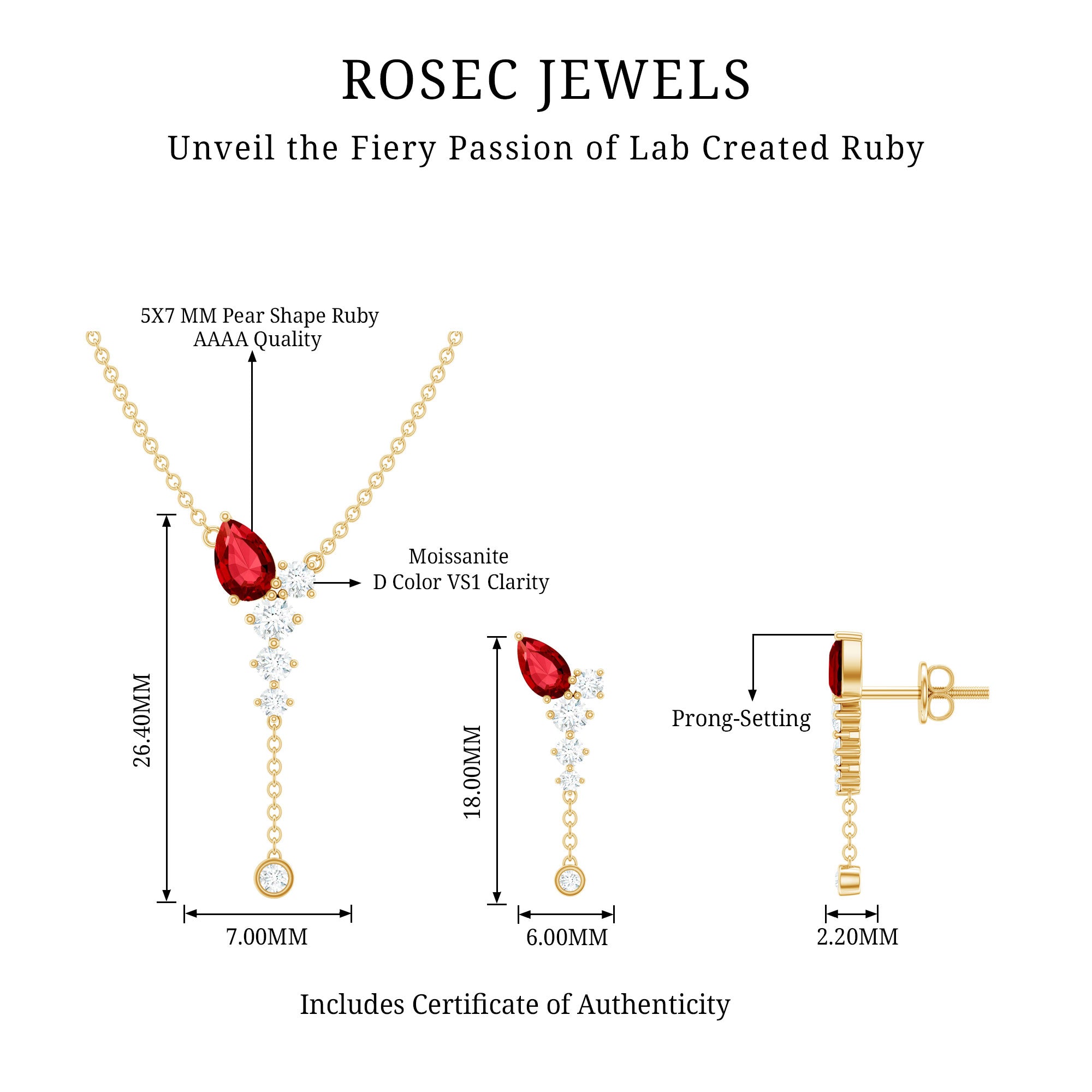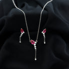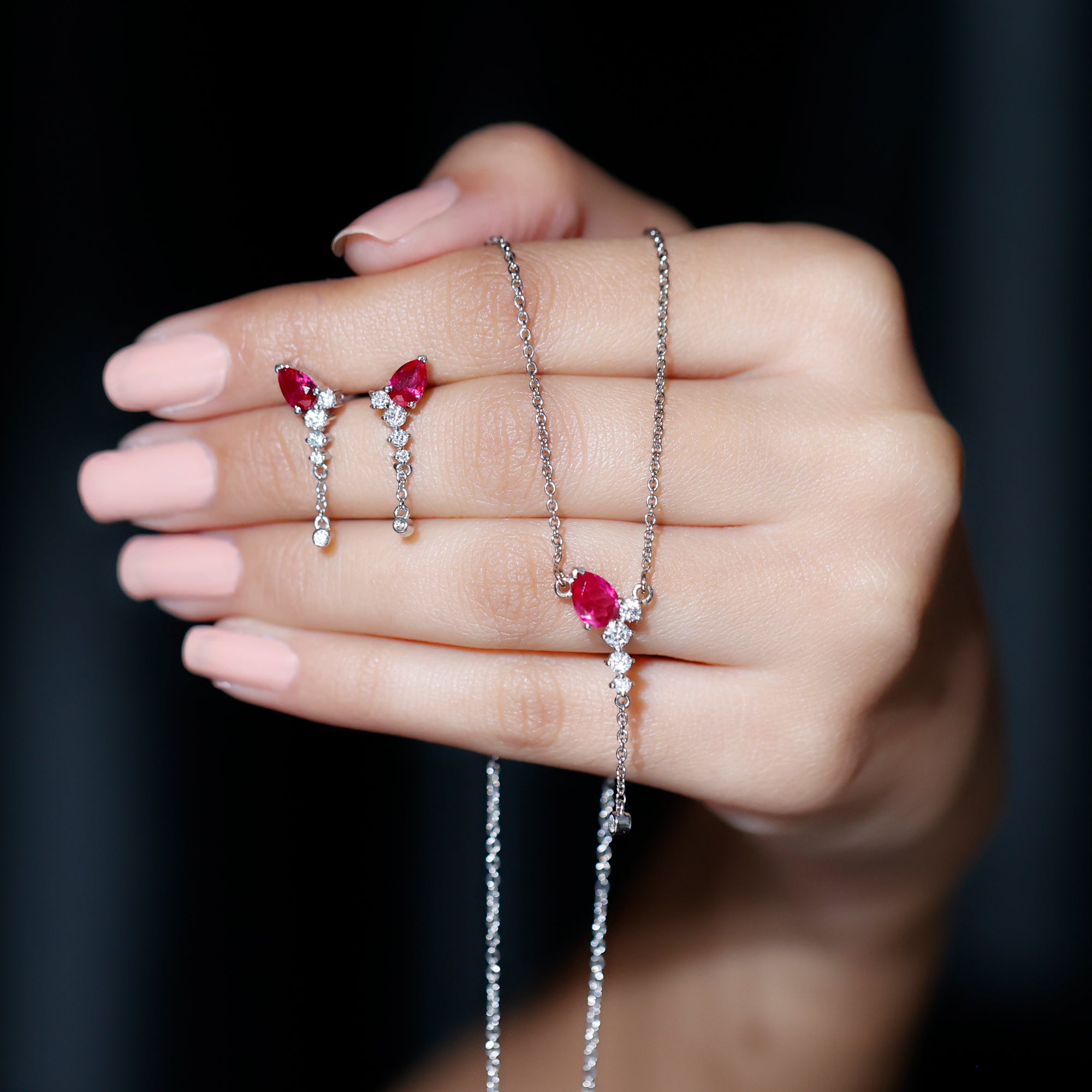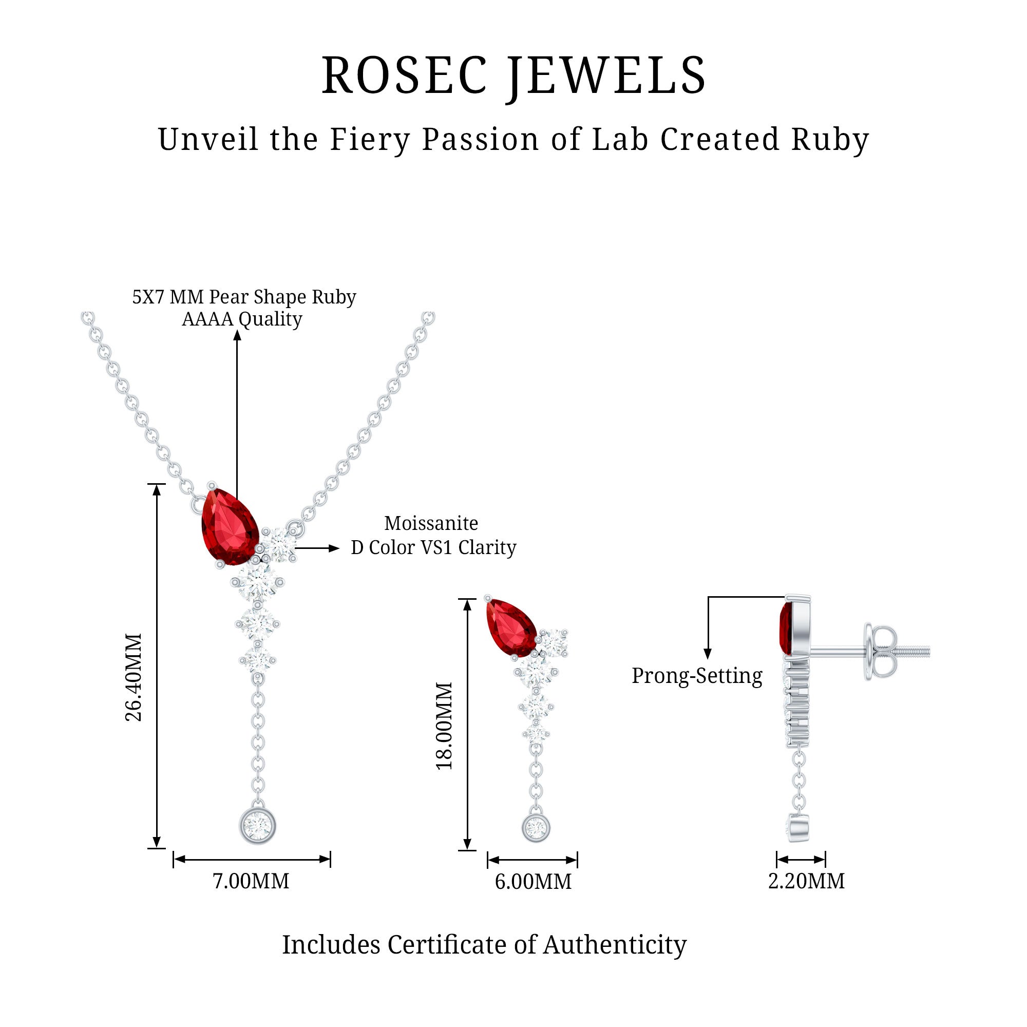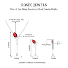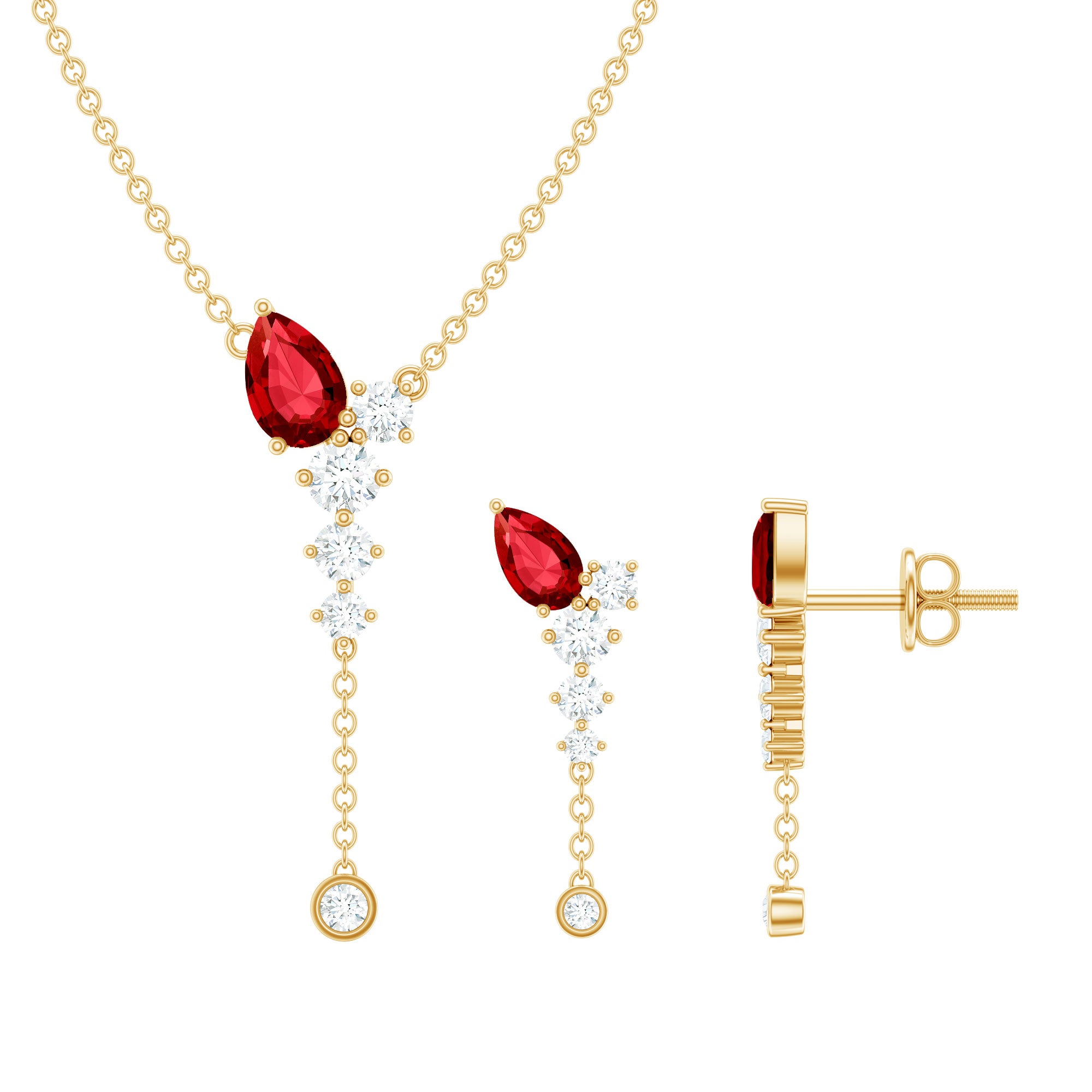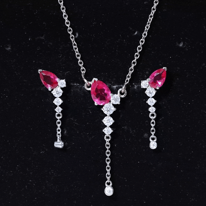 If youre seeking the ideal minimalist jewelry set to enhance your special event ensemble, search no more. The breathtaking Created Ruby Jewelry Set is here for you. This set comprises a Y Necklace and Earrings, incorporating a blend of Pear Cut Created Ruby and Round Cut Moissanite stones that will undoubtedly catch everyones attention. The simple yet elegant design of this Dangle Jewelry Set will lend a touch of refinement to any attire.