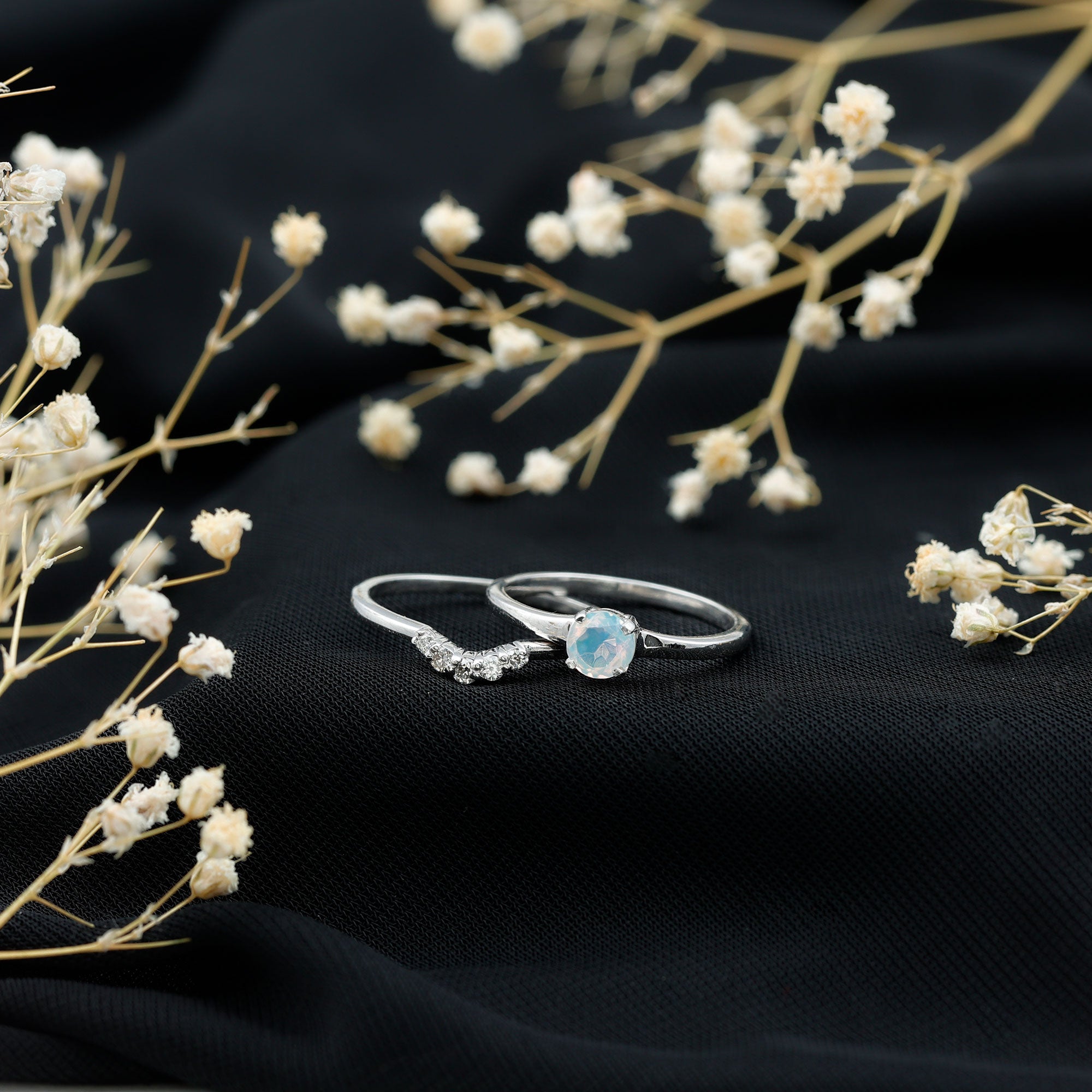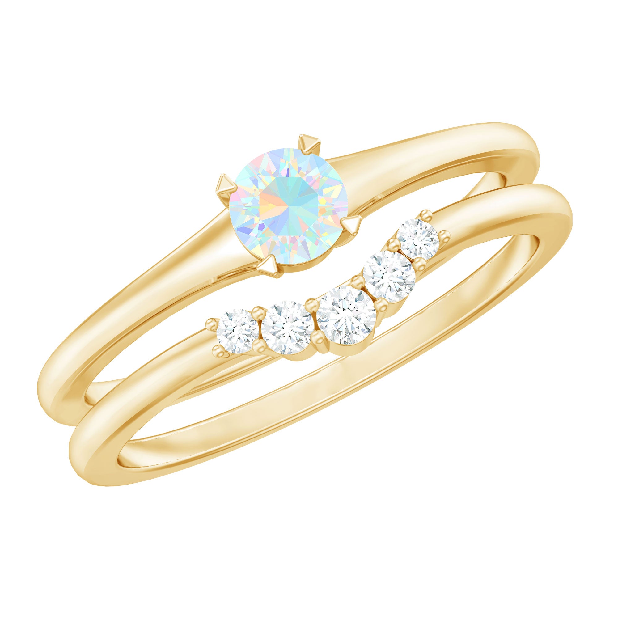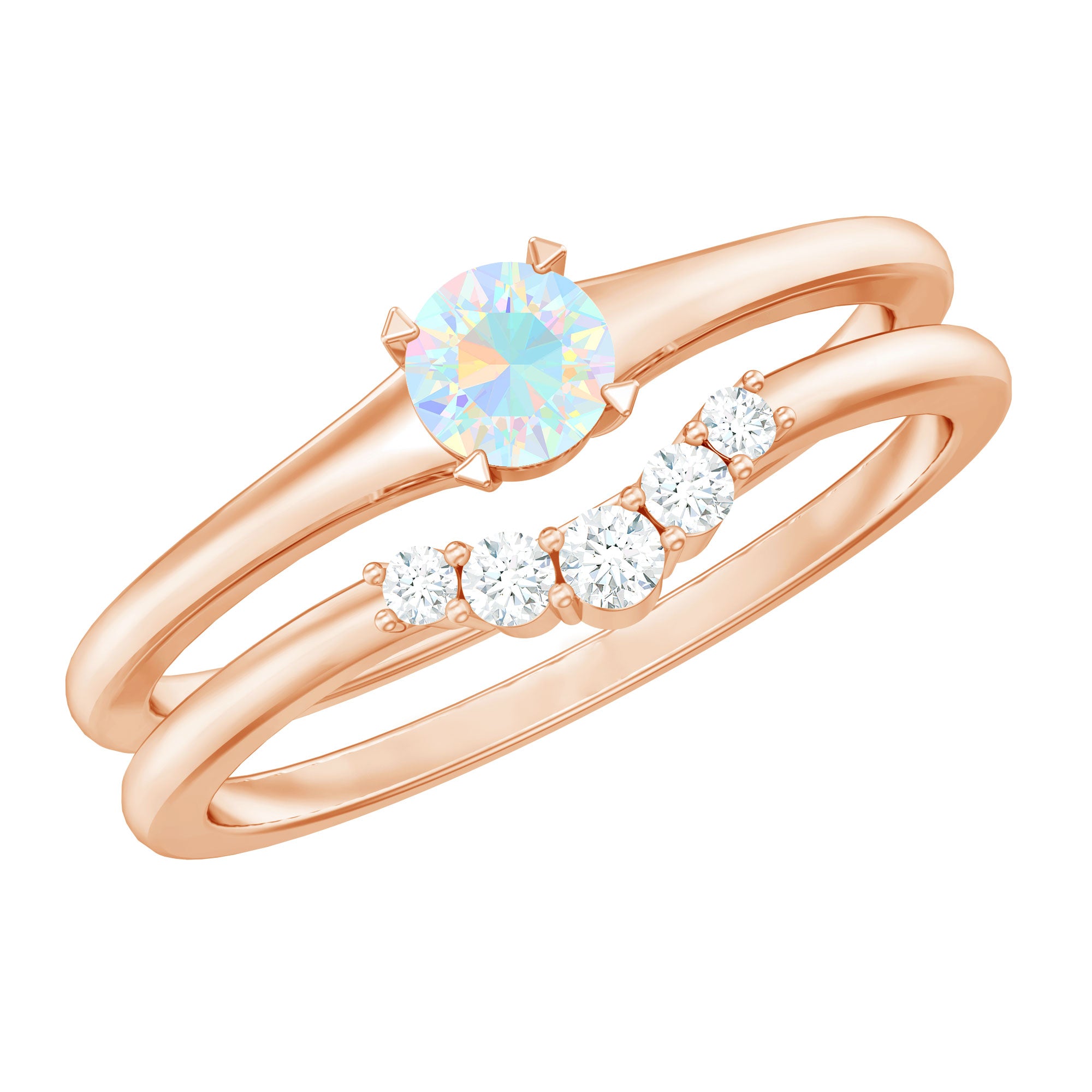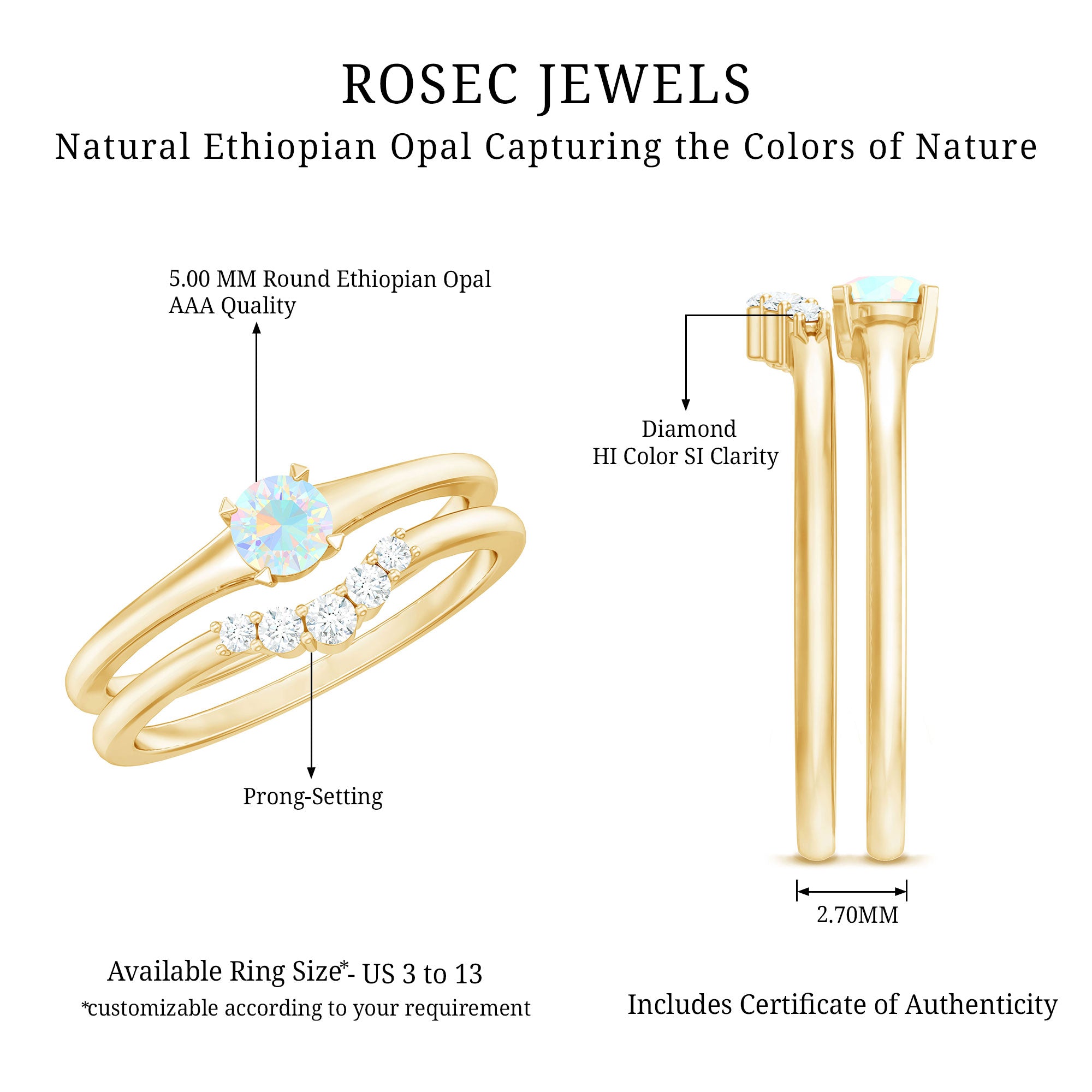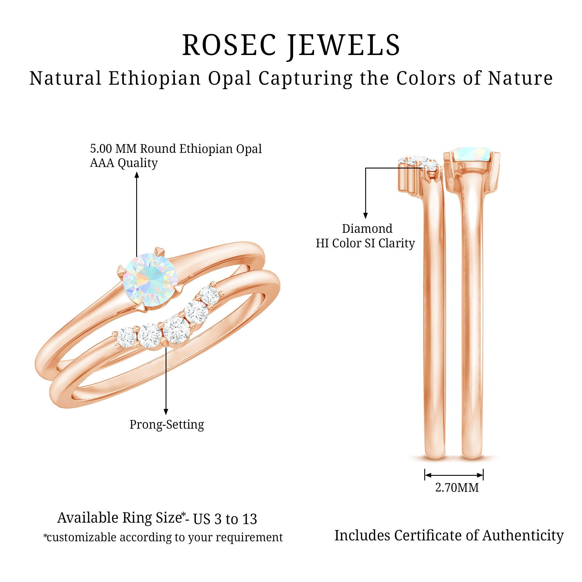 Celebrate your love story with a fresh twist on timeless simplicity with this Minimal Promise Ring Set. At the center of the Proposal Ring, a radiant 5 mm Round Shape Ethiopian Opal shines with an ethereal play of colors that dance with every movement. This 2 Piece Ring Set pairs the captivating glow of the opal with a beautifully Curved Enhancer Ring, delicately studded with sparkling Diamond stones that wrap around the finger like a shimmering embrace. Together, they create a harmonious blend of modern minimalism and subtle luxury, perfect for symbolizing a promise that is both personal and profound. The sleek design ensures effortless wear, while the unique combination of Opal and Diamond stones adds a pop of color and brilliance that stands out in the best way. Offered with a stylish jewelry box and available in various sizes, this Promise Engagement and Wedding Ring Set is ready to mark any special occasion or everyday moment with meaningful sparkle. Whether you are sealing a promise or simply treating yourself, this Opal Engagement Ring Set is an elegant reminder that true beauty lies in simplicity and heartfelt intentions.