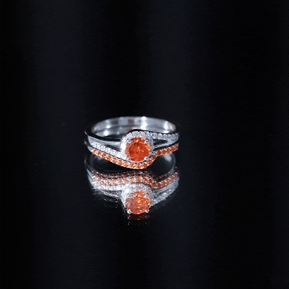 This Engagement Ring with Enhancer is embellished with Round Shape Created Orange Sapphire set at the center and encircled with Round Shape Diamond more Diamond is set on the split shank and the Enhancer Ring is encased with Round Shape Created orange sapphire stones.