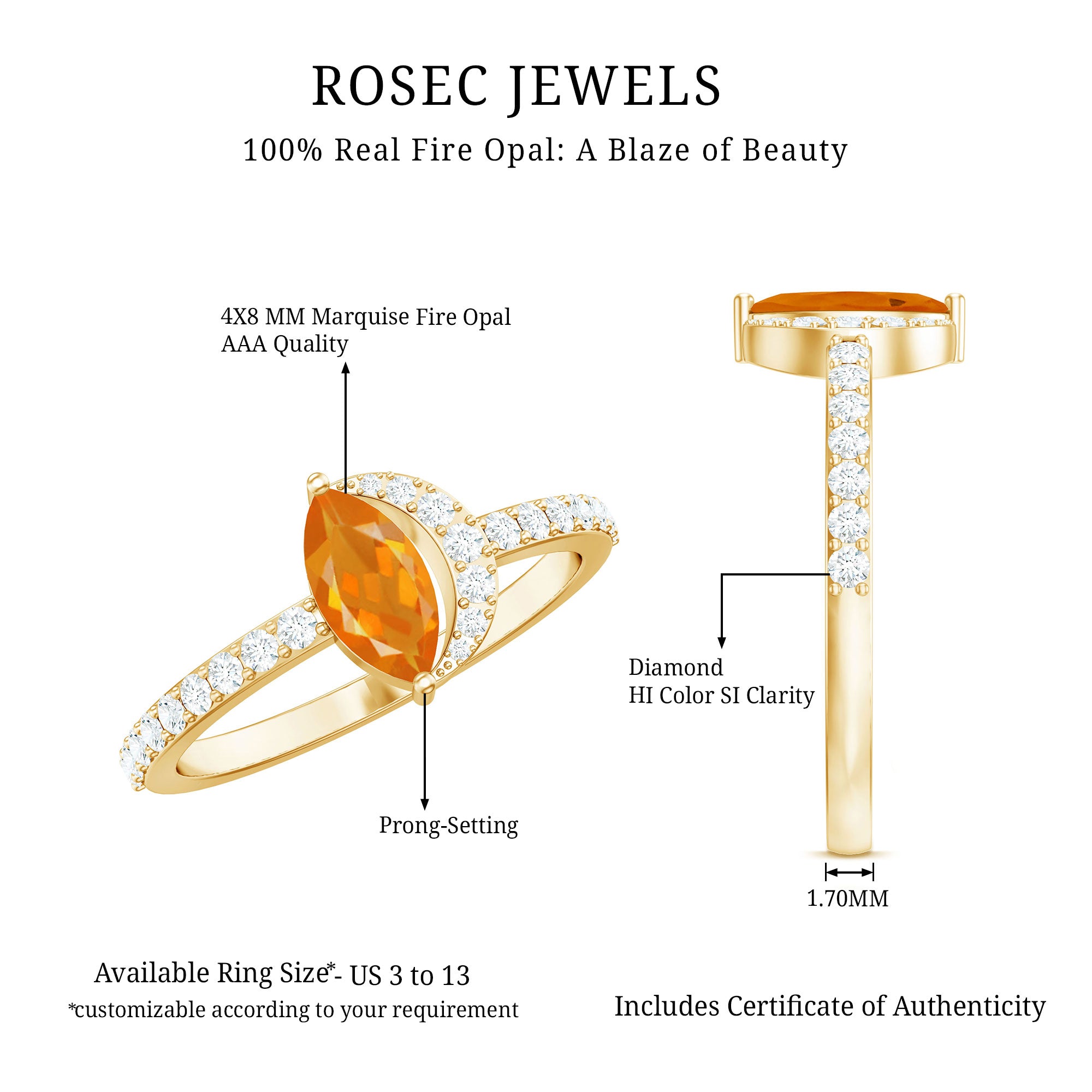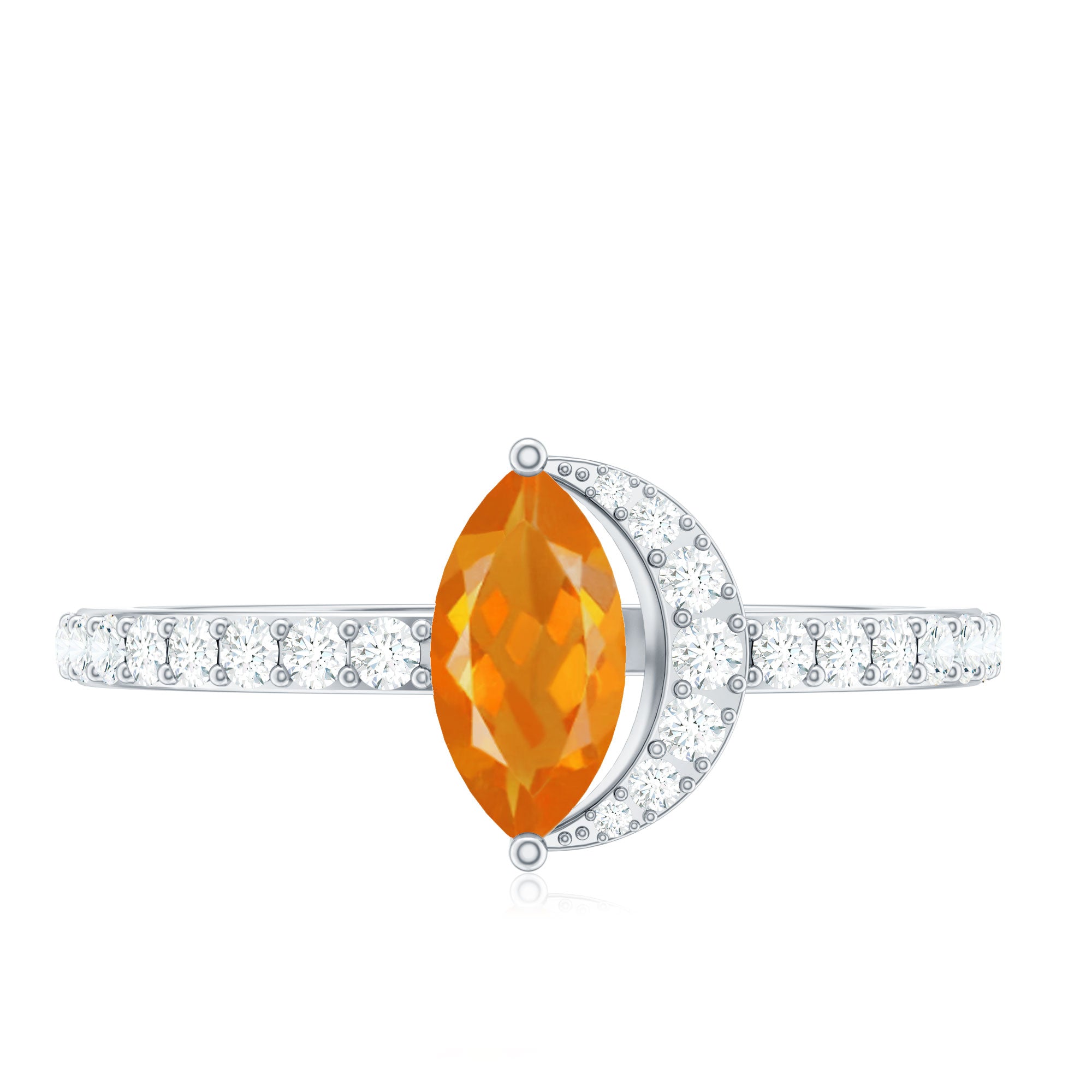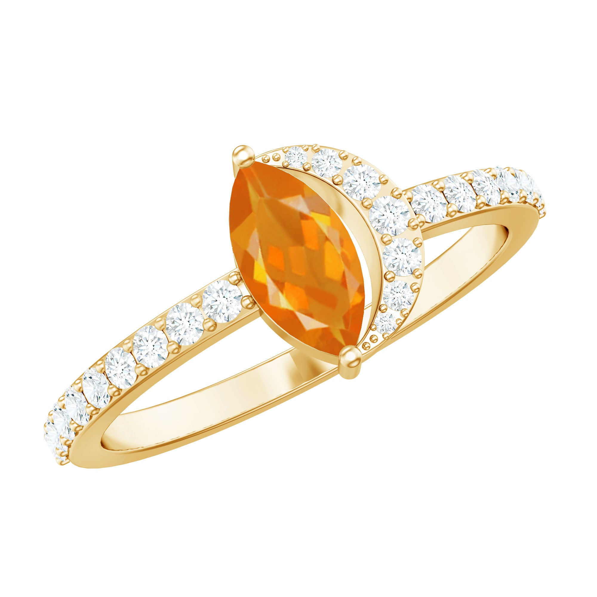 Youll make the night younger than ever with this lovely Marquise Engagement Ring. The engagement ring is adorned with a Marquise Cut Fire Opal as a solitaire set in a prong setting with a Round Diamond Accent. This Fire Opal and Diamond Ring is crafted using gold metal.