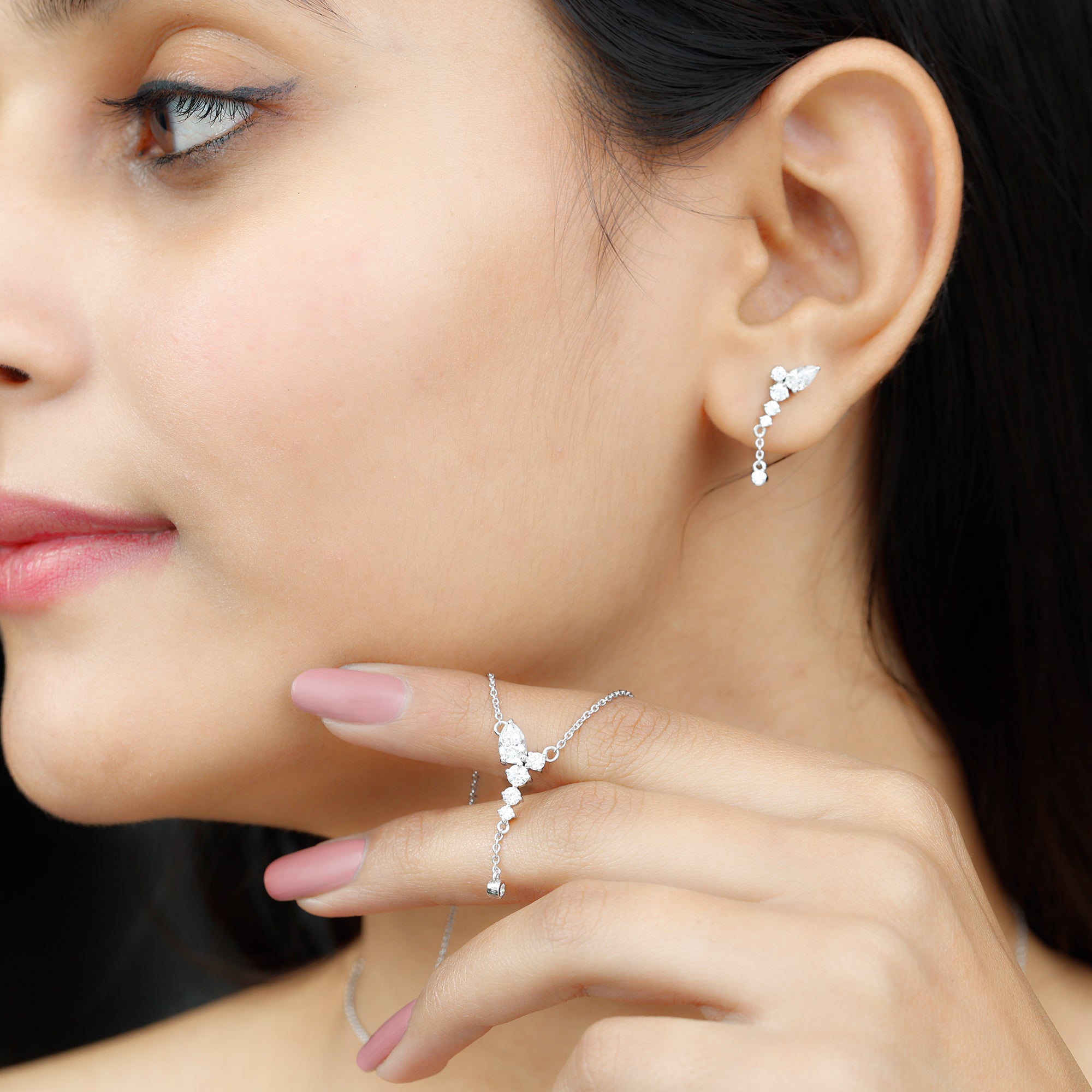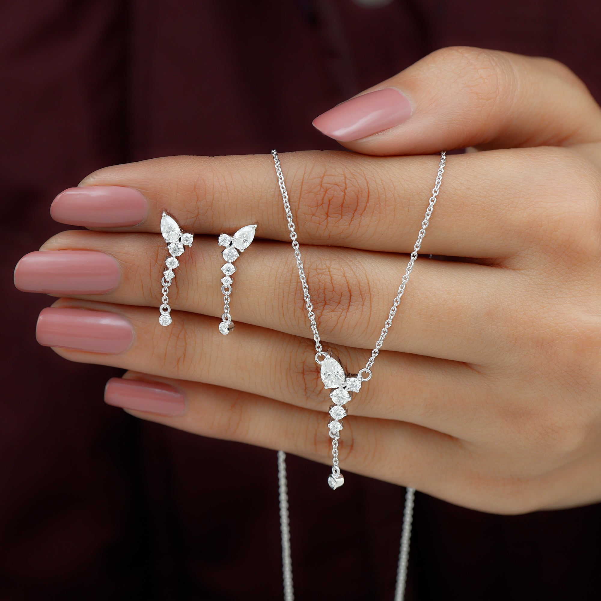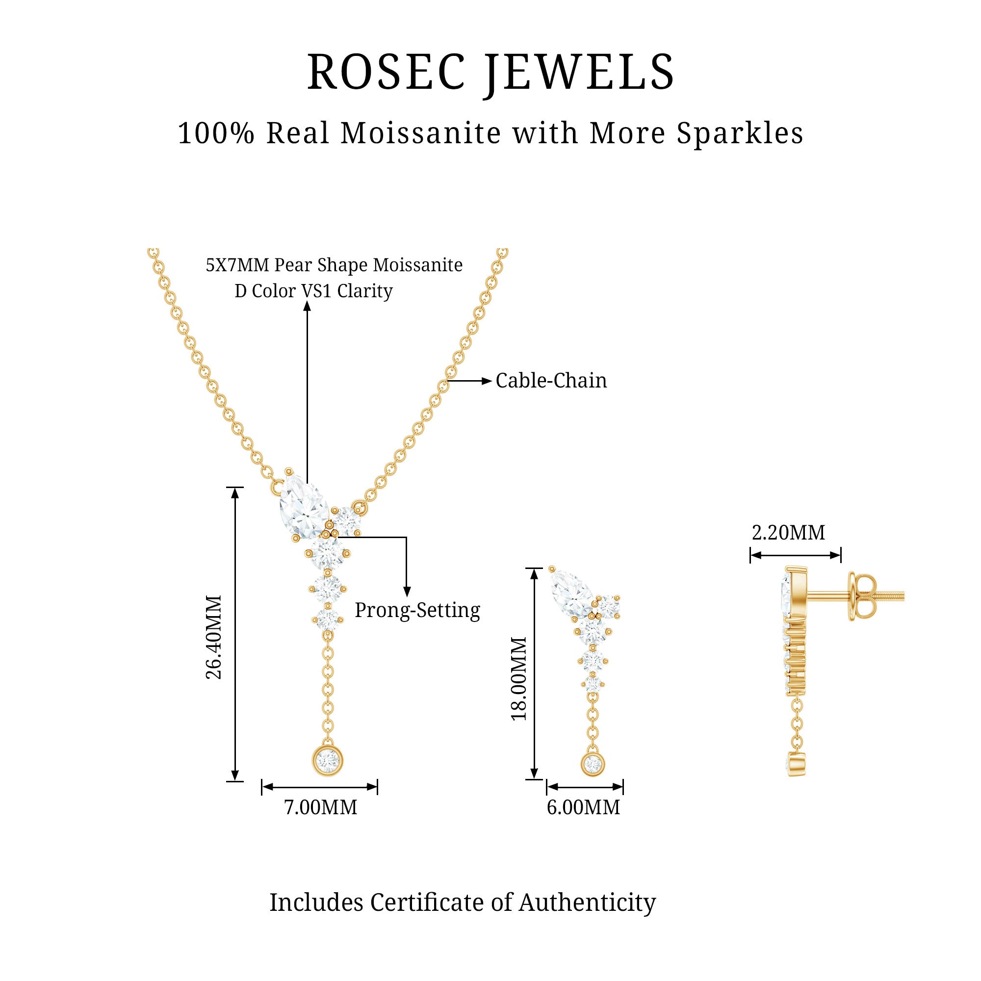 Looking for the perfect minimal jewelry set to elevate your special occasion look? Look no further than this stunning Moissanite Jewelry Set. Featuring a combination of Pear and Round Cut Moissanite stones, this Y Necklace and Earrings Set is sure to turn heads. The minimalist design of this Dangle Jewelry Set adds a touch of sophistication to any outfit. With a total weight of 1.75 Carat and D-VS1 quality certification, you can trust that all of the gemstones in this set have undergone rigorous quality checks to ensure their beauty and durability.