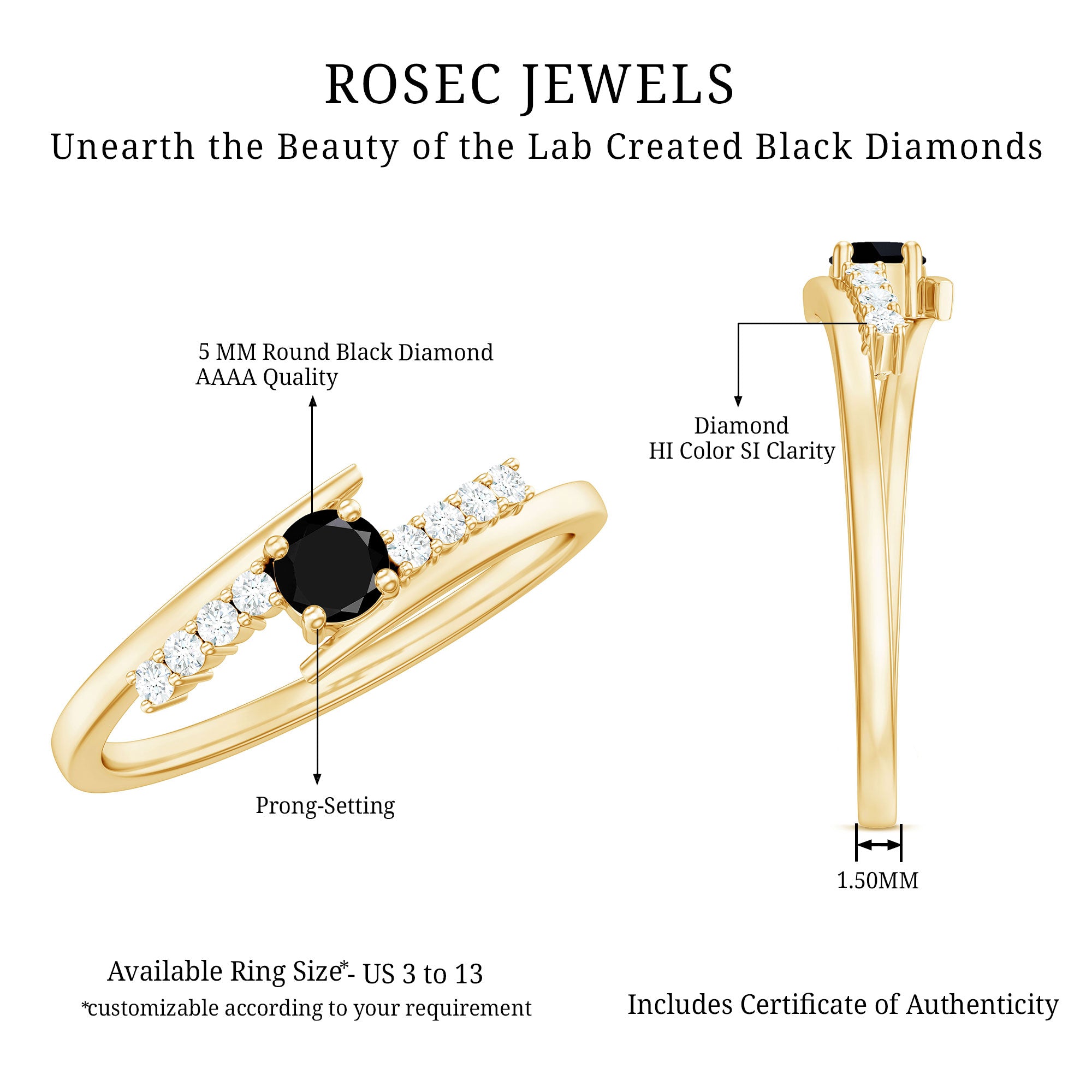 Elevate your style with this gorgeous Minimal Bypass Ring featuring a round-cut created Black Diamond as the center stone in a prong setting, accented by Diamond-studded on the bypass shank. Crafted in gold, this minimalist promise ring will add a touch of elegance to your look.