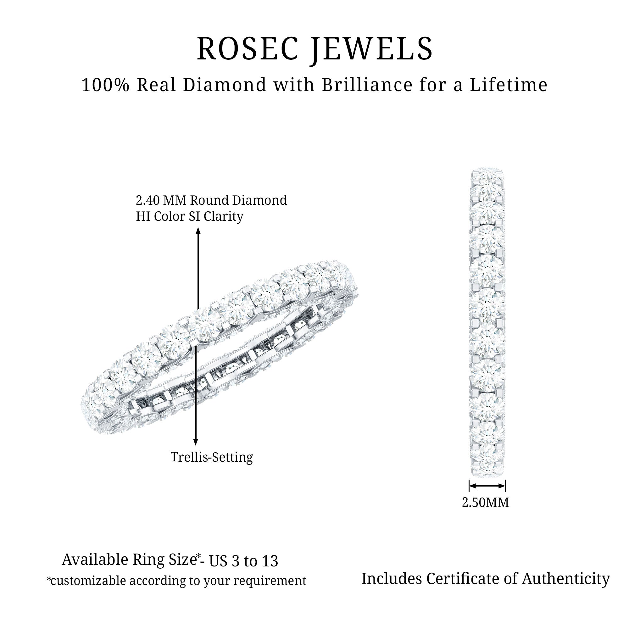 No matter what your style, the Minimal Round Diamond Eternity Ring is a beautiful and timeless way to express your love. This exquisite ring features a continuous band of round diamonds, each one carefully set in trellis setting. Whether you are celebrating your engagement, wedding anniversary, or simply your commitment to each other, the ring is a symbol of your enduring love.