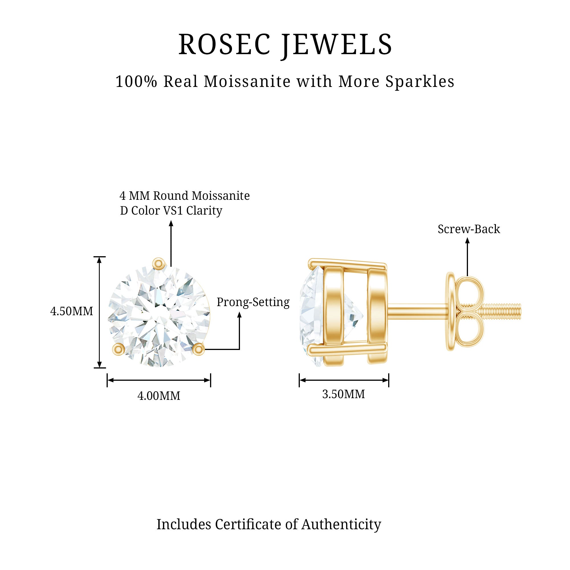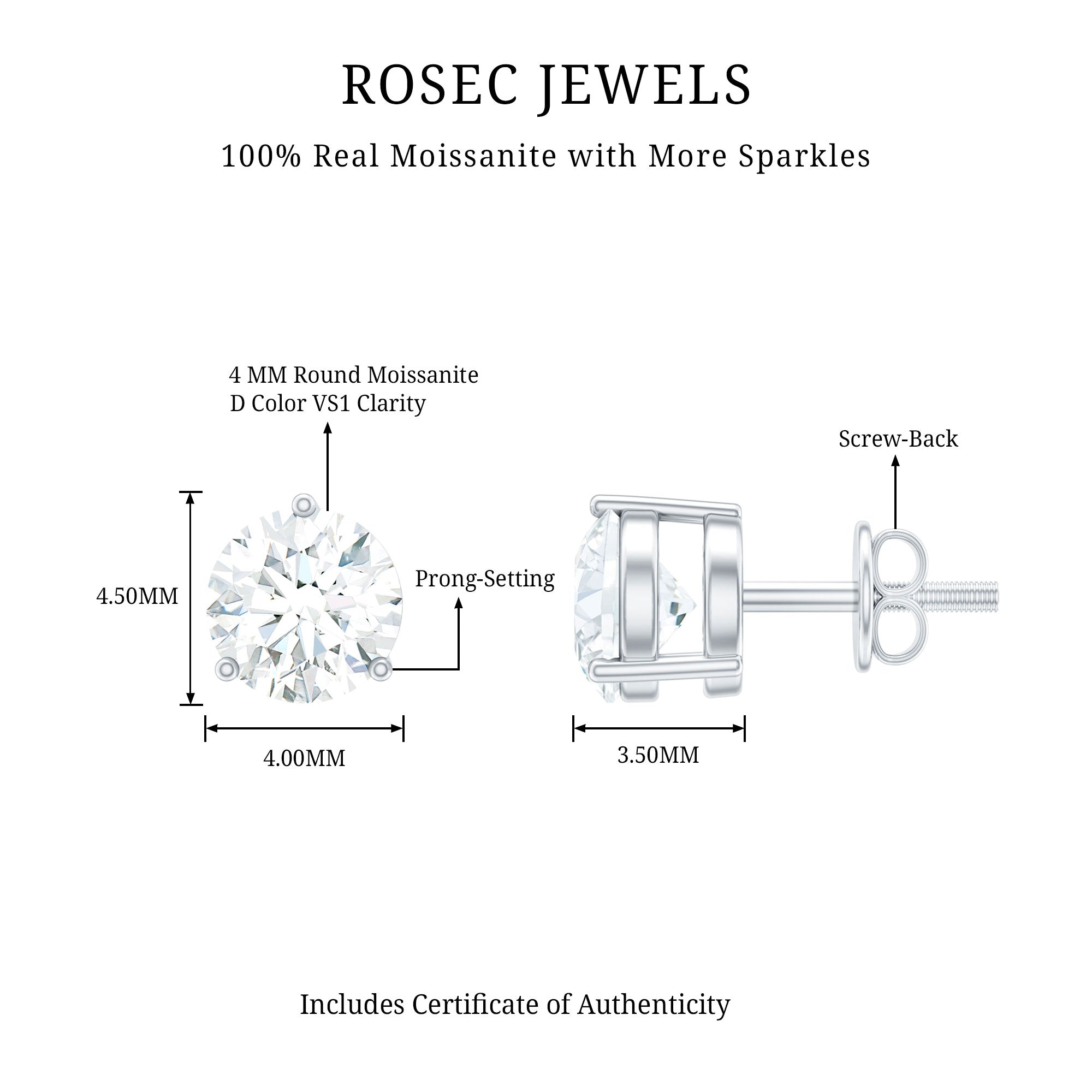 Add a touch of elegance to your everyday look with these minimalist round moissanite stud earrings. This stunning stud earring features a 4 mm round moissanite center stone with screw-back finding. The earring comes in a minimal 3-prong setting. This earring features a simple yet stunning design, with a single sparkling round moissanite. This earring is perfect for any occasion, from everyday wear to special events. They can be dressed up or down, and they are sure to add a touch of sparkle and sophistication to any outfit.