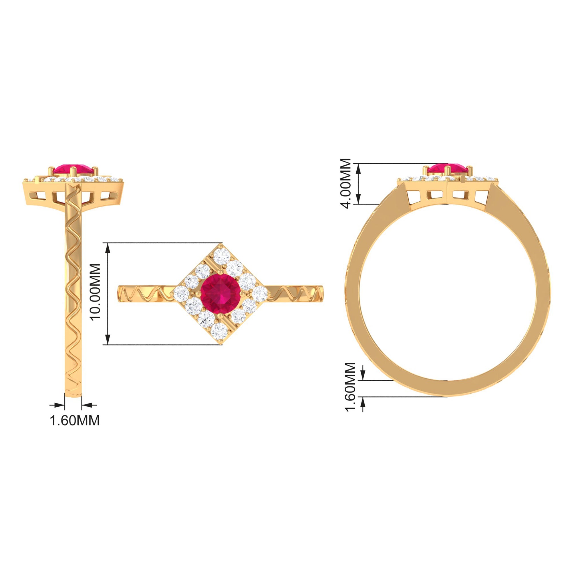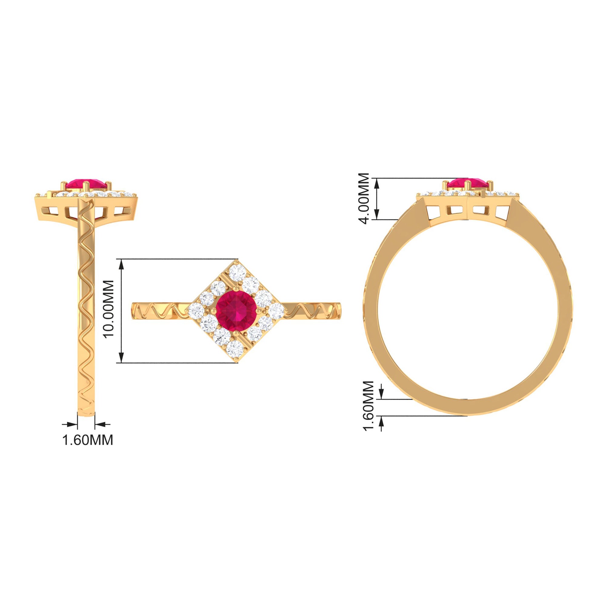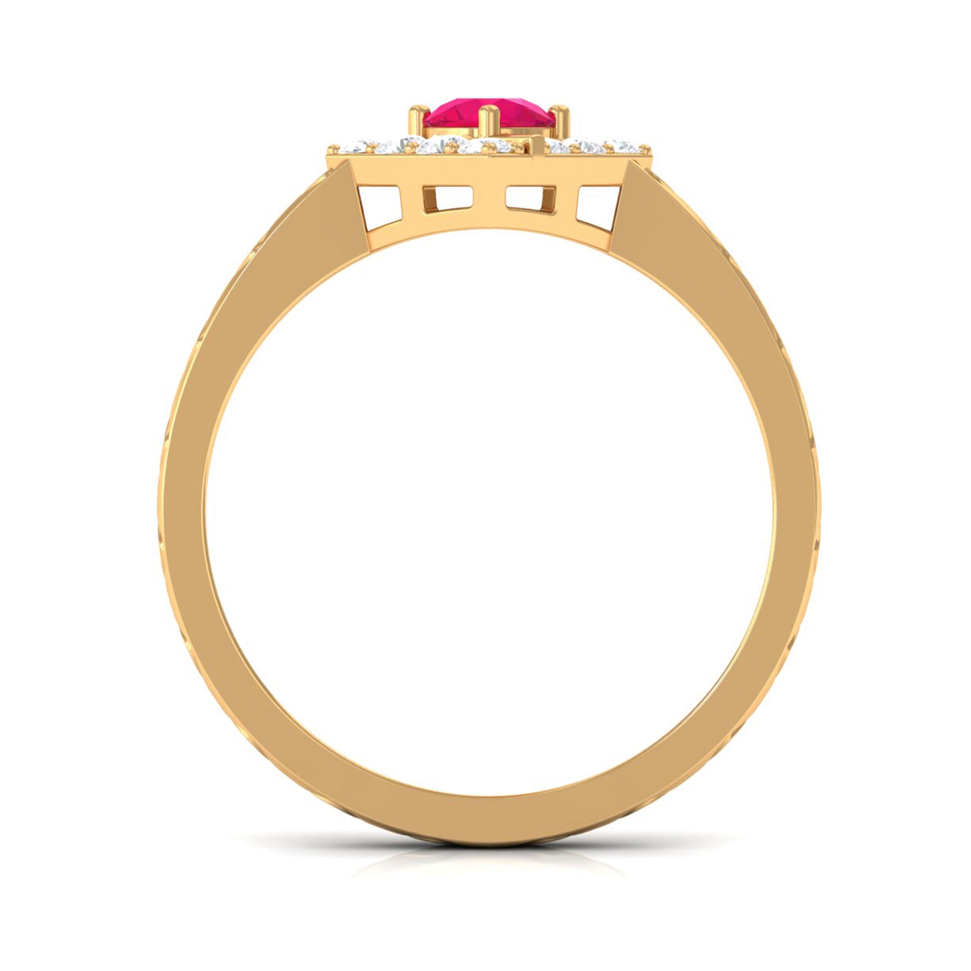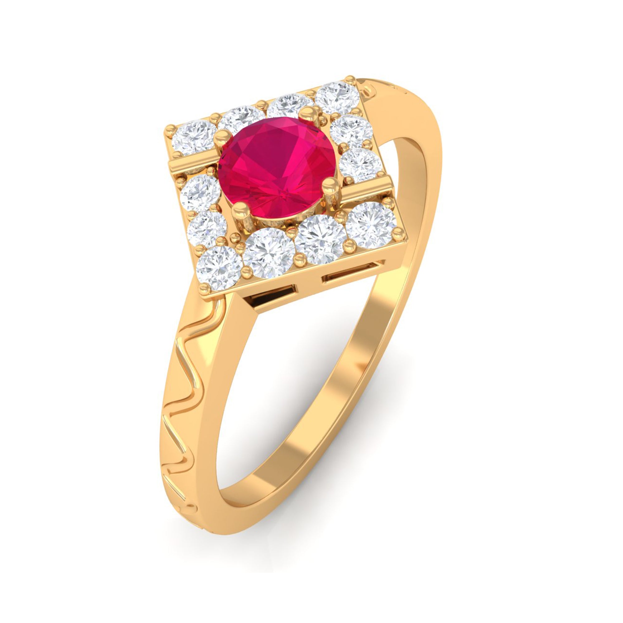 Intensify her style with this Ruby and Diamond Ring. This Promise Ring is adorned with Round Shape Ruby as Solitaire in the center with Round Diamond as halo with a textured design. This July Birthstone Ring is perfect to make her feel more special.