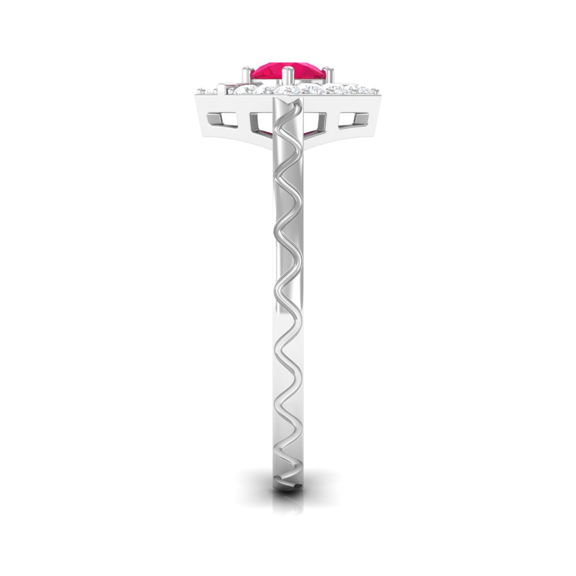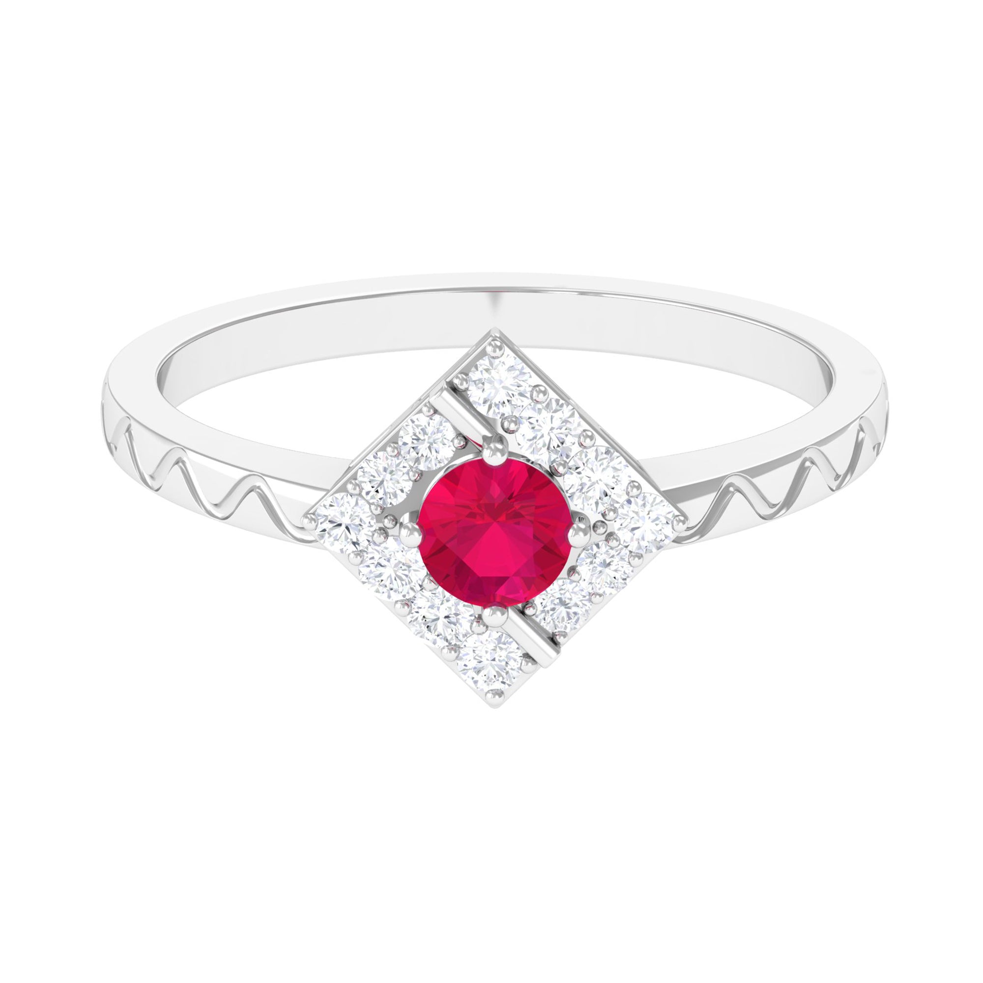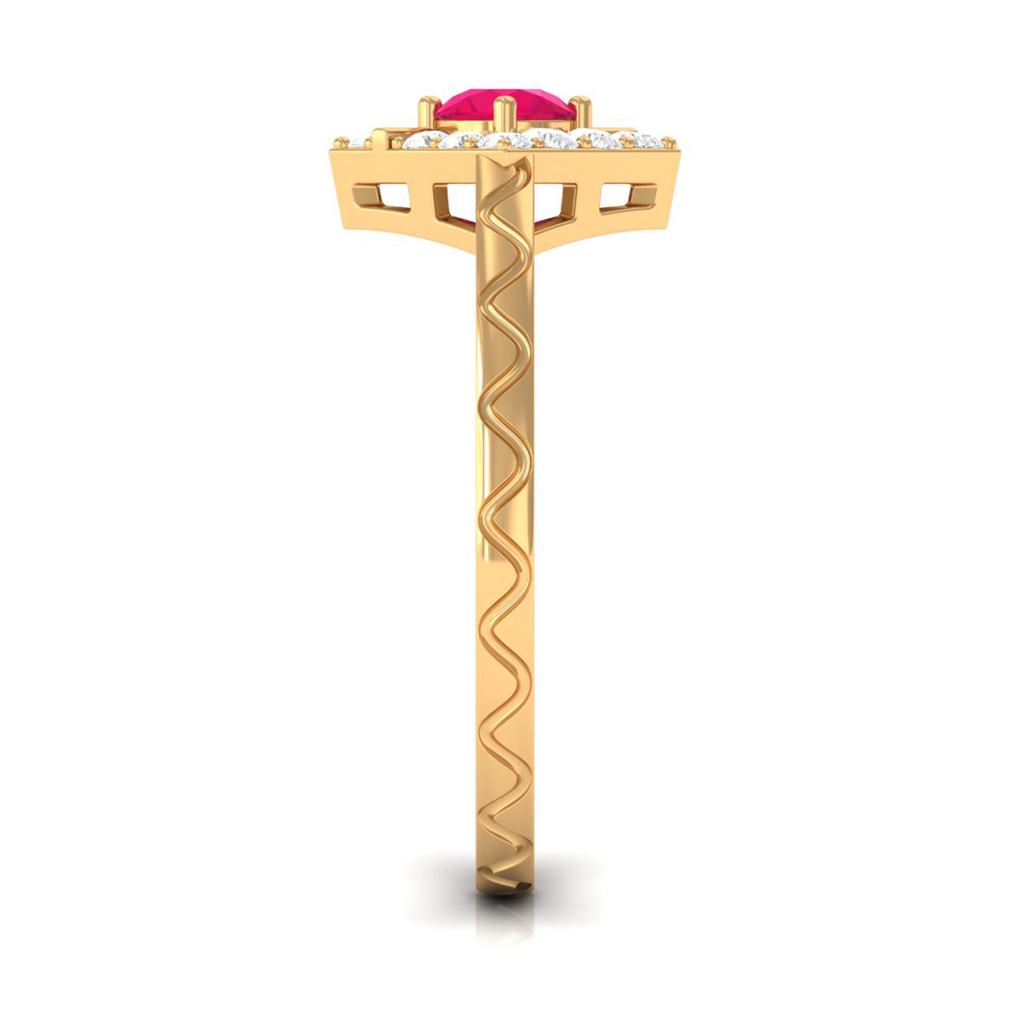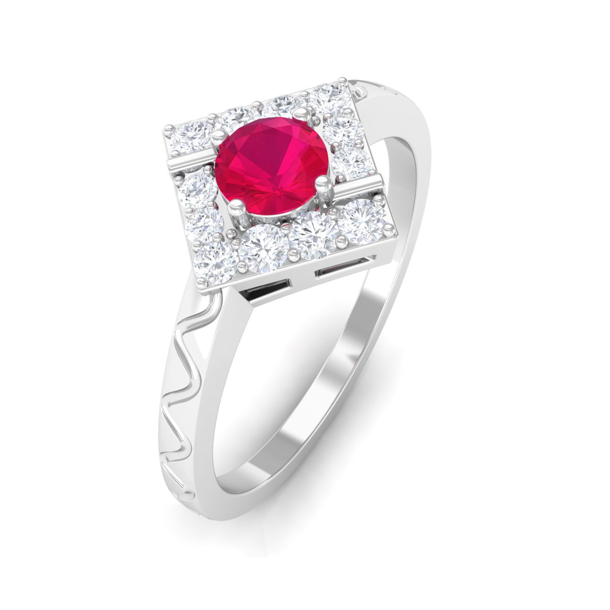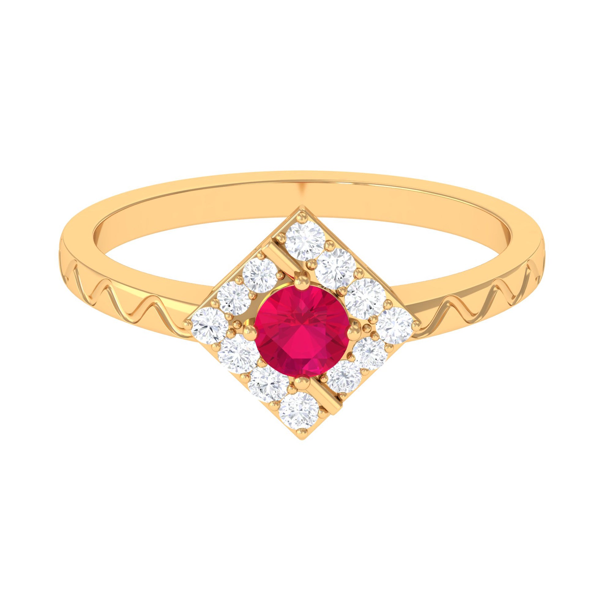 Intensify her style with this Ruby and Diamond Ring. This Promise Ring is adorned with Round Shape Ruby as Solitaire in the center with Round Diamond as halo with a textured design. This July Birthstone Ring is perfect to make her feel more special.