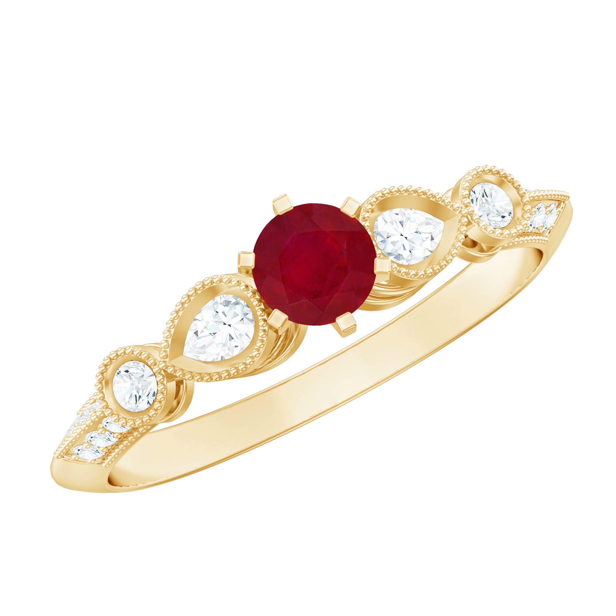 This Classic Ruby Engagement Ring combines charm with sophistication. This ring features an Round Shape Ruby set as solitaire in square prong setting with pear and Round Shape Diamond side stones. Whether it is a promise to the one you love, or a promise to remember a special moment or adventure in your own life, this Ruby and Diamond Engagement Ring is sure to bring a bit of sparkle to your forever style.