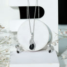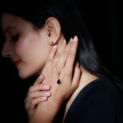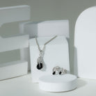Designed to bring elegance and depth to your bridal look, this Black Onyx Jewelry Set captures sophistication in every detail. Thoughtfully crafted with precision, the Black and White Jewelry Set includes a pendant necklace and matching stud earrings. The necklace showcases a stunning 8X10 MM pear shaped black onyx at the center, secured in prong setting. Enhancing the centerpiece are sparkling round moissanite stones arranged along a graceful leaf motif, giving the design a natural yet stylish appeal. Suspended from a standard bail, the Leaf Necklace rests perfectly on a durable cable chain, sitting elegantly on the neckline. Complementing the necklace are matching leaf shaped stud earrings, each adorned with delicate moissanite stones and a 3X5 MM black onyx that enhances their dark beauty. The earrings feature screw-back closures, ensuring comfort and security for all-day wear. The combination of AAA quality black onyx and D-VS1 quality moissanite offers a striking contrast, the deep black tones paired with bright sparkle create a captivating effect that stands out effortlessly. Whether worn together for a coordinated look or separately for subtle elegance, this Black Onyx Necklace and Earrings adds charm and sophistication to any special occasion.