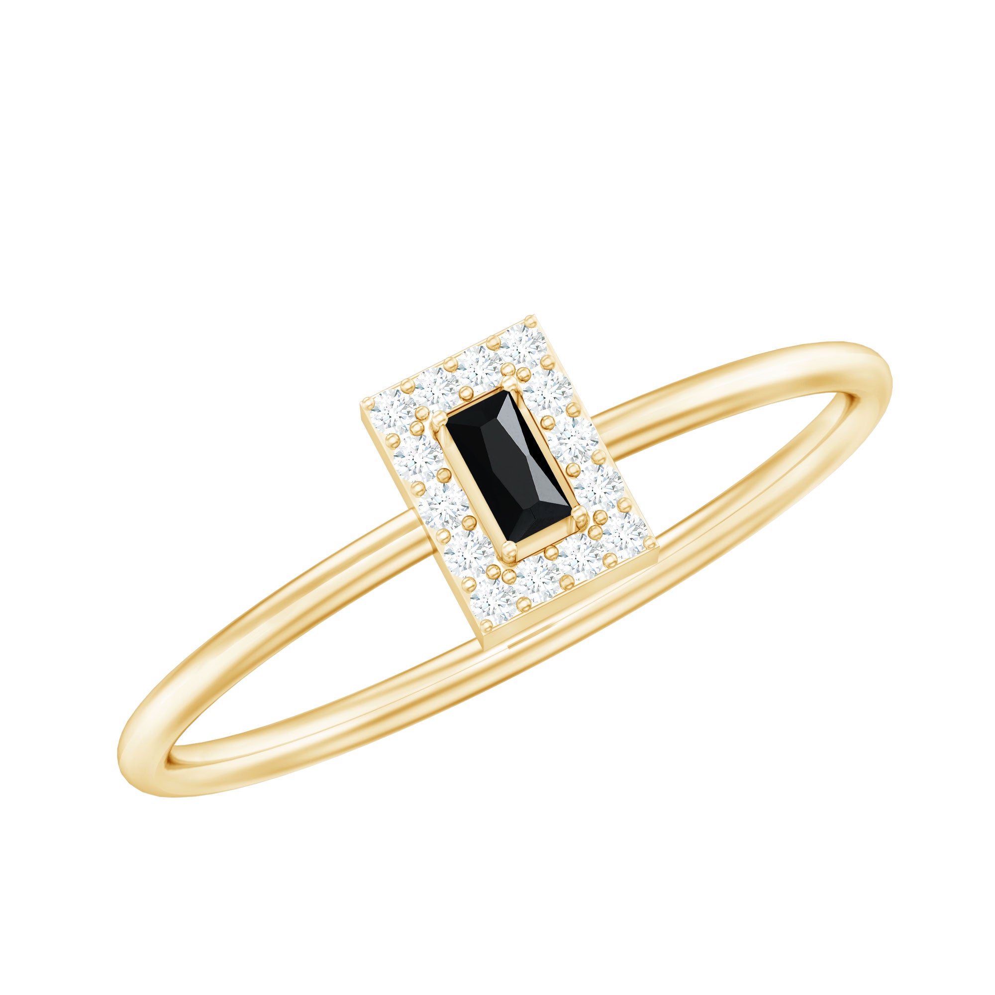 Designed to honor a heartfelt promise, this Black Onyx Promise Ring captures the meaning of loyalty, love, and connection in a refined and elegant way. At the center sits a baguette cut black onyx, securely held in prong setting. Framing the onyx is a delicate halo of round diamonds, carefully placed to add a soft, radiant glow. The contrast between the dark center and the sparkling white stones creates a classic look with modern charm. Whether you are marking a promise, celebrating a personal milestone, or simply looking for a ring with deeper meaning, this design speaks with quiet elegance. The minimalist profile makes this Dainty Promise Ring for Her easy to wear alone or pair with other pieces, while its thoughtful design ensures it stands out in its own subtle way. Made with AAA quality black onyx and HI-SI quality diamonds, every element is crafted with care and precision. Available in a wide range of sizes, this Onyx and Diamond Ring is easy to find just the right fit. The Baguette Cut Ring comes packaged in a beautiful jewelry box and includes a gemstone certificate for added peace of mind. Stylish and symbolic, this Halo Ring is a lasting reminder of a bond built on trust, love, and shared moments, perfect for gifting or keeping close to your heart.
