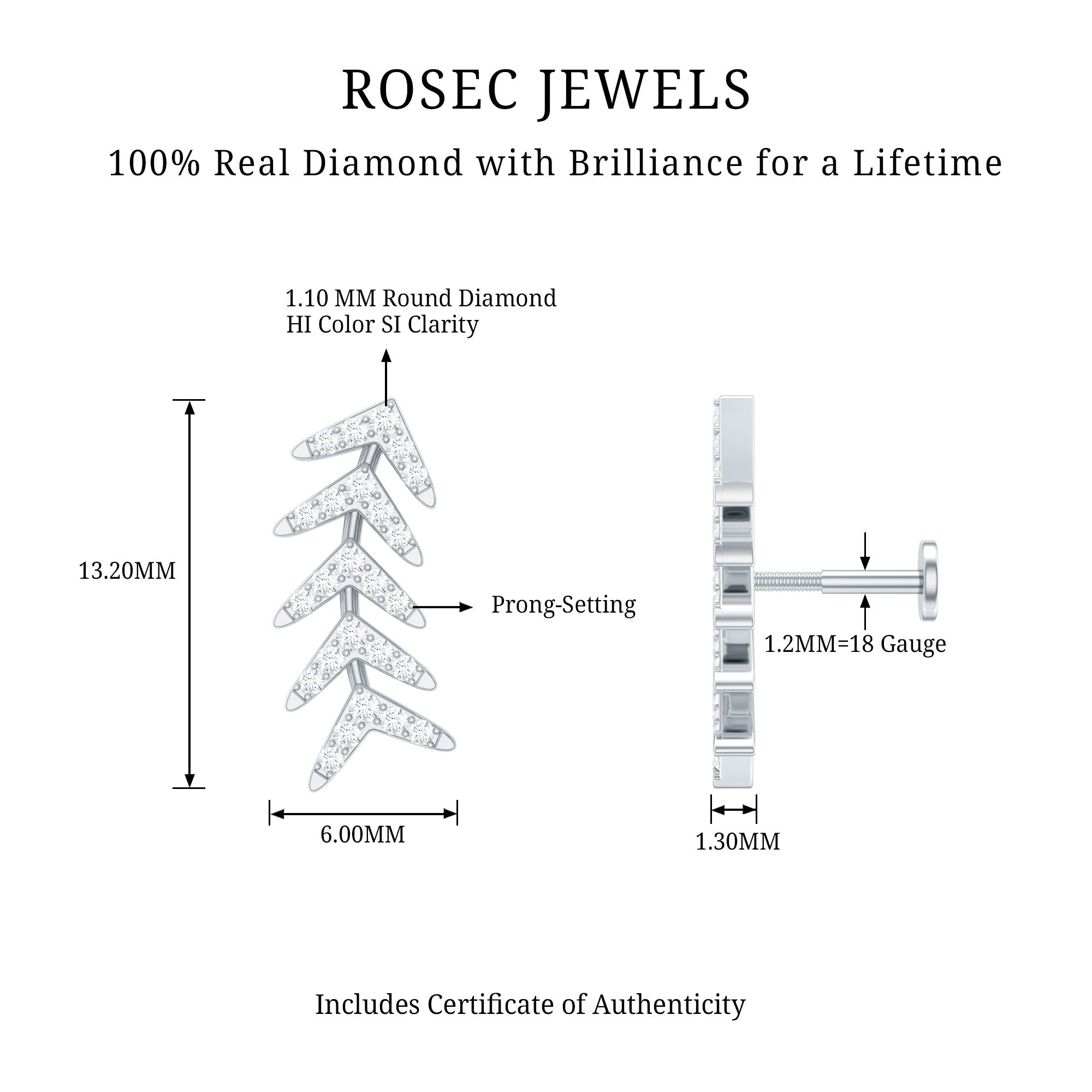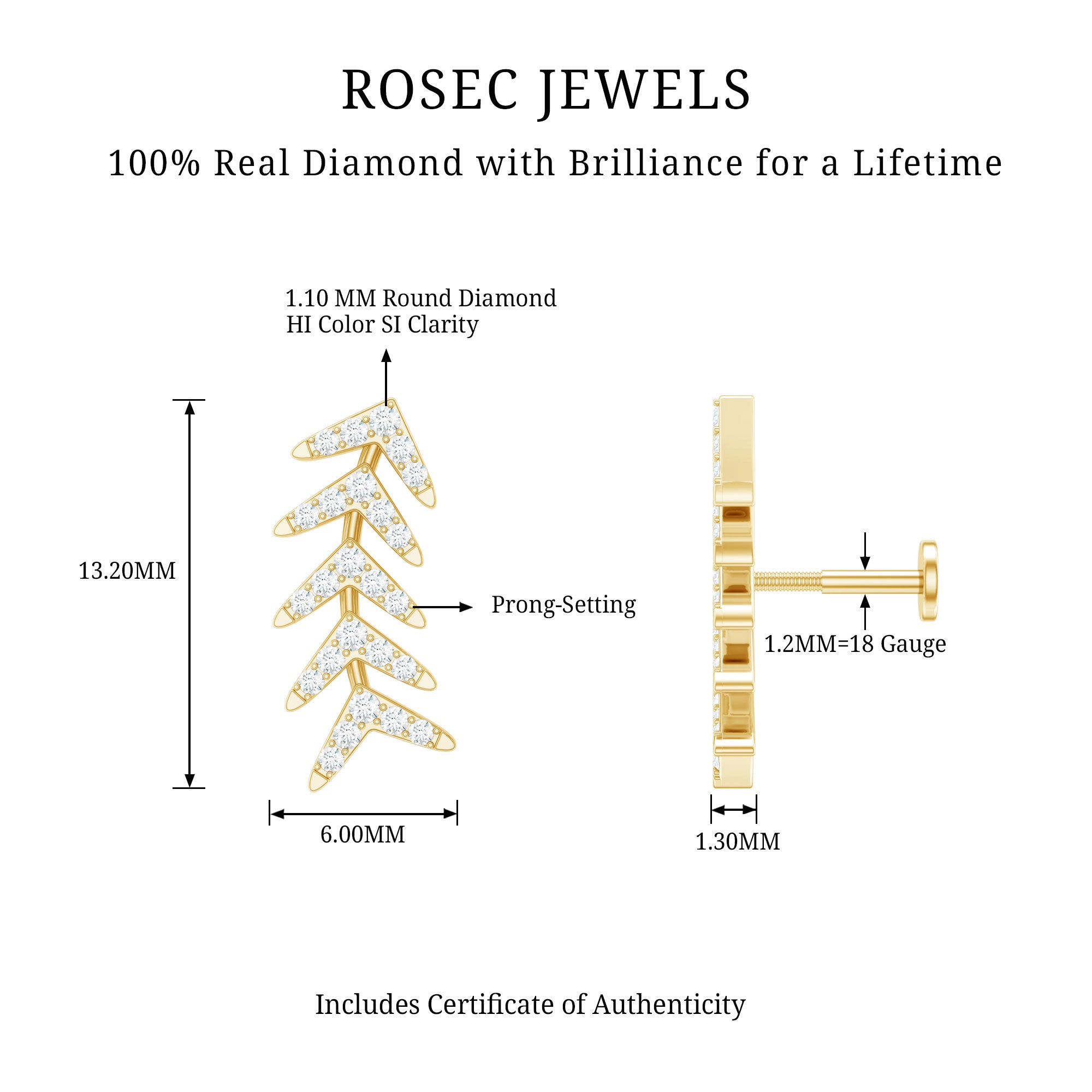 So lovely, this Diamond Leaf Crawler Earring gives a chic look. With its subtle charm, this Minimalist Earring features intricate details that will make you fall in love with its elegant design. Crafted in solid metal, this single earring features dainty round diamonds in prong setting on a leaf shape . This Unique Diamond Earring features a flat back closure that will surely give a perfect fit on your helix, cartilage, or upper lobe piercings. Ideal for an everyday look! All the diamonds in this earpiece are certified and are going through a quality check. Whether youre going out with friends or on a brunch date, you can wear this Diamond Ear Crawler to make everyone a fan of your piercing jewelry. This Diamond Leaf Earring exudes classic glam, adding a touch of bling to your style. Perfect for gifting, this helix earring is a thoughtful choice for birthdays, anniversaries, graduations, or as a bridesmaid gift. Its overall appearance is simple yet elegant, truly a visual delight.