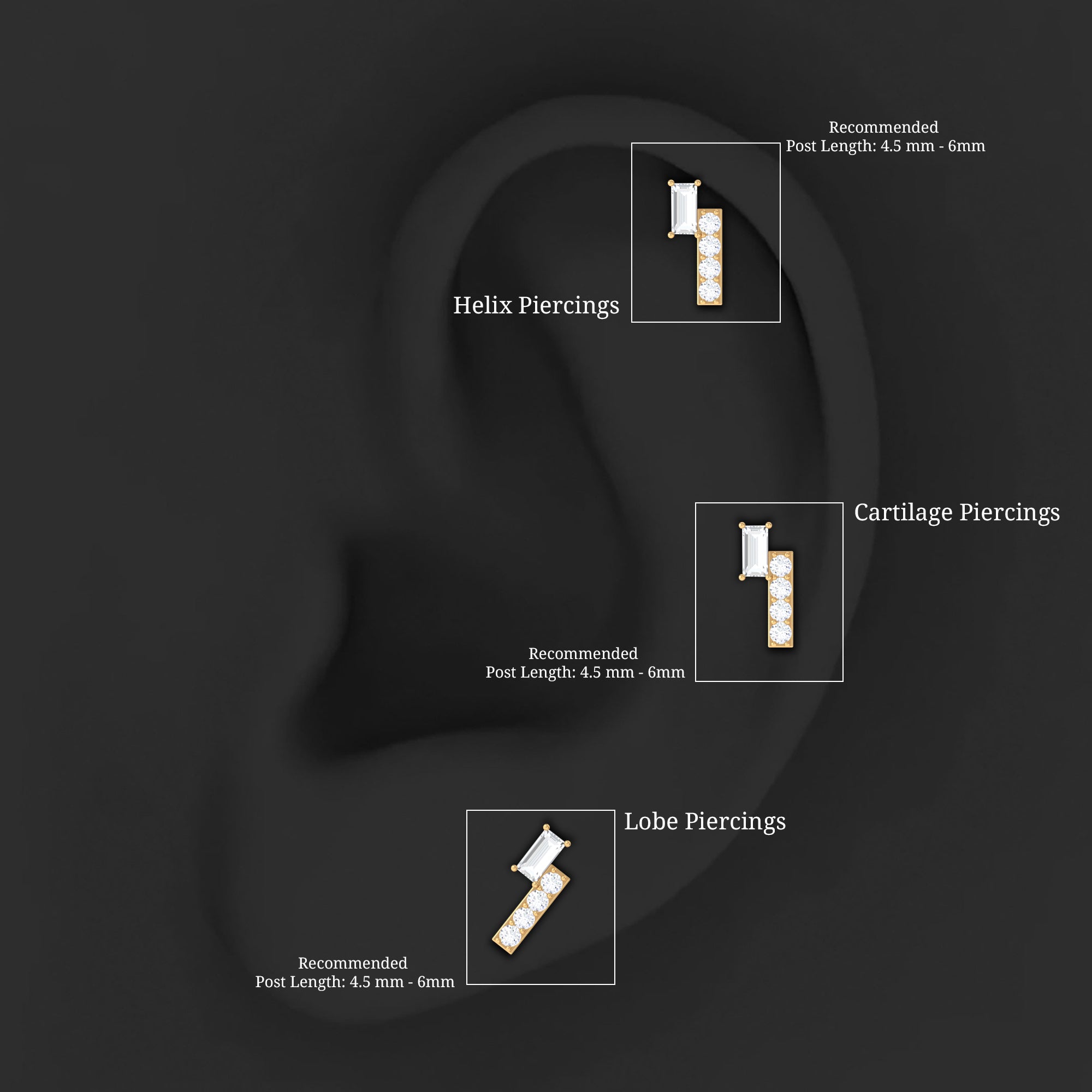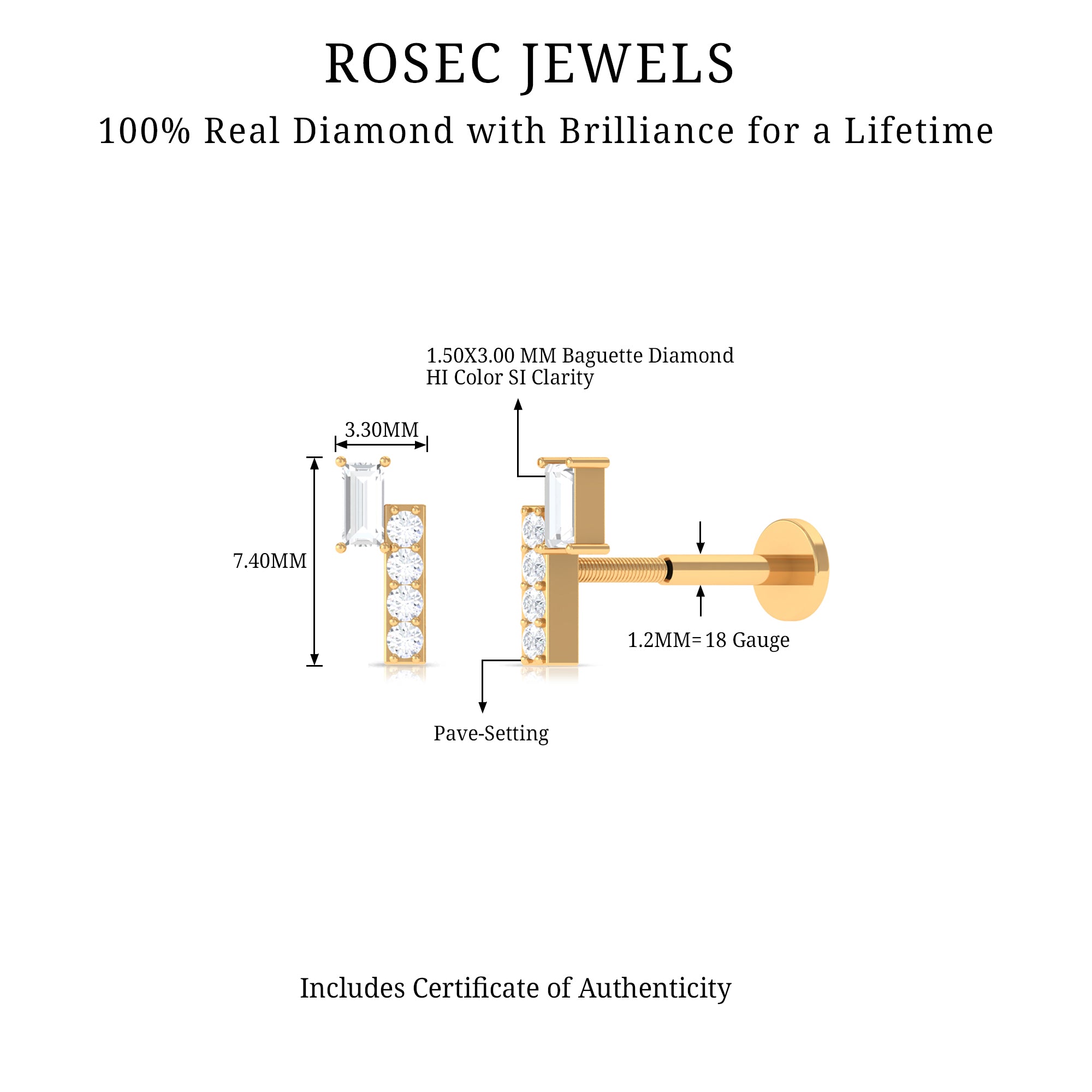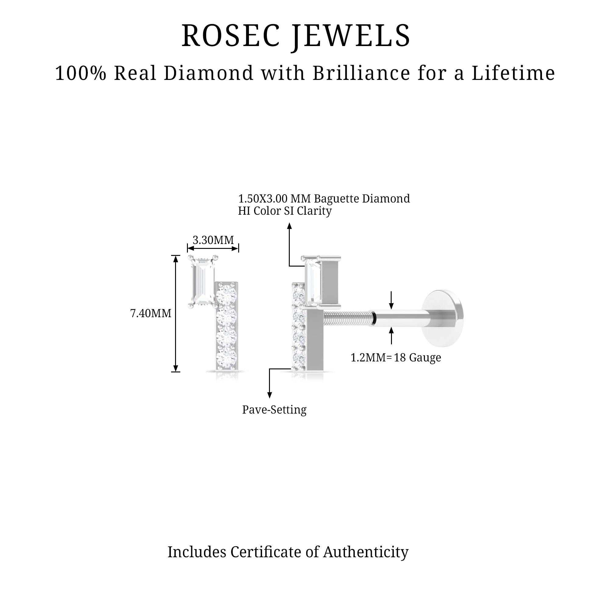 Carry the beauty of minimal charm wherever you go with this exquisite Diamond Helix Earring, the epitome of elegance and style. The earring features genuine baguette shape diamond while dainty round diamonds studded on bar motif, exuding natural beauty, reminiscent of the elegance. The dainty Diamonds encrusted in a bar design, delicately enhance the radiance, adding a touch of sparkle and luxury. This stunning Baguette Diamond Earring is ideal for Helix, Cartilage, Tragus, or Upper lobe Piercings, it allows you to showcase your individuality. A heartfelt gesture to gift, that symbolizes love and elegance. The sleek flat back closure ensures a comfortable and secure fit, making it ideal for daily wear or special occasions. Whether worn alone as a statement piece or paired with other earrings, this Bar Earring adds a refined touch to any style. Each diamond is carefully selected for its HI color and SI clarity, giving the piece a radiant glow that enhances your natural elegance.