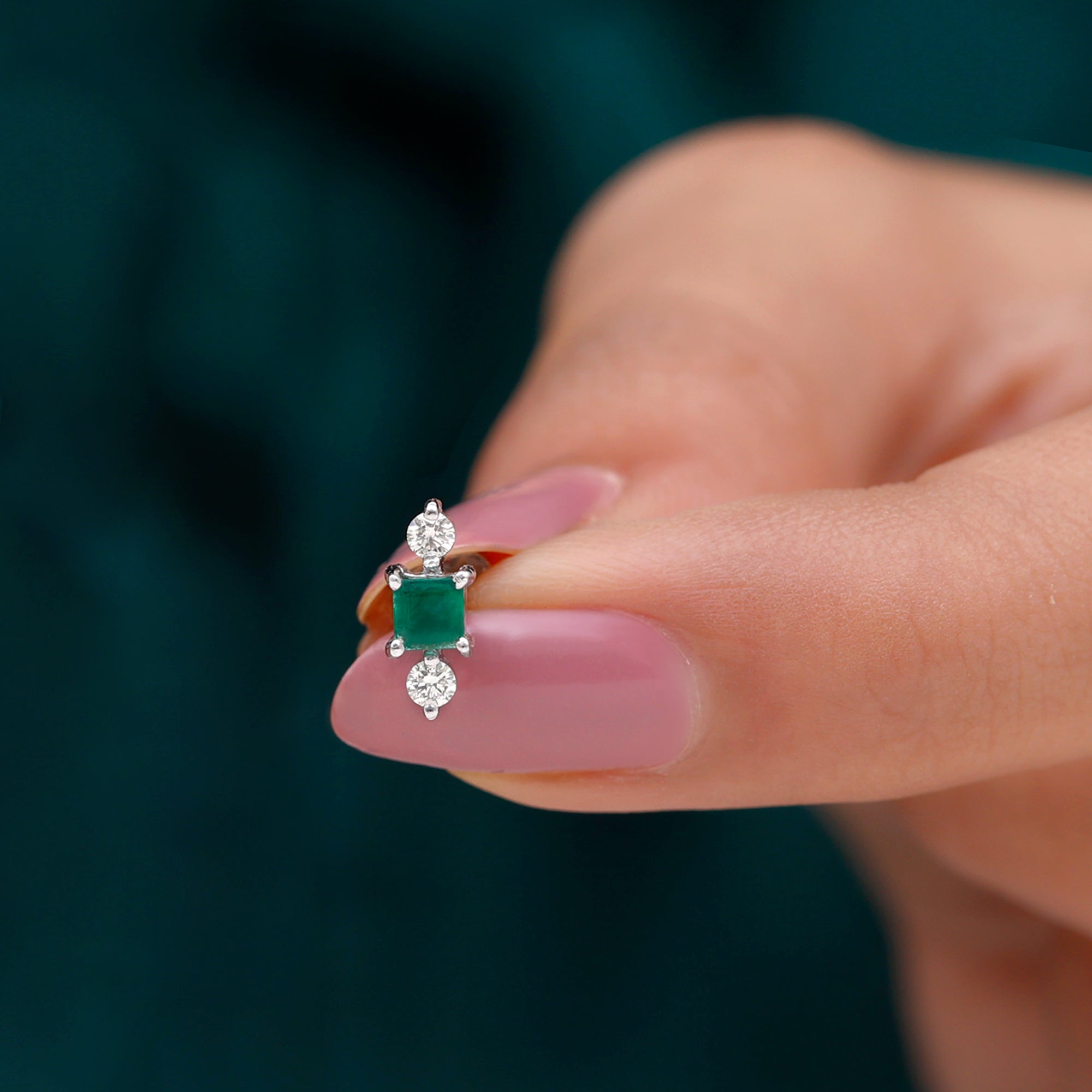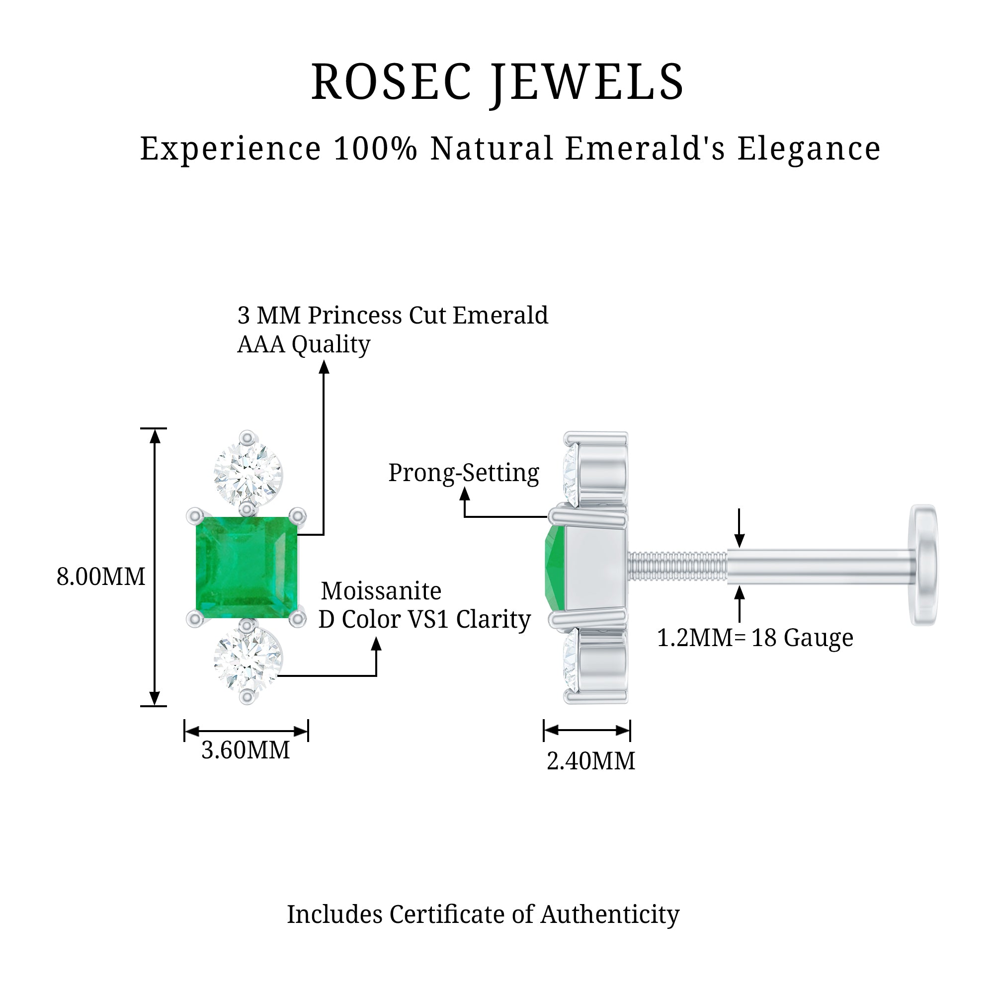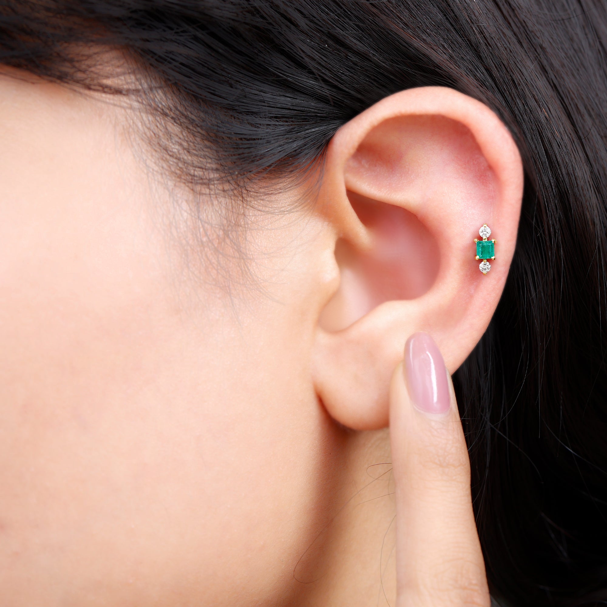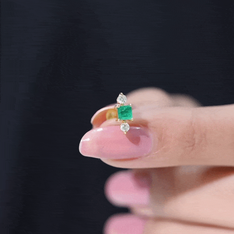 This Minimal Emerald and Moissanite Helix Earring is embellished with Princess Cut Emerald and Round Cut Moissanites secured in Prong Setting. Whether youre looking to make a statement or simply want to add some understated glam to your look, this Emerald Earring is the perfect choice for you.
