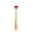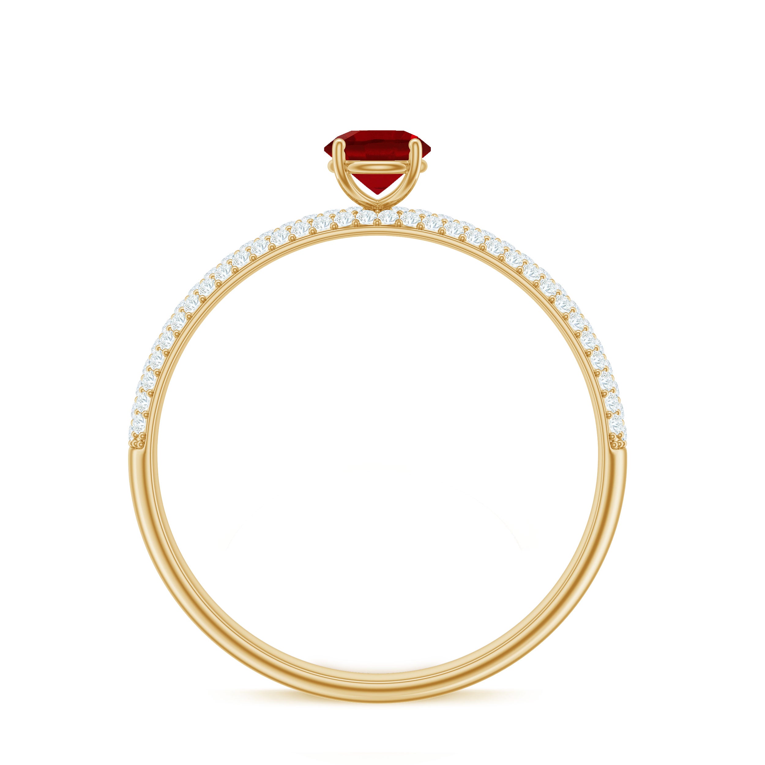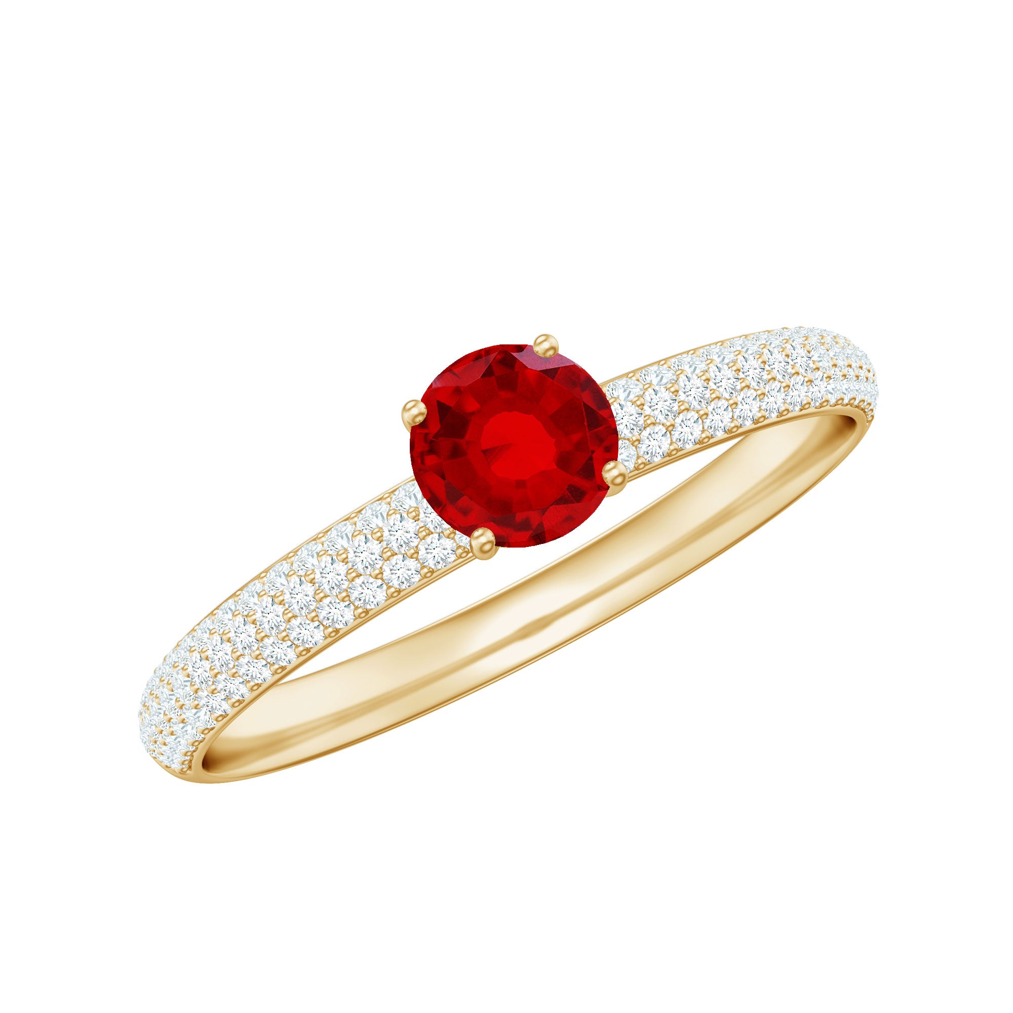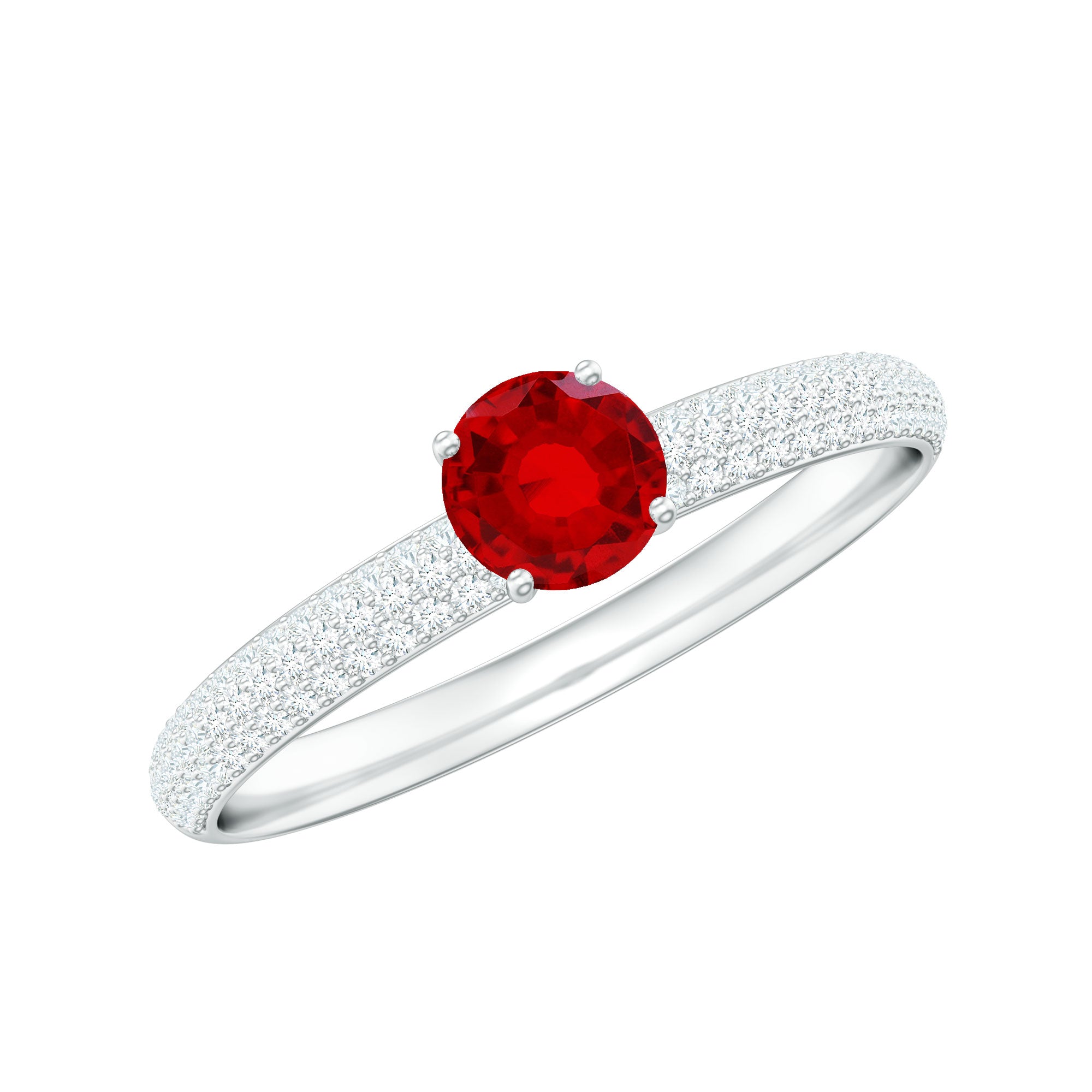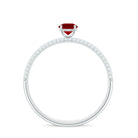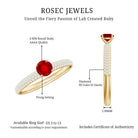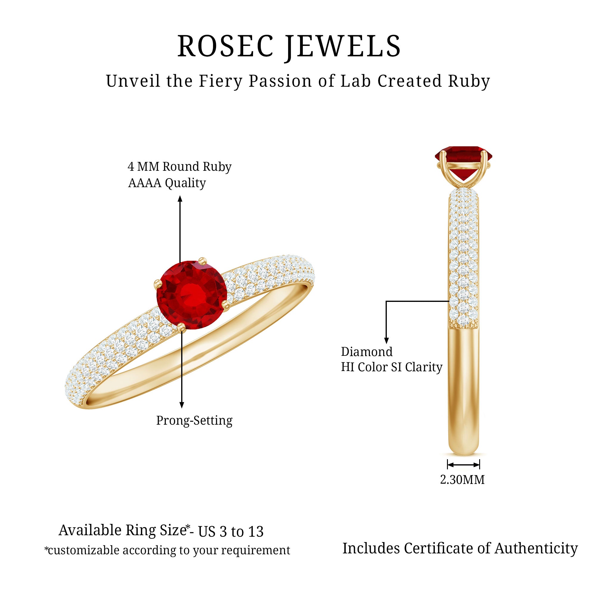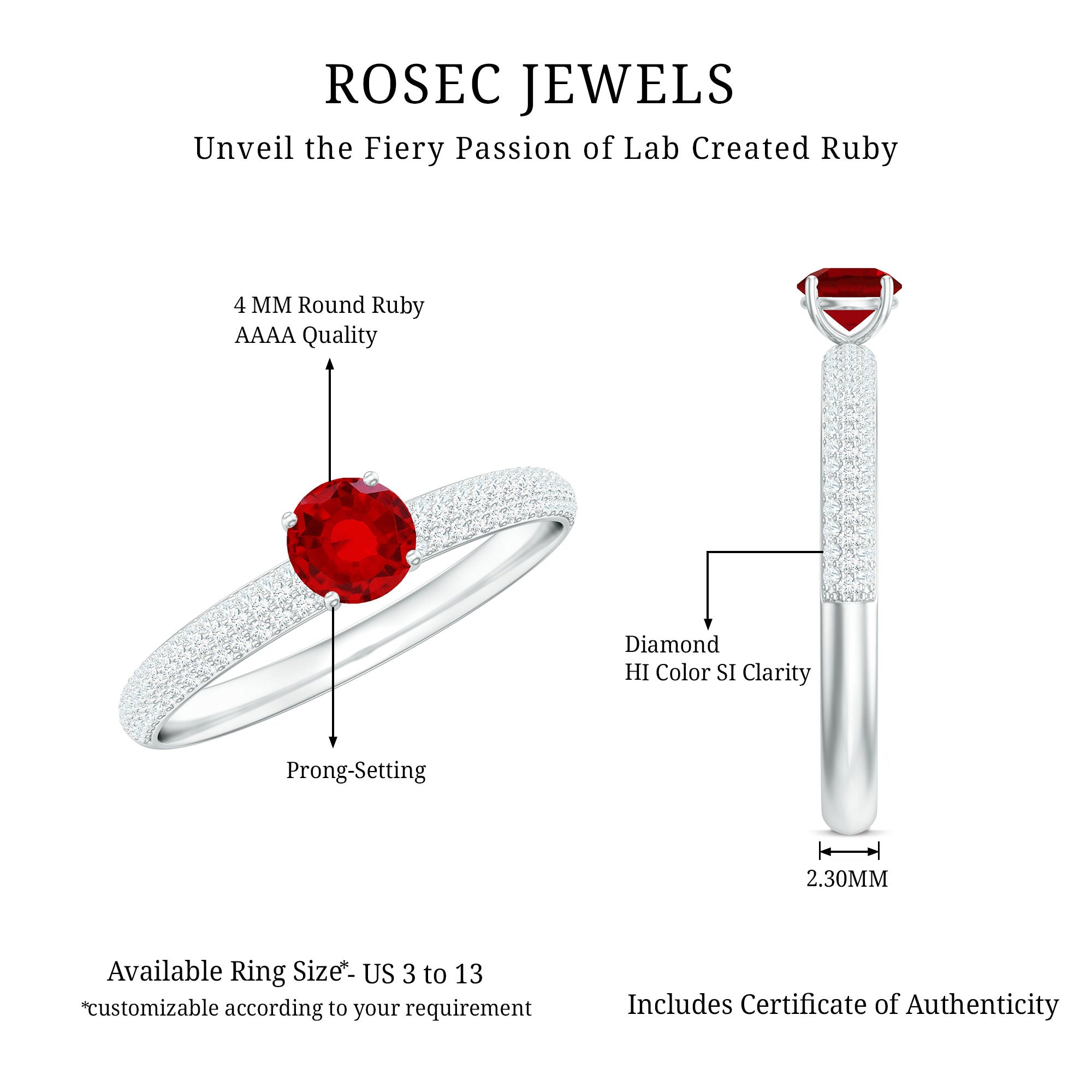 Experience the timeless symbol of love and commitment with this classic Lab Grown Ruby Engagement Ring. Designed for elegance and simplicity, this Minimalist Ring blends sparkling stones with high quality metal to create a look that has truly stood the test of time. It is curated with a 4 MM round shaped lab grown ruby that shines brightly, perfectly set in a secure prong setting to ensure durability and proper placement. Flanking the center stone are pave set diamond side stones, adding extra sparkle and enhancing the unique charm of this Side Stone Engagement Ring. This Ruby and Diamond Ring is more than just a piece of jewelry, it is a promise of a lifetime of happiness, hope, and enduring love. From the first glance to forever promises, it inspires you to shine and love with all your heart. This Red Ruby Ring comes with a quality guarantee certificate and is elegantly wrapped in a protective box, making it perfect for gifting or keeping safe when not worn. Give her this Lab Created Ruby Ring and start a journey filled with sparkle, devotion, and memories to treasure forever.